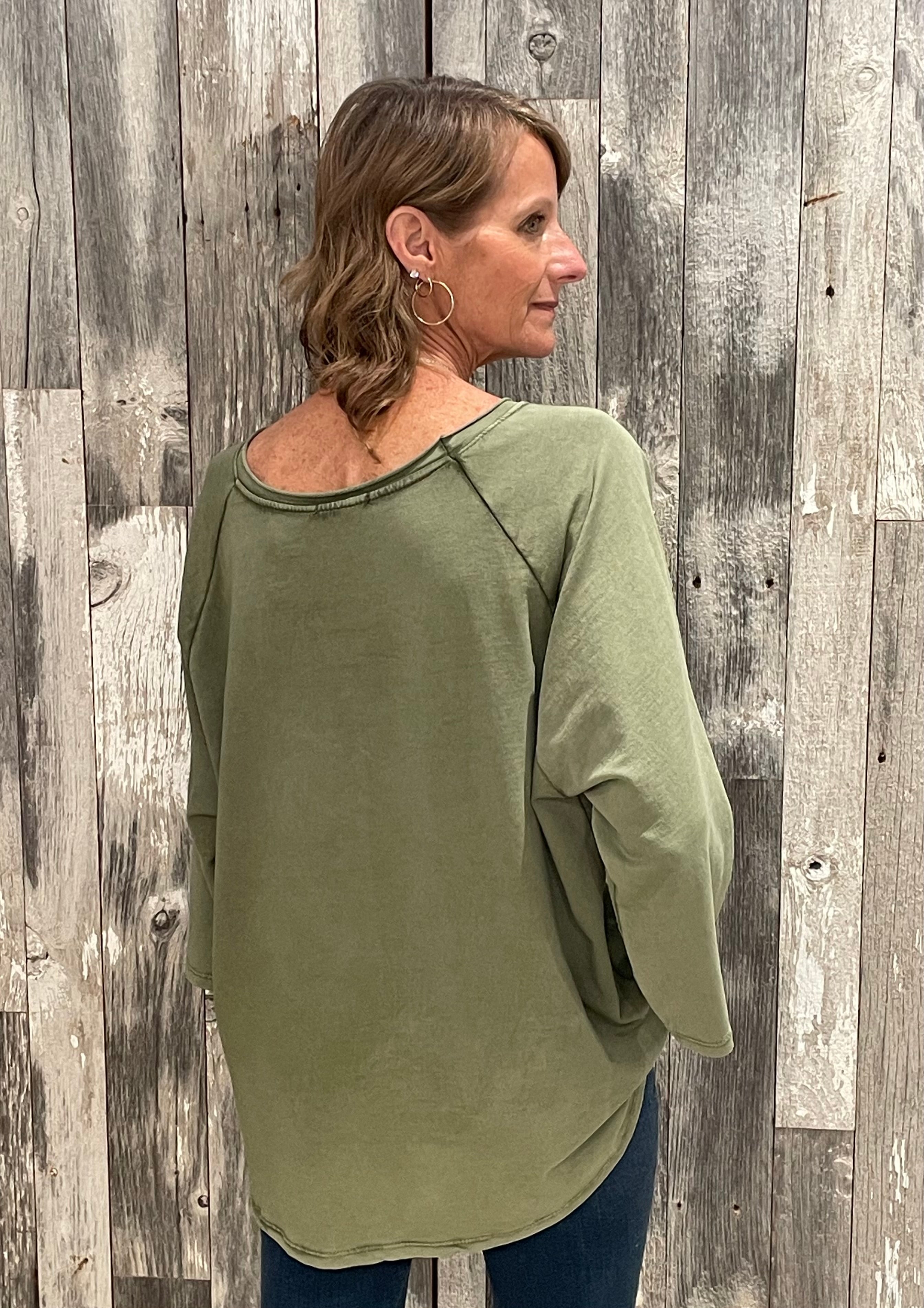 Sleeves: 3/4 length raglan sleeves with loose, comfortable fit