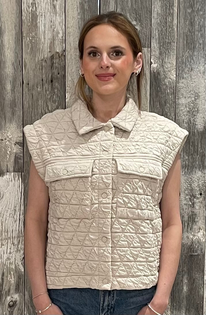 The Quilted Half-Diamond Snap Vest brings structure and edge to any outfit with its crisp point collar, utility-inspired flap pockets, and bold diamond-pattern quilting. Slightly padded shoulders give it a bit of oomph, while the snap front keeps it easy to layer over anything from tees to dresses. A not-so-basic basic for all your transitional styling needs.