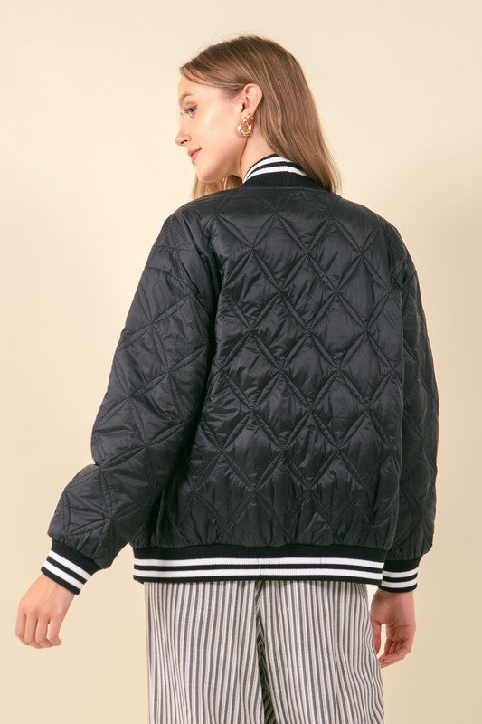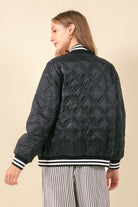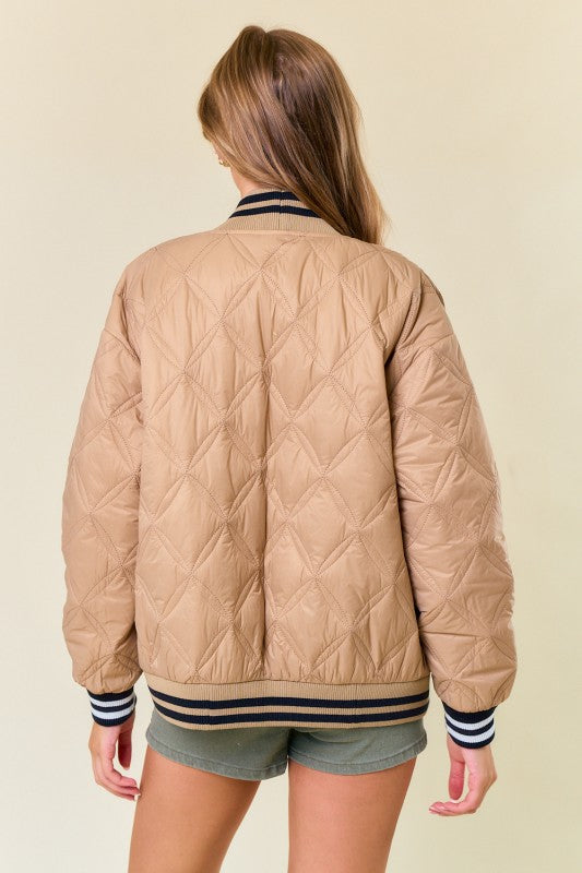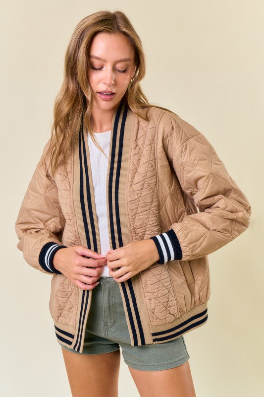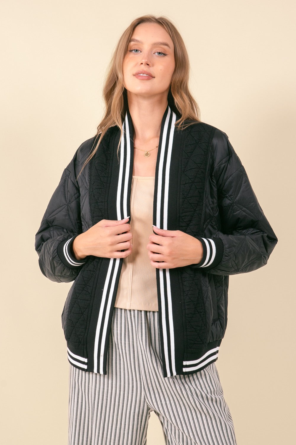 • Sporty Ribbed Trim: Features striped ribbed edges along the collar, cuffs, and hem for a modern, athletic-inspired look.
