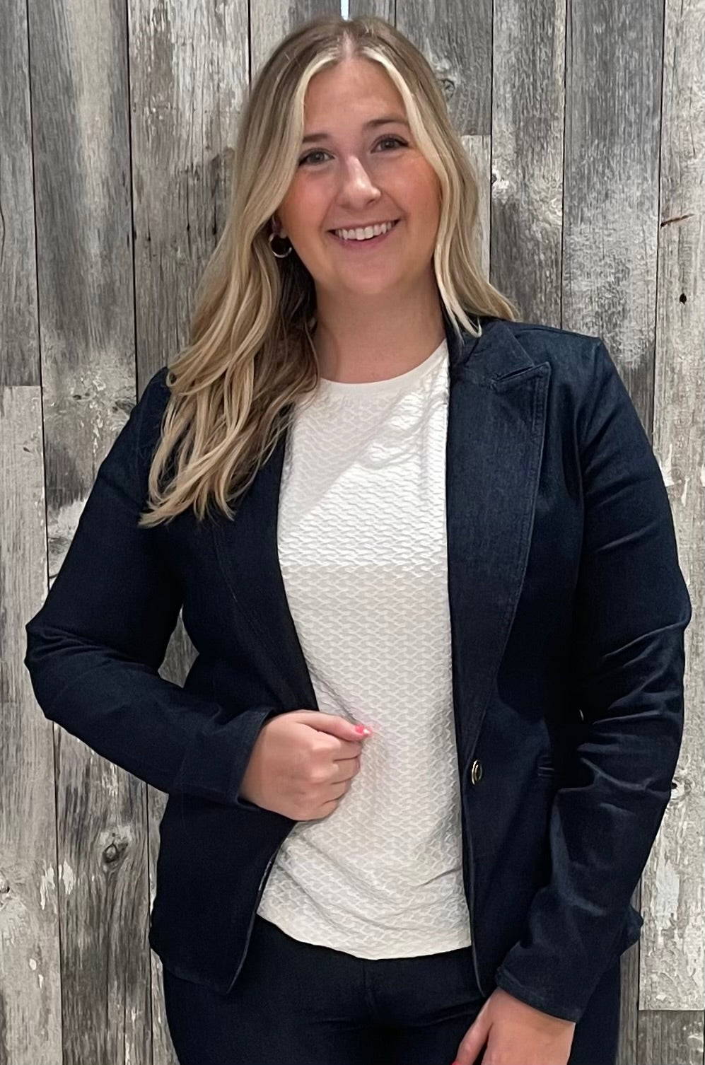 - Classic Blazer Design: Features a notched lapel, single-breasted button closure, and front flap pockets.