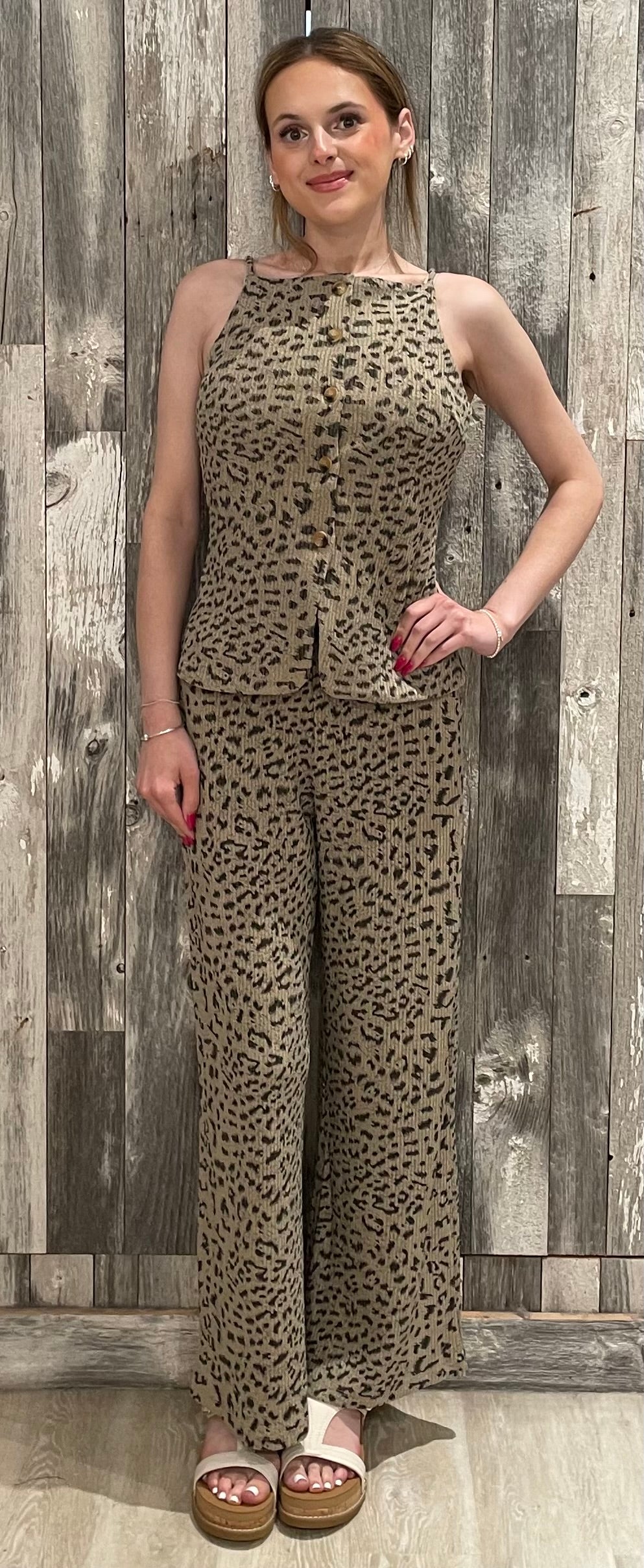 The Ribbed Leopard Print Knit Pants bring the drama of leopard print in a soft, stretchy ribbed knit that moves with you. Designed with a flattering pull-on waistband and handy side pockets, these full-length pants make a statement without sacrificing comfort. Pair them with the matching halter top for a bold head-to-toe look, or dress them down with a simple tee.