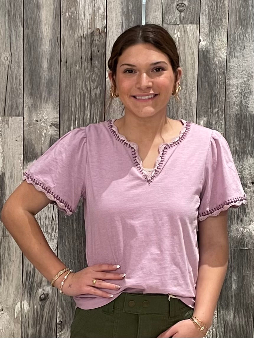 • Neckline: V-neck with scallop crochet trim for a refined finish