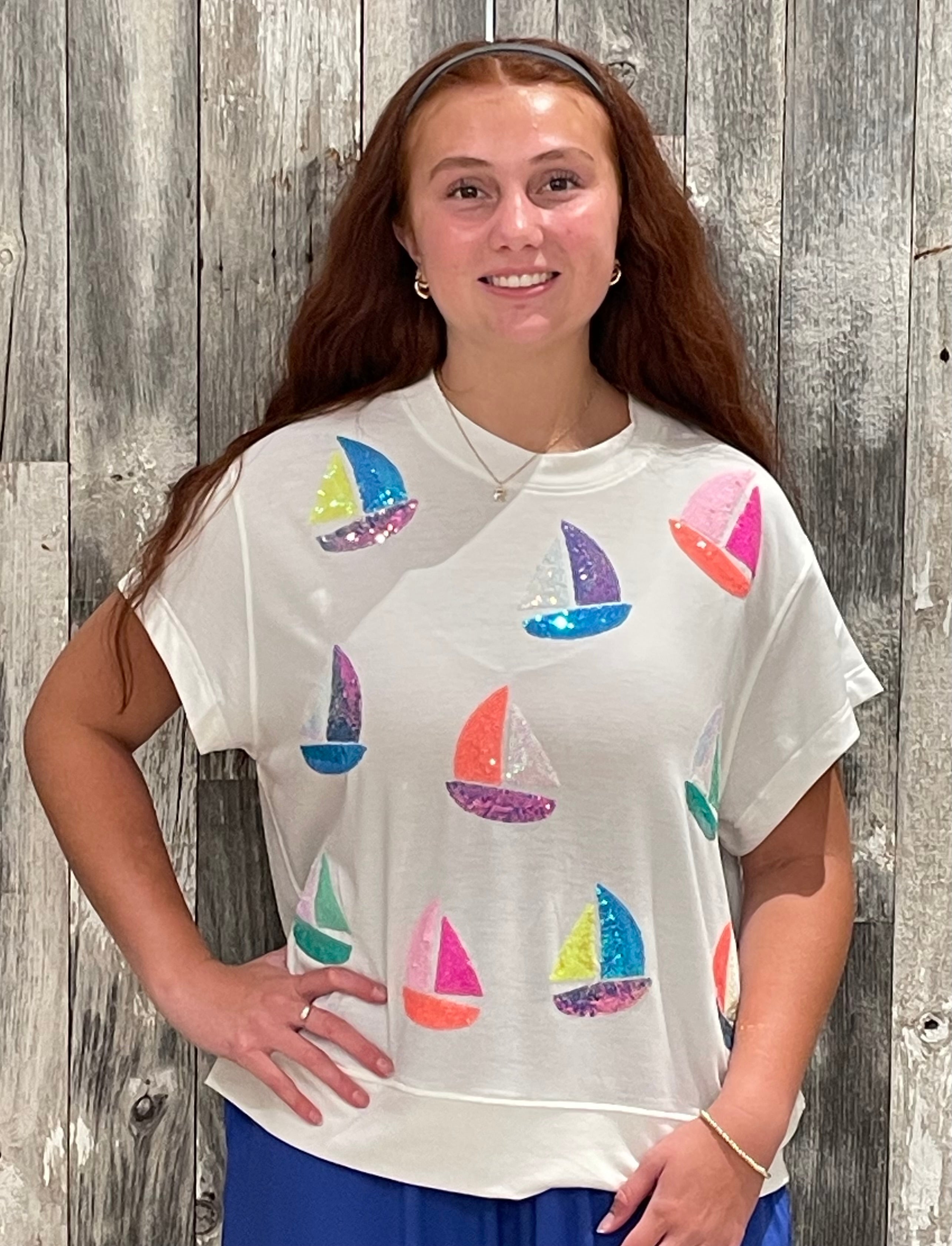 Playful matching lounge set featuring a cream base with colorful sailboat prints