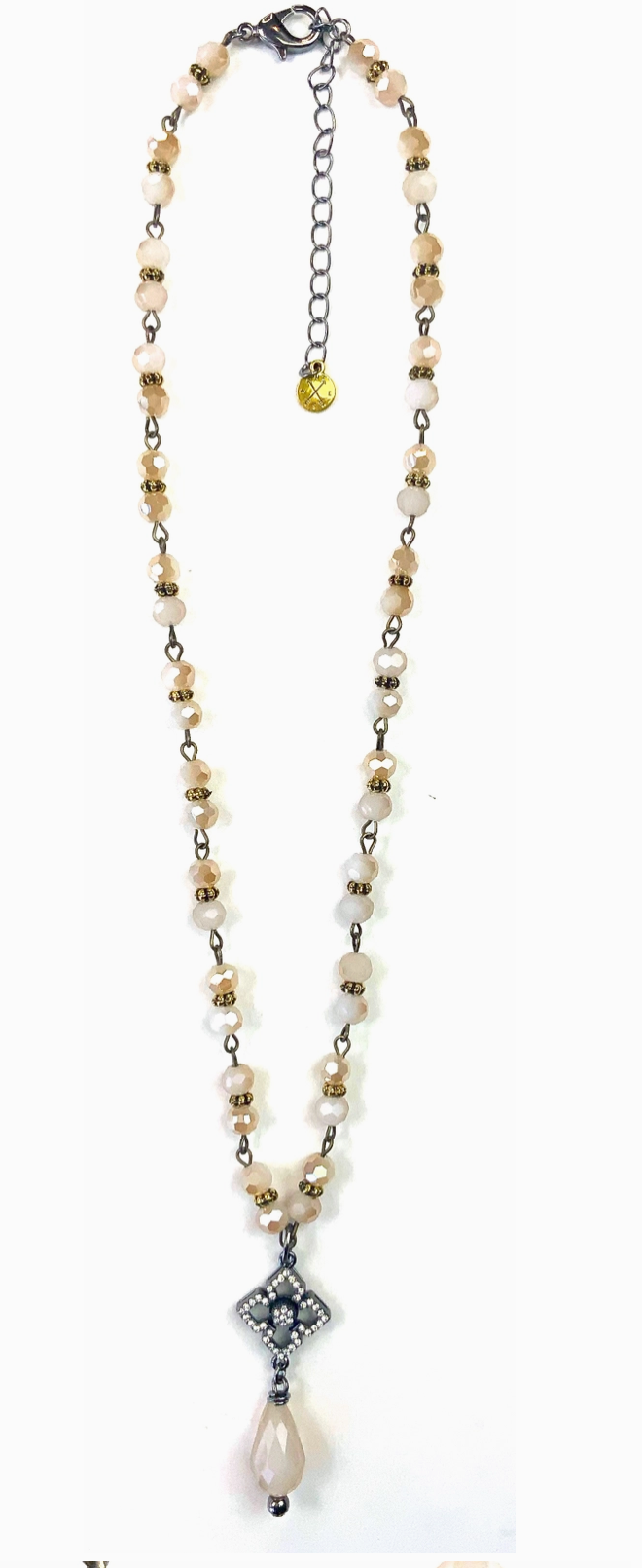 - Design: Short rosary-style chain adorned with a pavé-accented drop pendant for a touch of elegance