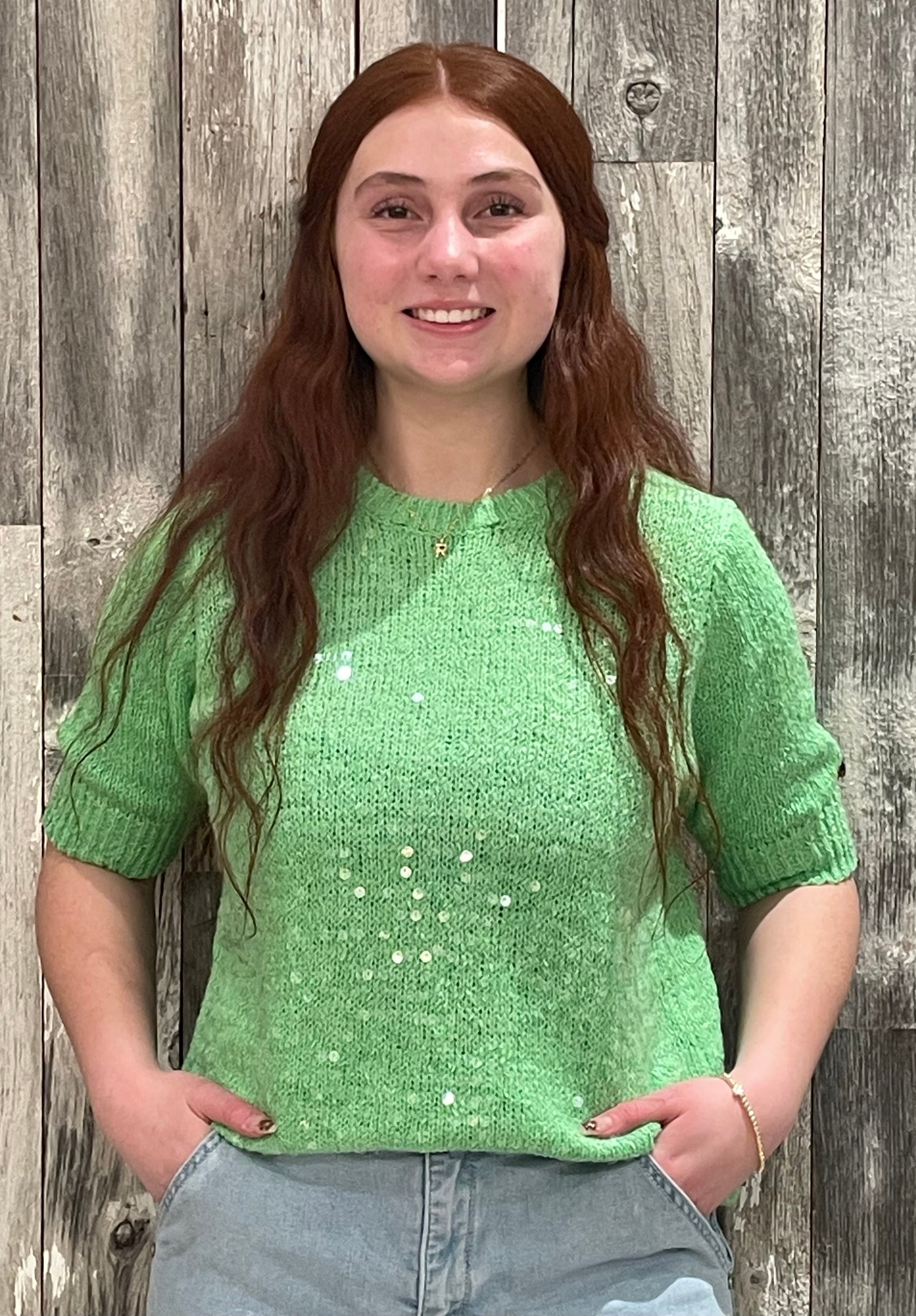 The Short Sleeve Sweater with Tonal Sequins is the perfect blend of cozy comfort and understated glamour. Featuring delicate tonal sequins, this sweater catches the light beautifully while maintaining a soft, effortless feel. With a classic short-sleeve silhouette, it's ideal for layering or wearing on its own for a chic, polished look.
