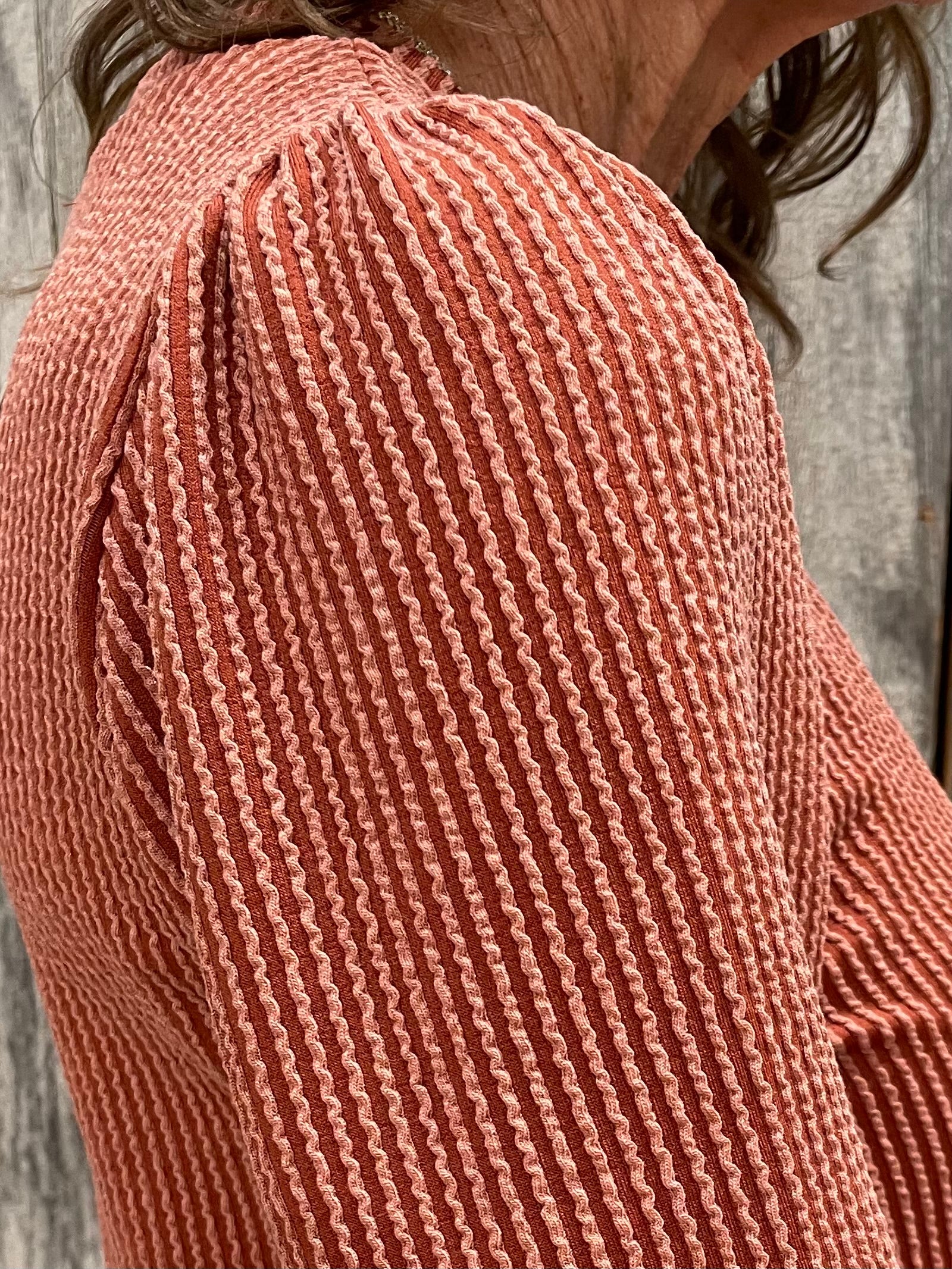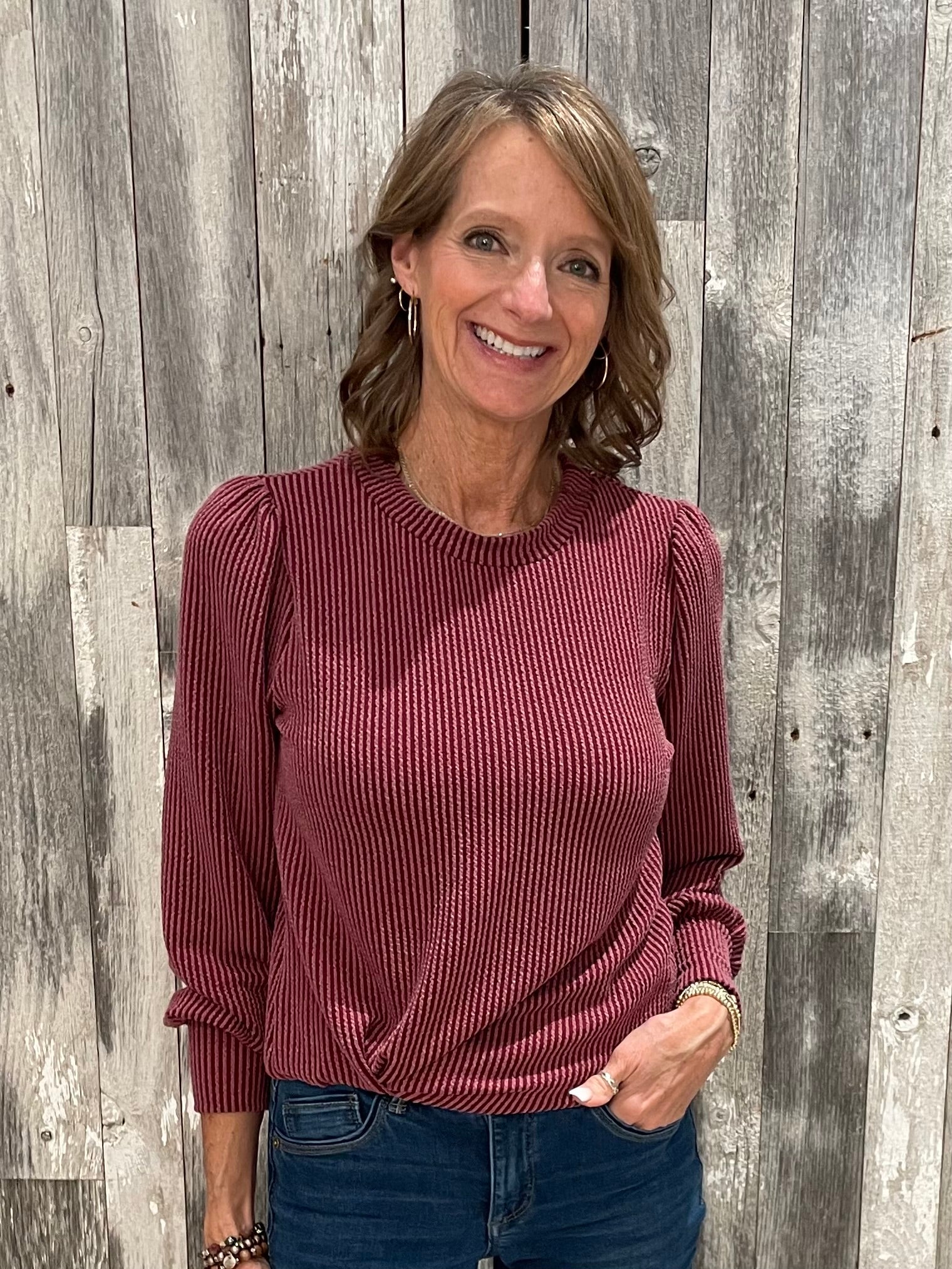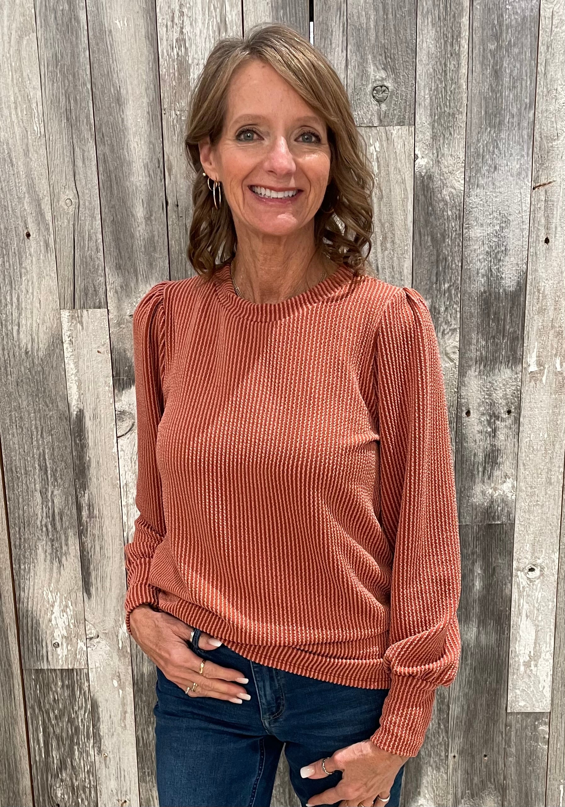 Crew neckline with subtle shoulder gathering for a feminine touch