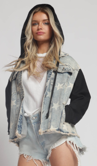 The Star Denim Distressed Jacket is a bold and trendy layering piece.