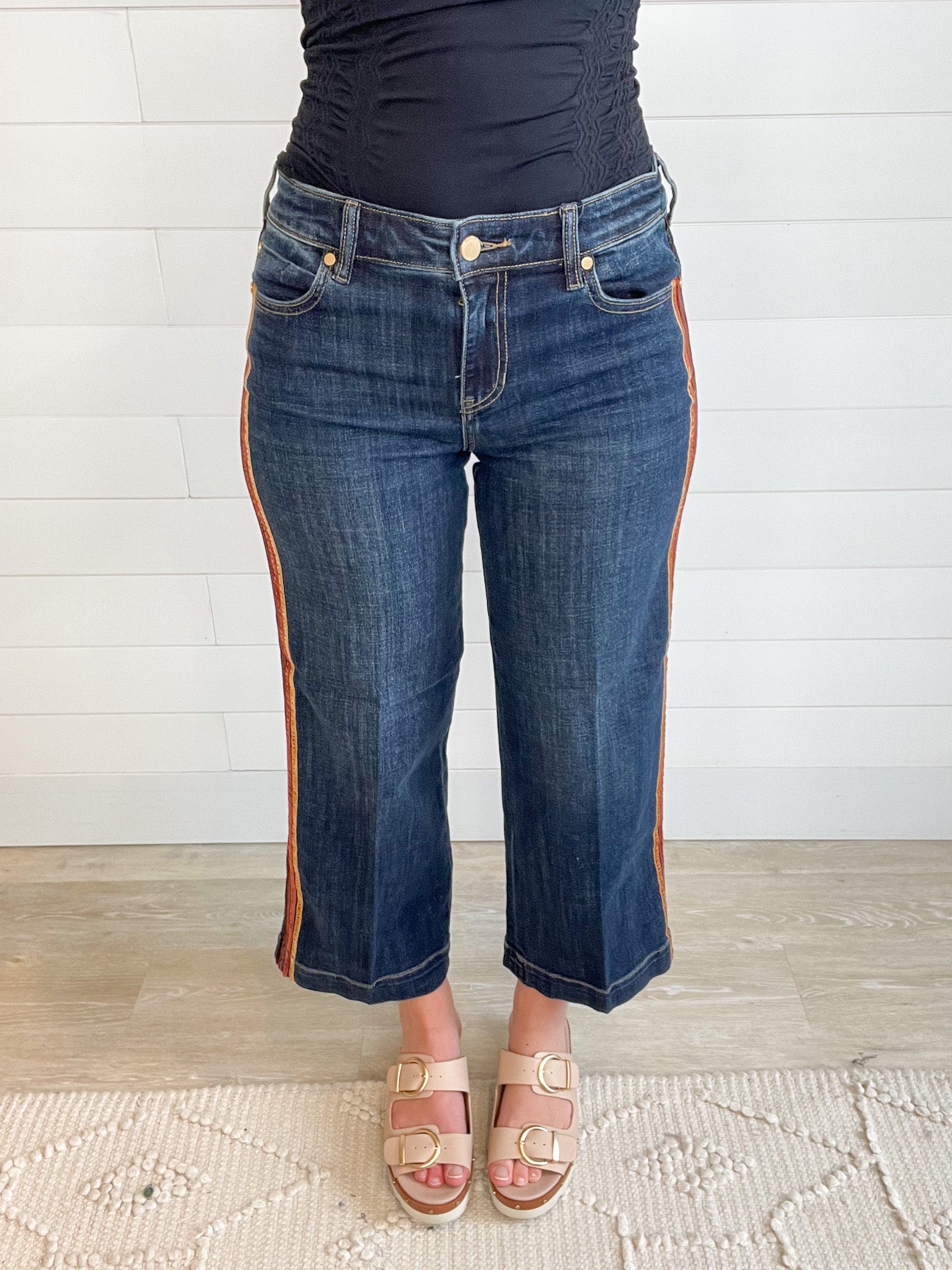 The Liverpool Stride Wide Leg Denim with Quad Stripe is where classic meets statement-making. With a flattering 10" rise and a cropped 28" inseam, this wide-leg silhouette elongates and elevates. Down the outer leg, four narrow velvet stripes—each in its own rich ombré-inspired tone (champagne, brick red, burgundy, and dark brown)—add just the right touch of texture and depth. Cool, confident, and made to turn heads.