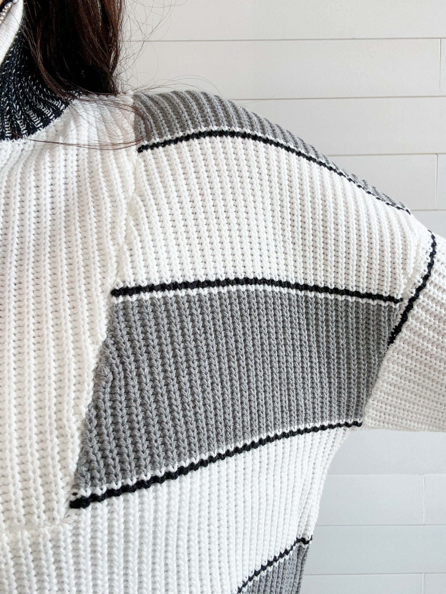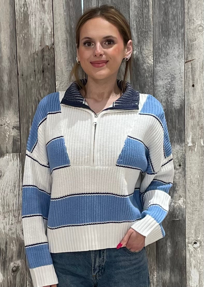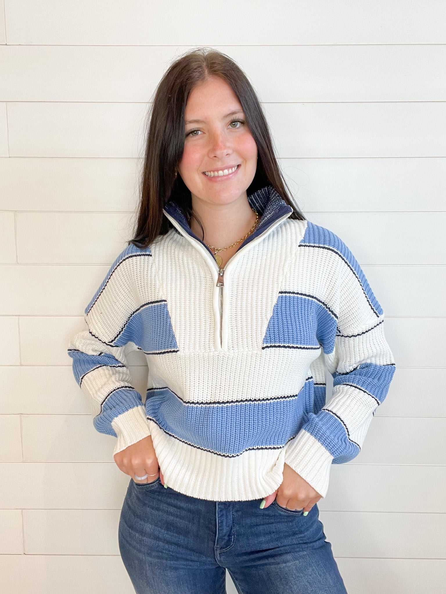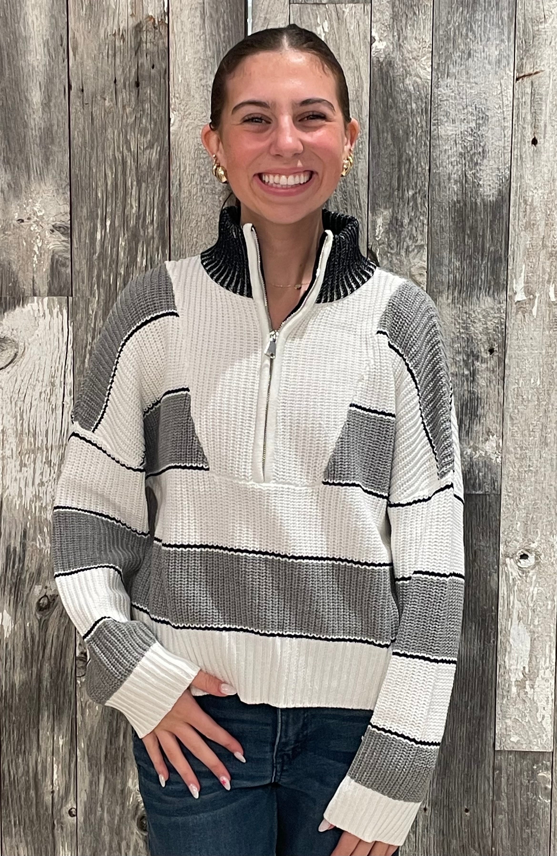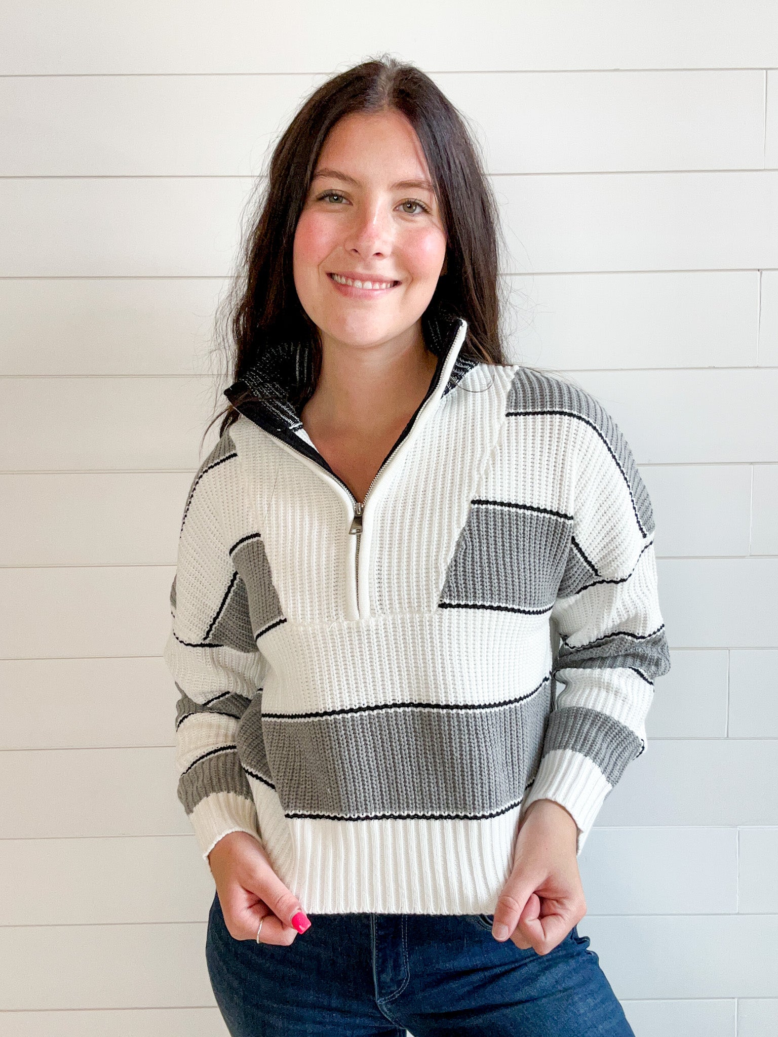 This Striped Quarter Zip Color Block Sweater pairs wide, bold stripes with a crisp white panel featuring a sleek quarter zip, creating a fresh, structured look. The meet-and-greet length and long sleeves make it perfect for layering or standing out solo on cooler days.