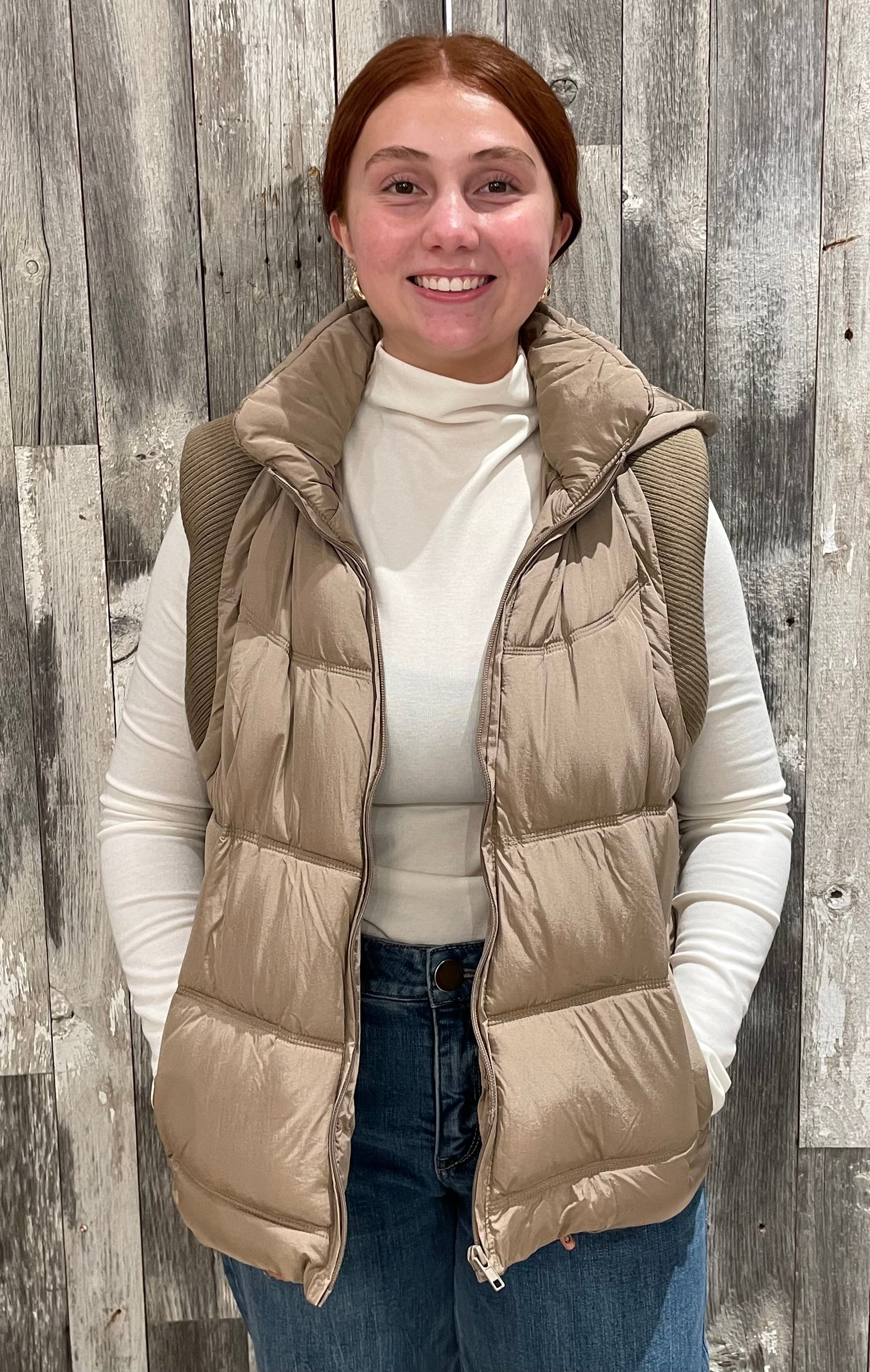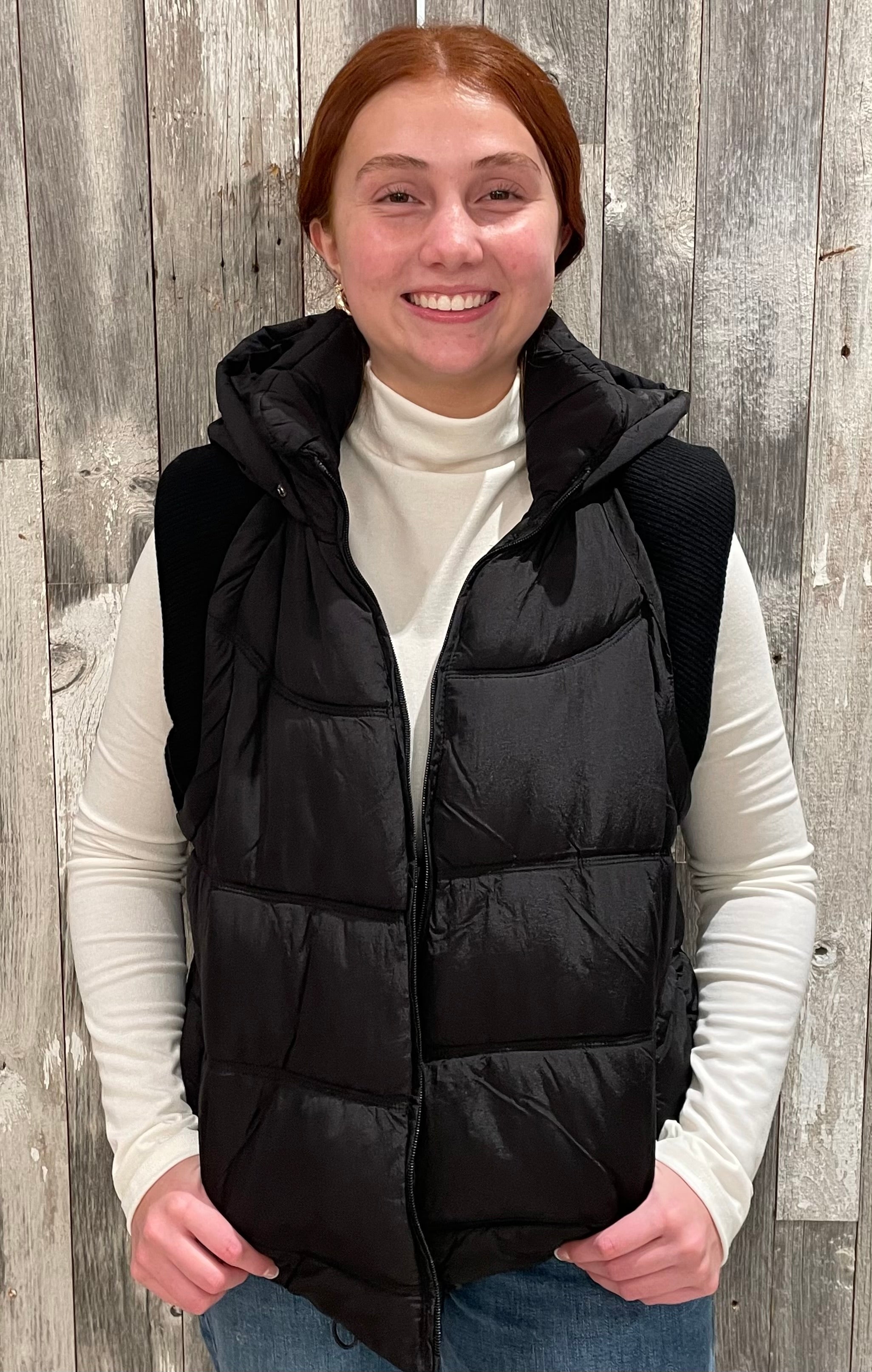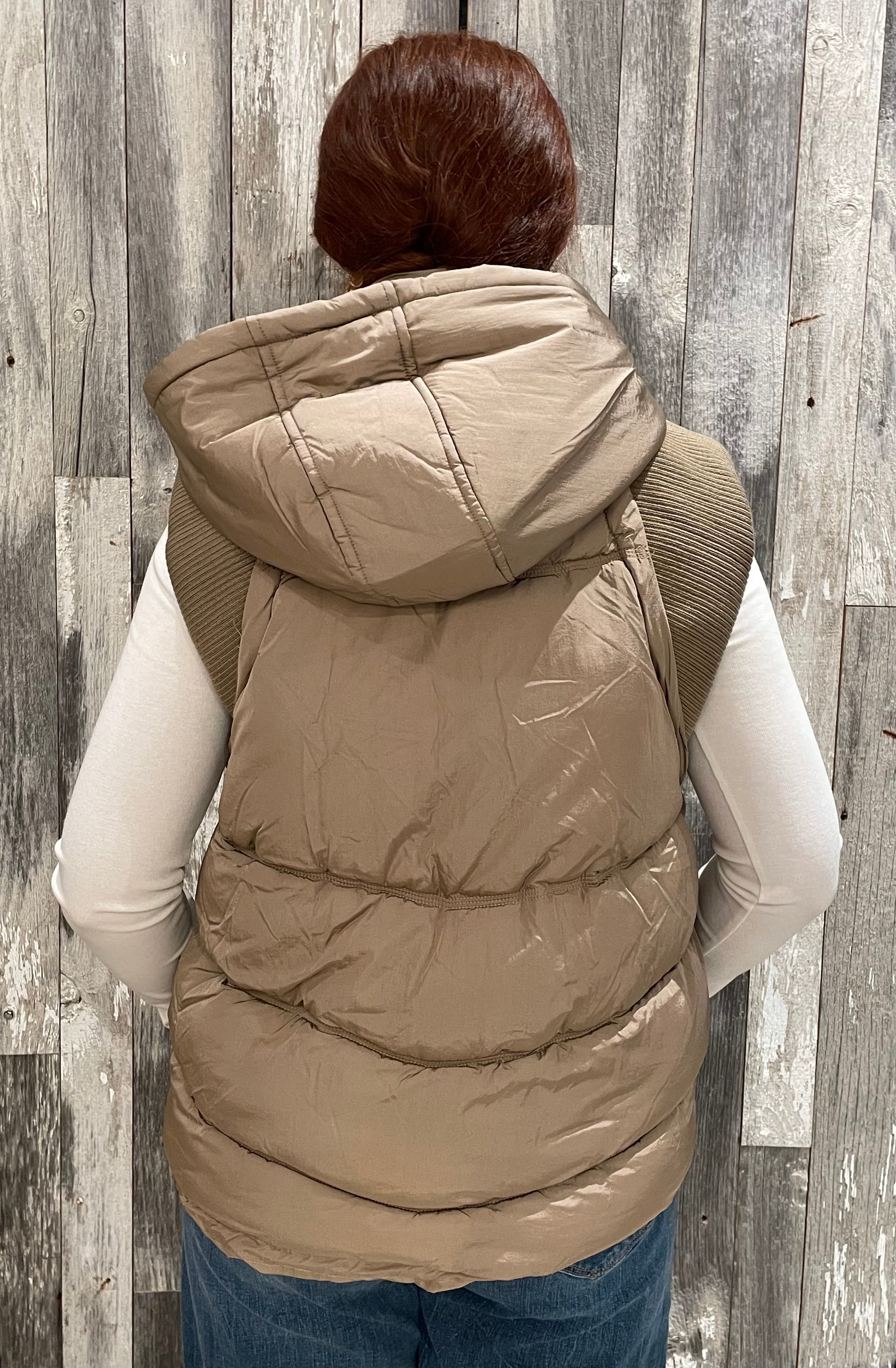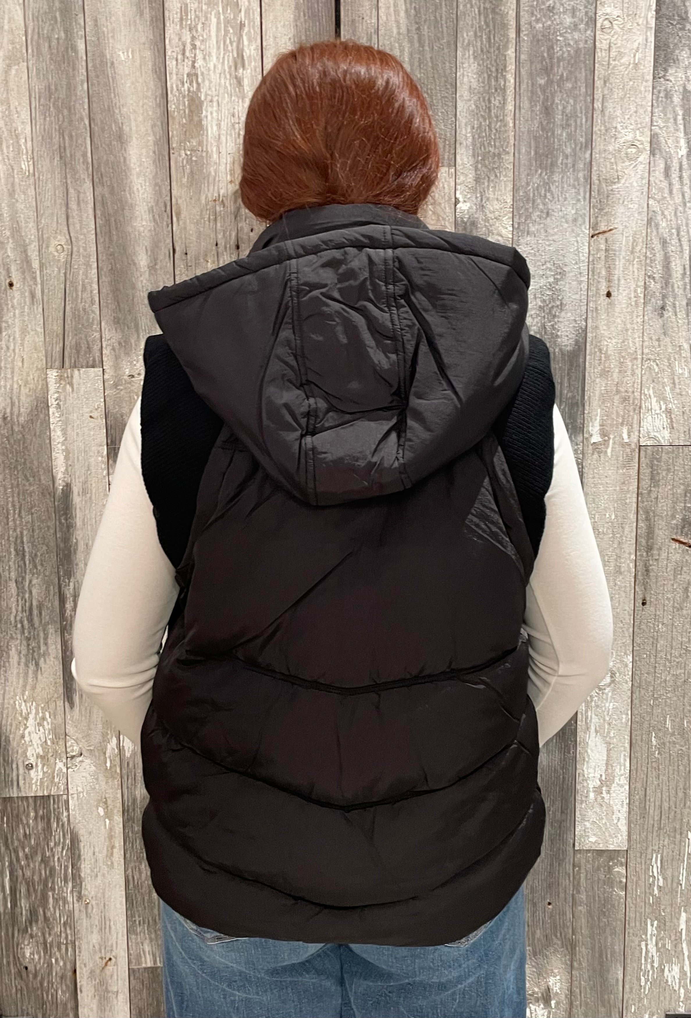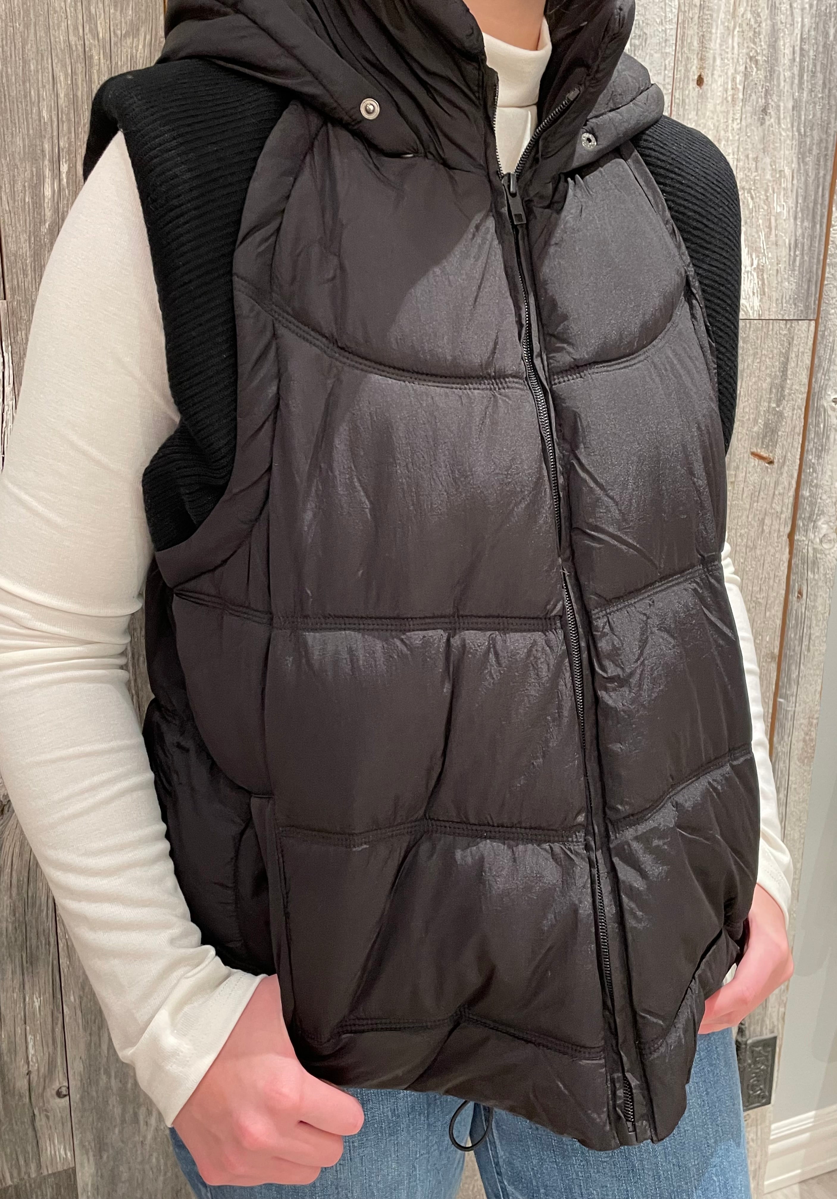 This Sweater Rib Detail Nylon Hooded Puffer Vest combines functionality and style. Made from matte nylon fabric, it features sweater rib details for added texture and comfort. The hood, front zipper, welt pockets, and elastic bungee cord provide practicality, while the fully lined interior ensures warmth. Perfect for layering on cooler days.