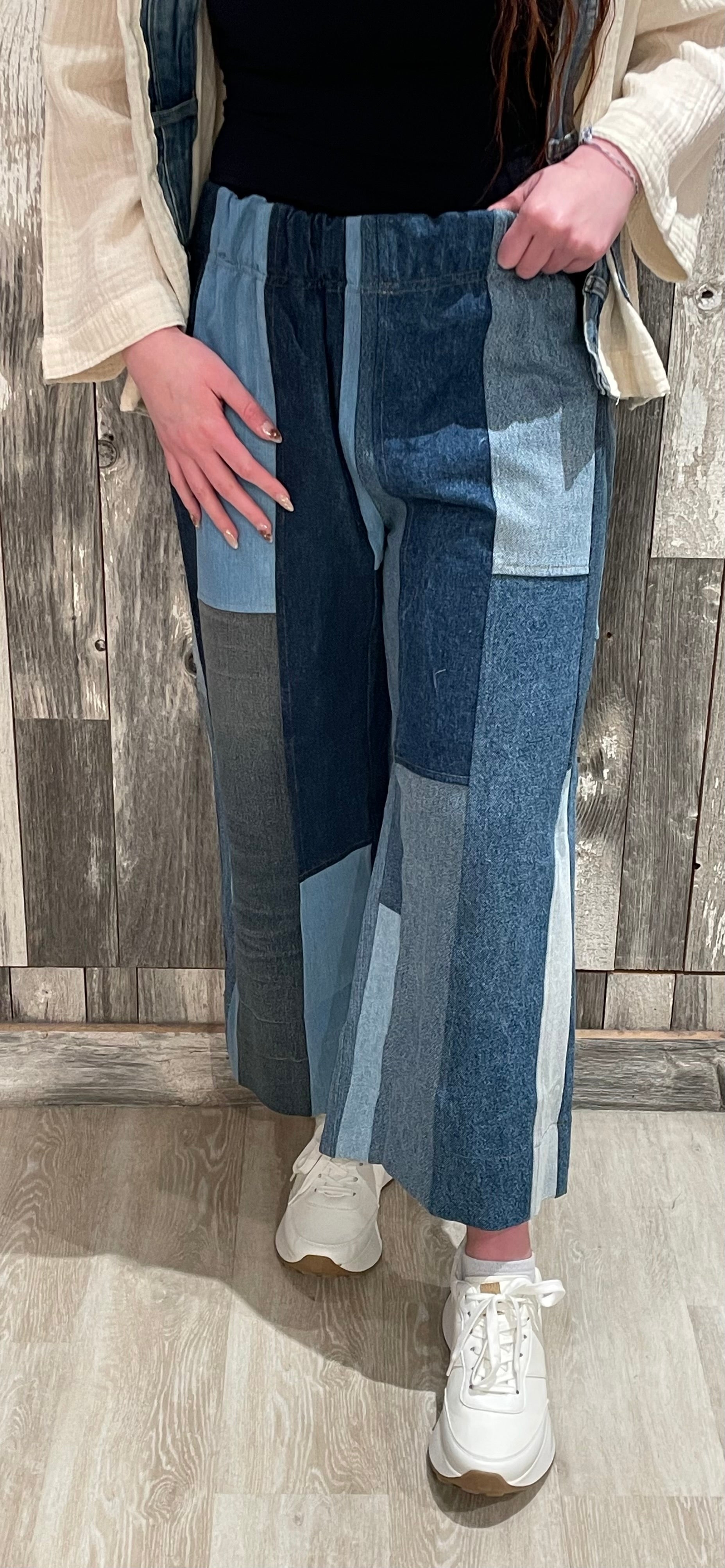 The Teona Crop Patchwork Pant brings sustainability and style together with its upcycled denim patches. Featuring a comfortable elastic waistband and a relaxed silhouette, these pants are perfect for casual, laid-back days. The patchwork design adds a unique, artisanal touch to your wardrobe.