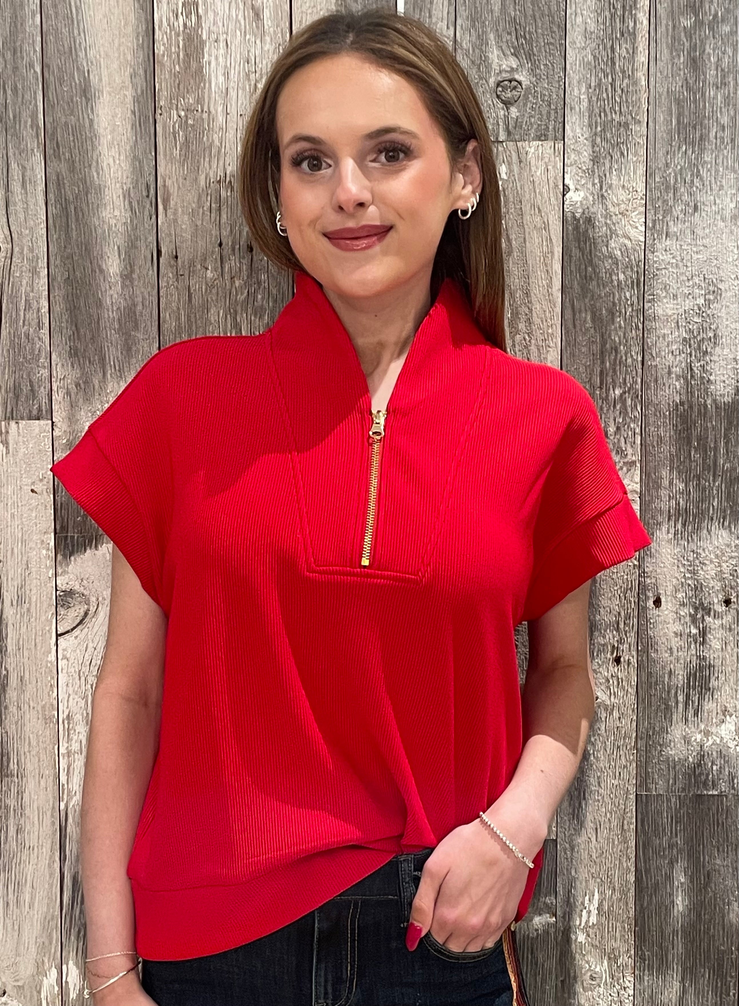 Tulip Collar Cap Sleeve Ribbed Quarter Zip