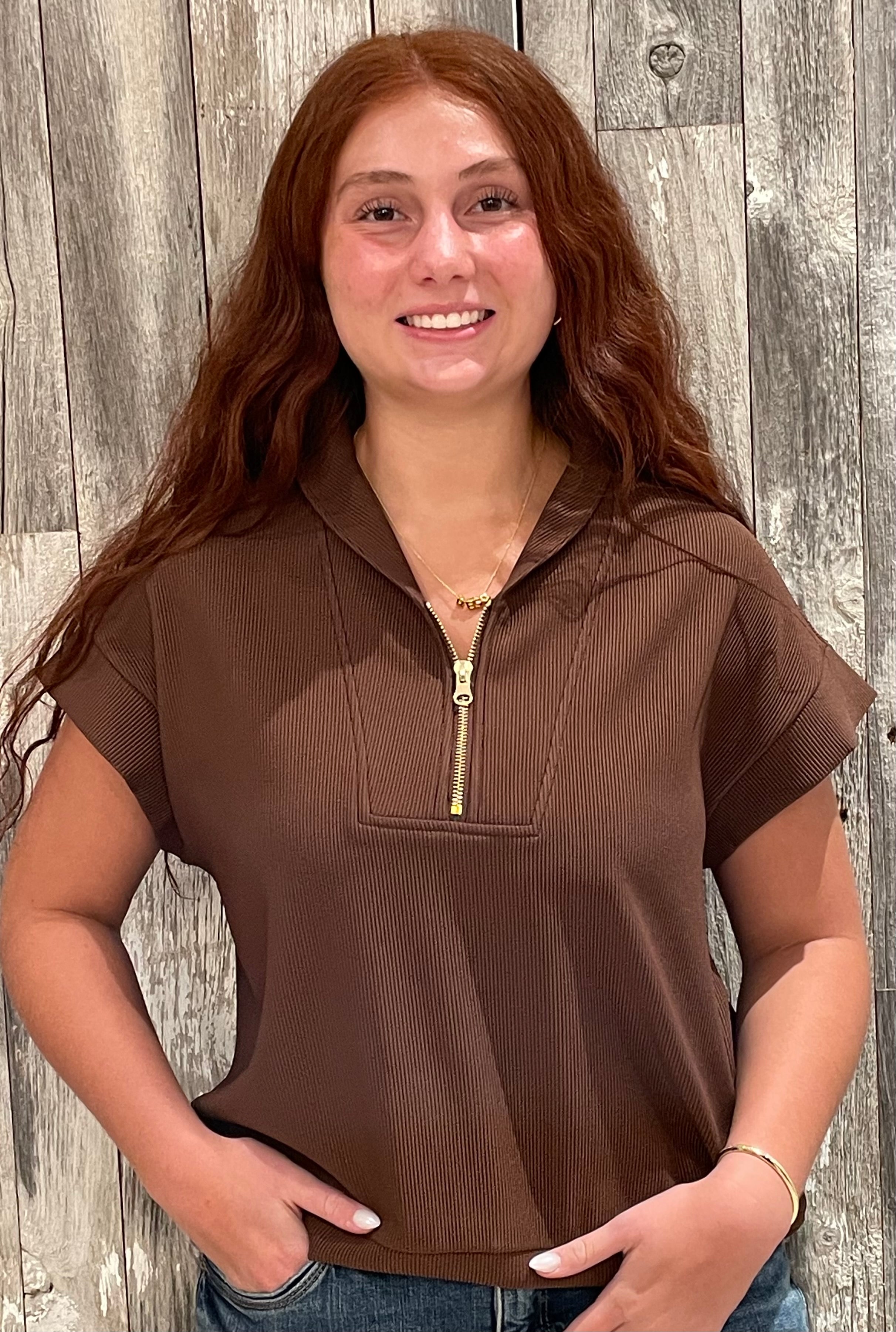 Elevate your everyday look with the Tulip Collar Cap Sleeve Ribbed Quarter Zip. Crafted from a fine gauge ribbed knit, this top combines soft stretch with subtle structure for a flattering fit that moves with you.