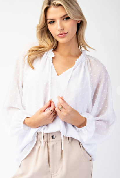 The V-Neck Blouse Top adds charm with its playful polka-dot fabric and delicate details.