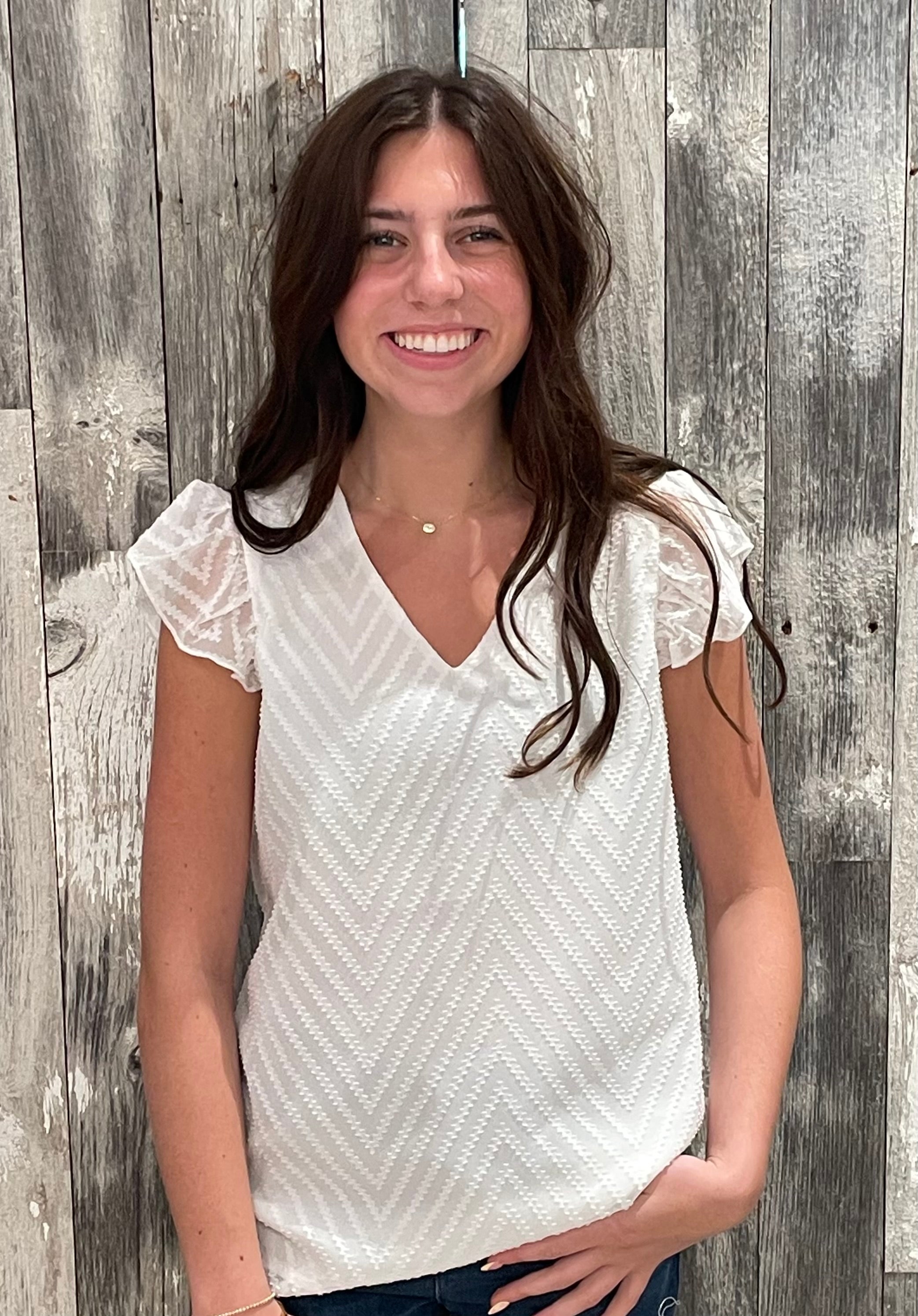 Feminine short-sleeve blouse with a subtle chevron textured pattern