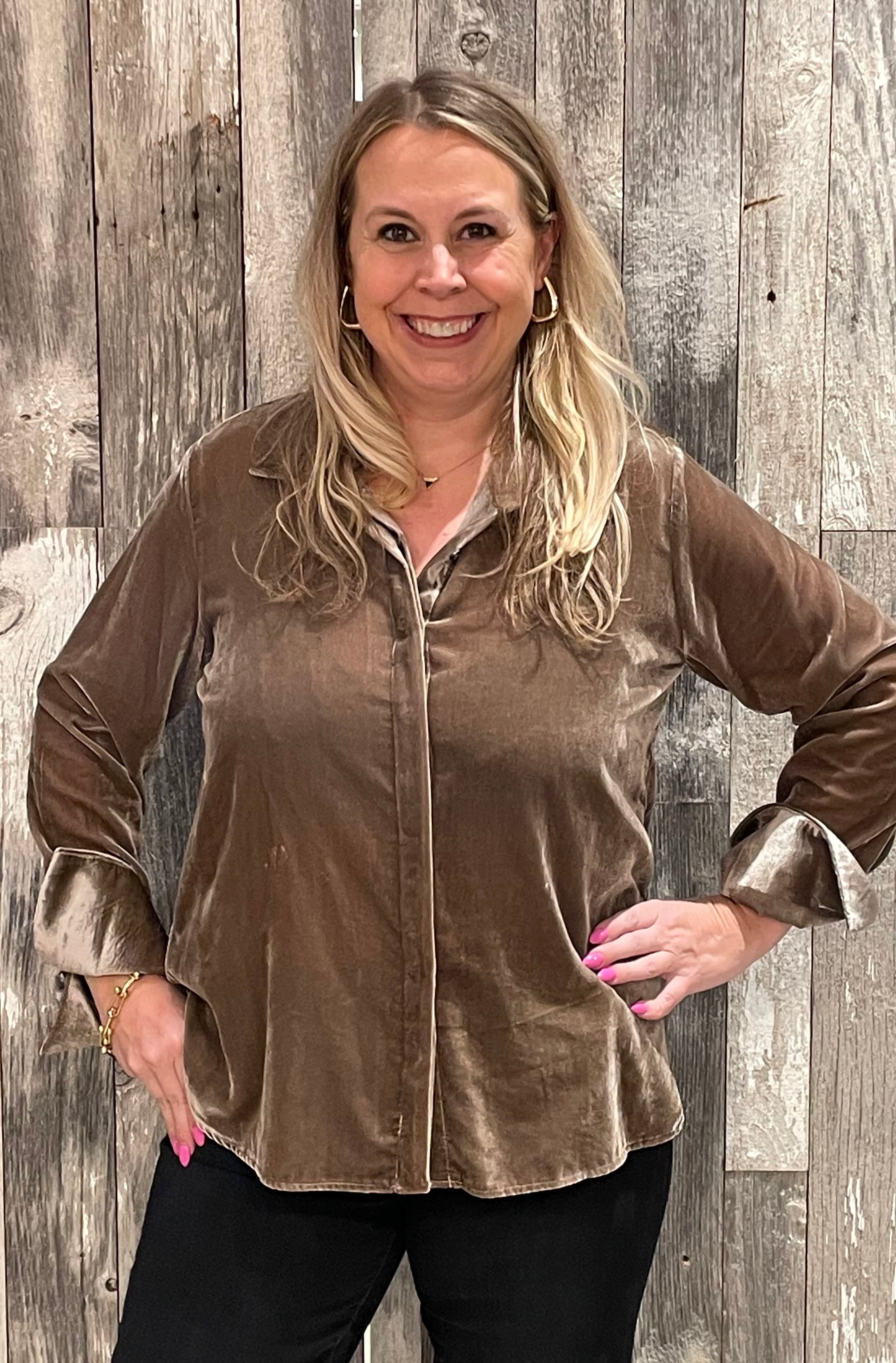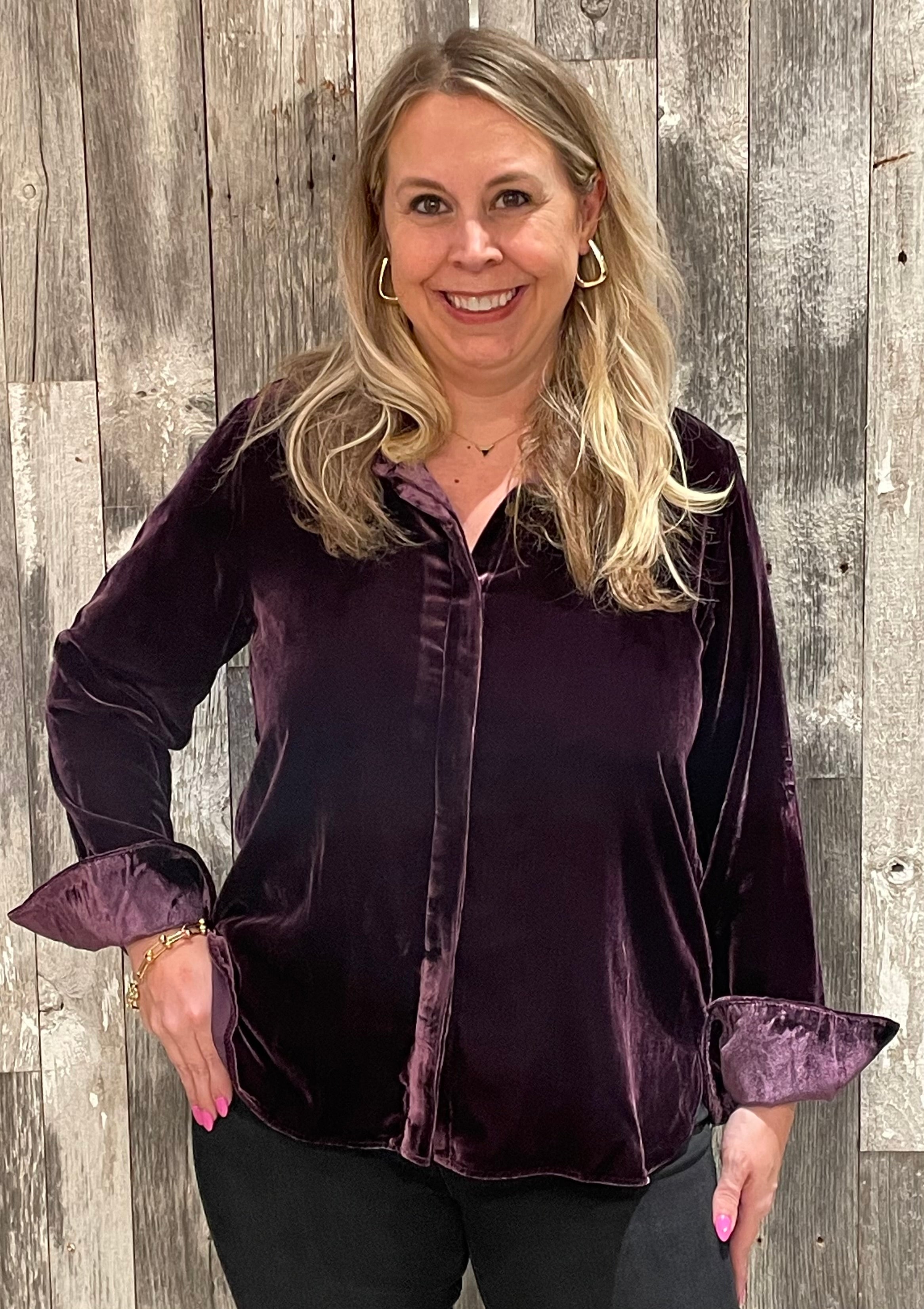 This Velvet Button Down Top adds a touch of luxury to your wardrobe with its soft, plush velvet fabric. Featuring a classic button-down front and long sleeves, this top can be styled for both casual and dressy occasions. Perfect for pairing with jeans or skirts for an effortlessly chic look.
