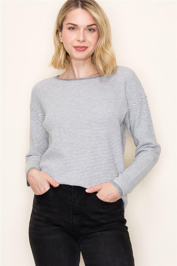 The Waffle Texture Pinstripe Sweater is an easygoing essential with subtle standout details. Made from a lightweight viscose-nylon blend, it features fine horizontal pinstripes with slightly wider contrast stripes at the hem and neckline for visual interest. A rolled hem crew neckline adds a relaxed finish to this ultra-soft, everyday favorite.