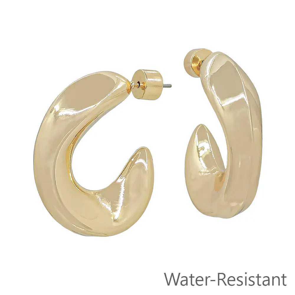 Add a touch of elegance to your outfit with our Water Resistant 1.25" Gold Hoop Earrings. These dangle earrings from What's Hot are designed to keep up with the latest fashion trends. Not only are they stylish, but they are also water-resistant, making them perfect for any occasion, whether it's a day at the beach or a night on the town.