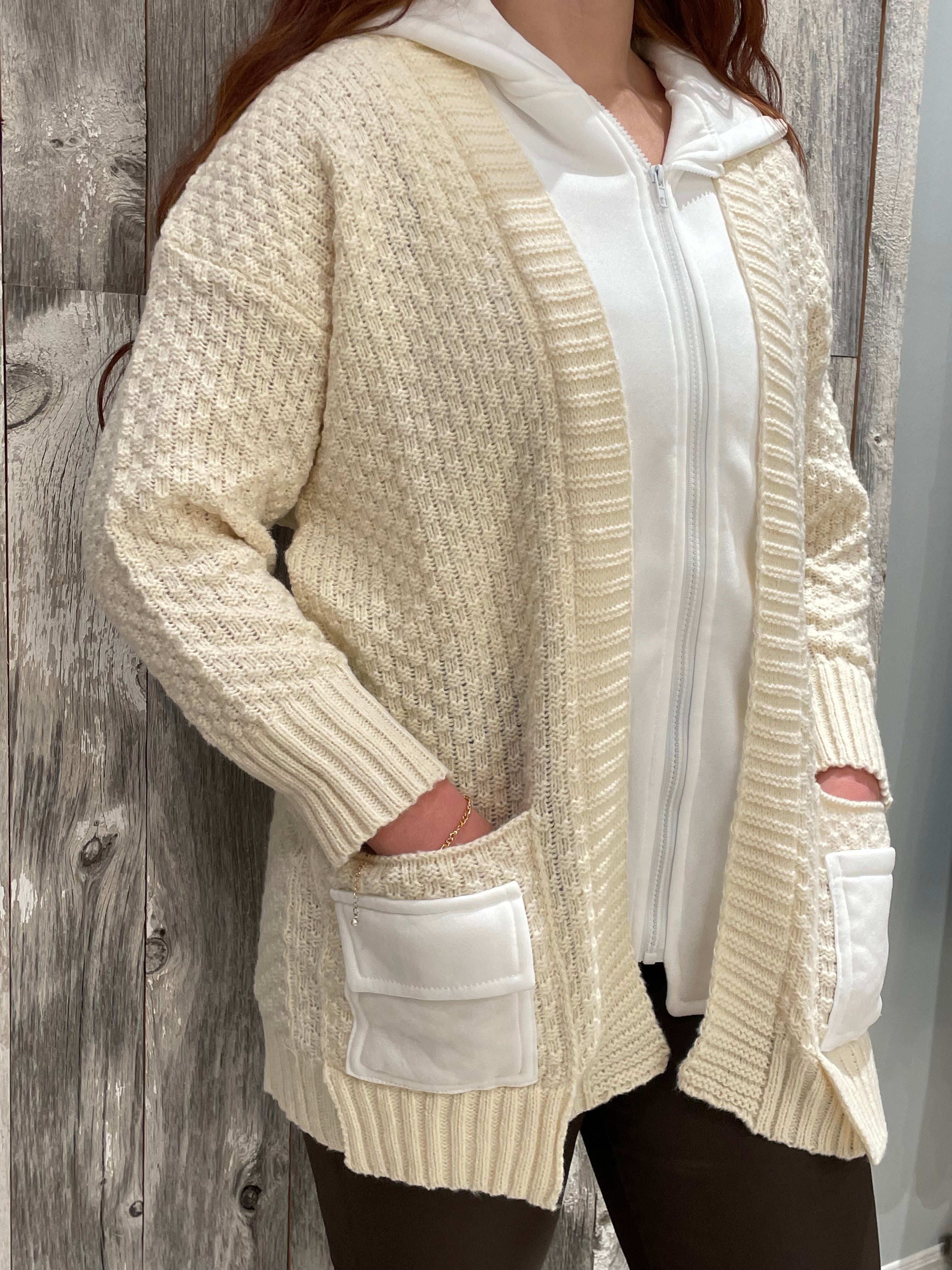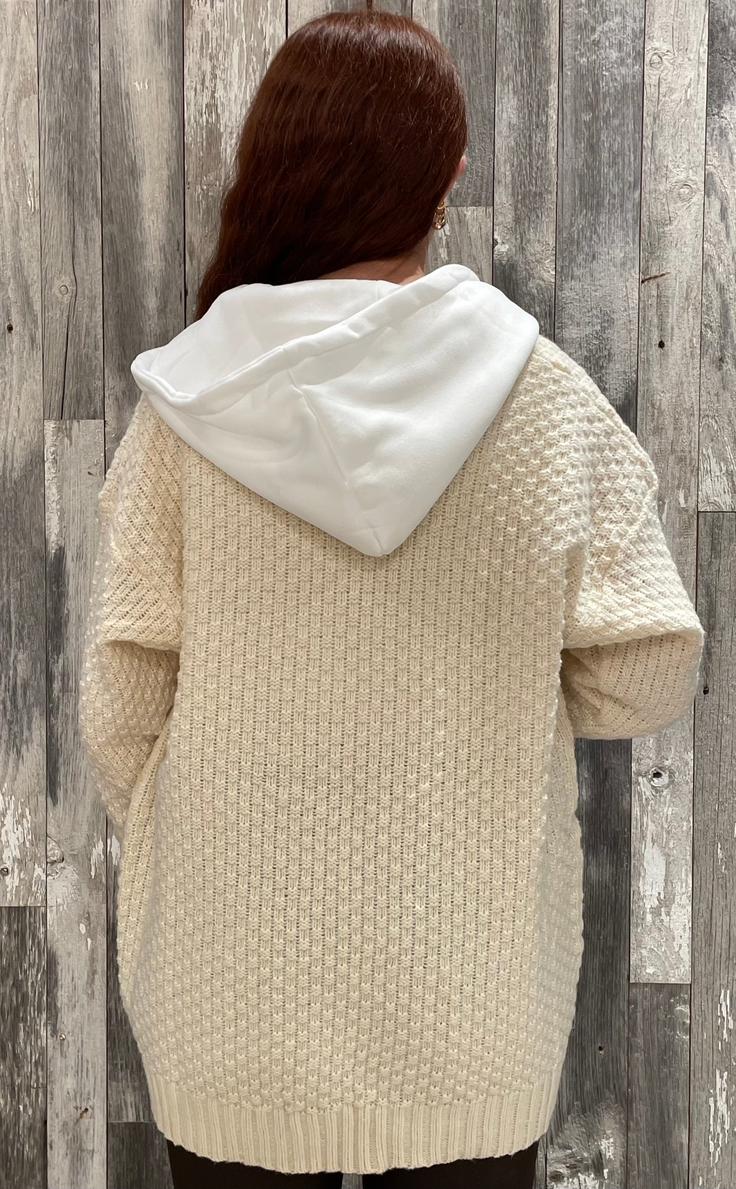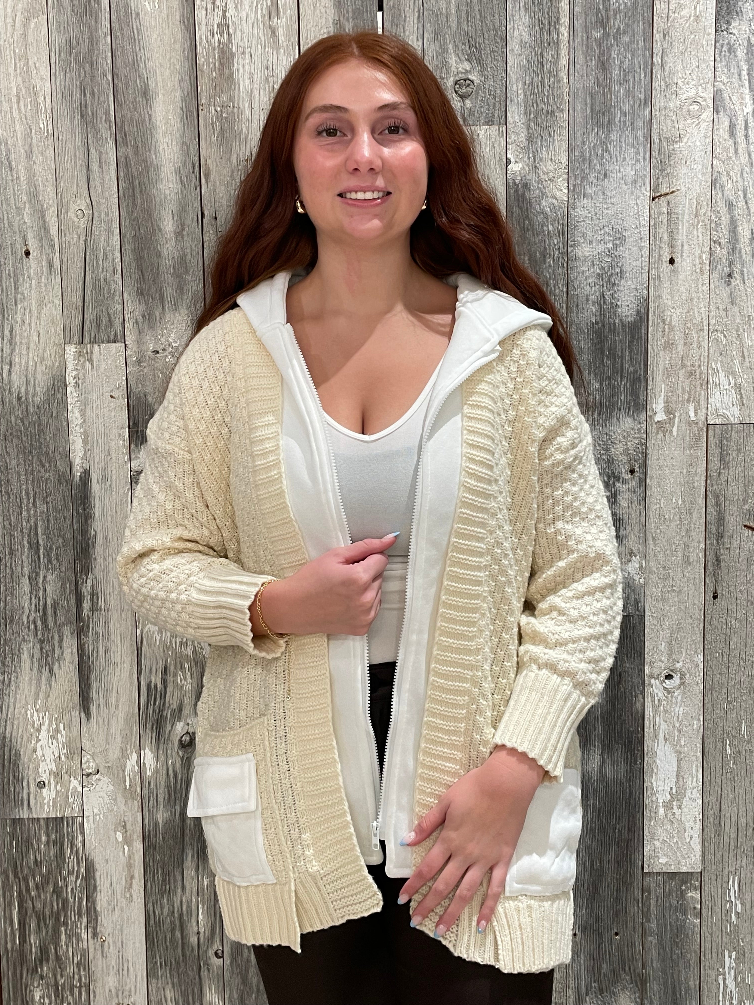 Front: Zip-front hoodie insert with open knit cardigan overlay
