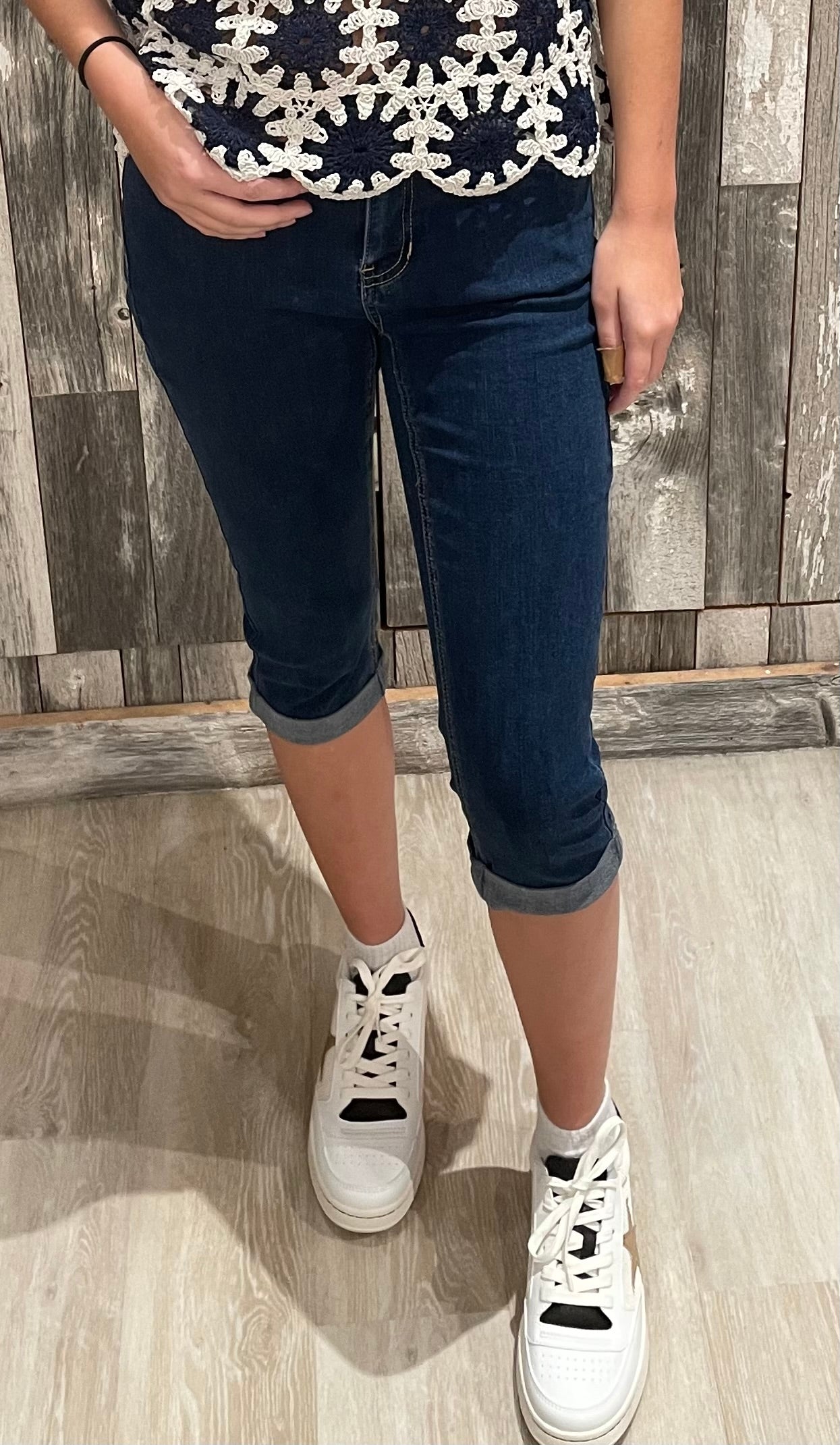 The Cuffed Denim Capri is a versatile warm-weather staple designed for comfort and effortless style. Featuring a flattering mid-rise fit and a clean dark wash, this pair offers just the right amount of structure with an easy, wearable feel. The cuffed hem adds a casual touch, making these capris perfect for everyday outings, weekend wear, or travel days.