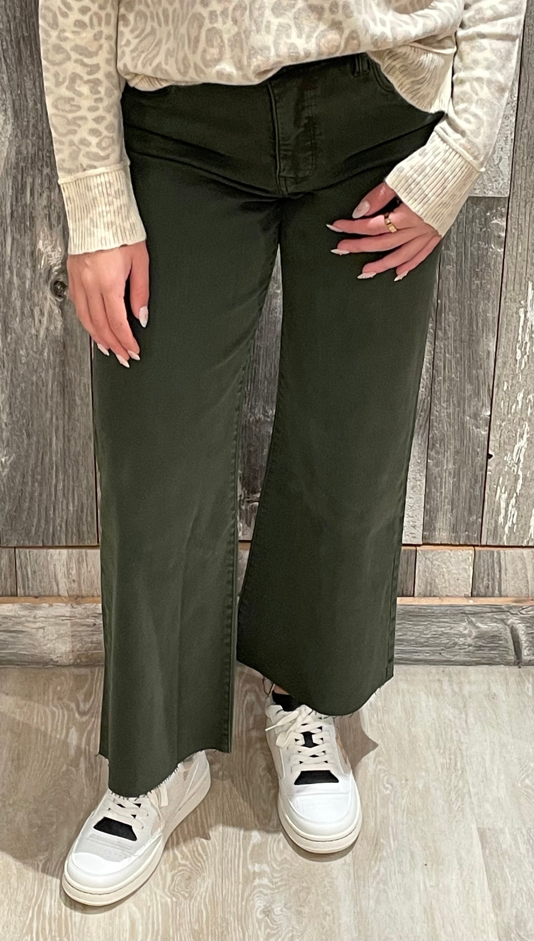- These high rise wide leg jeans feature our signature Fab Ab pockets for a flattering fit. Made with super stretchy fabric and finished with a trendy raw hem, they combine comfort and modern style effortlessly.