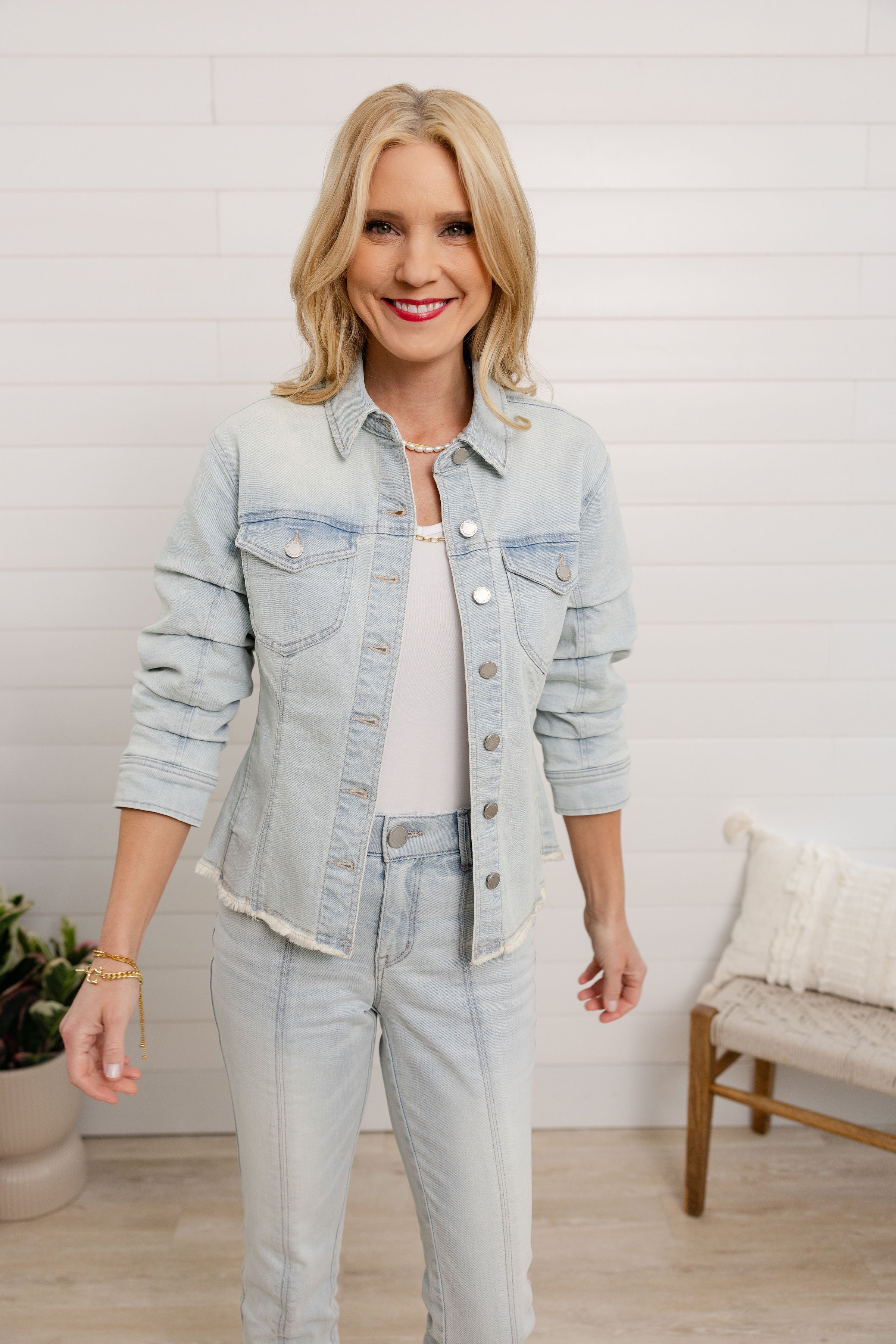 This light-wash denim jacket is a timeless layer with modern details that make it feel extra special. Easy to wear, flattering, and endlessly versatile, it’s the kind of piece you’ll reach for season after season.