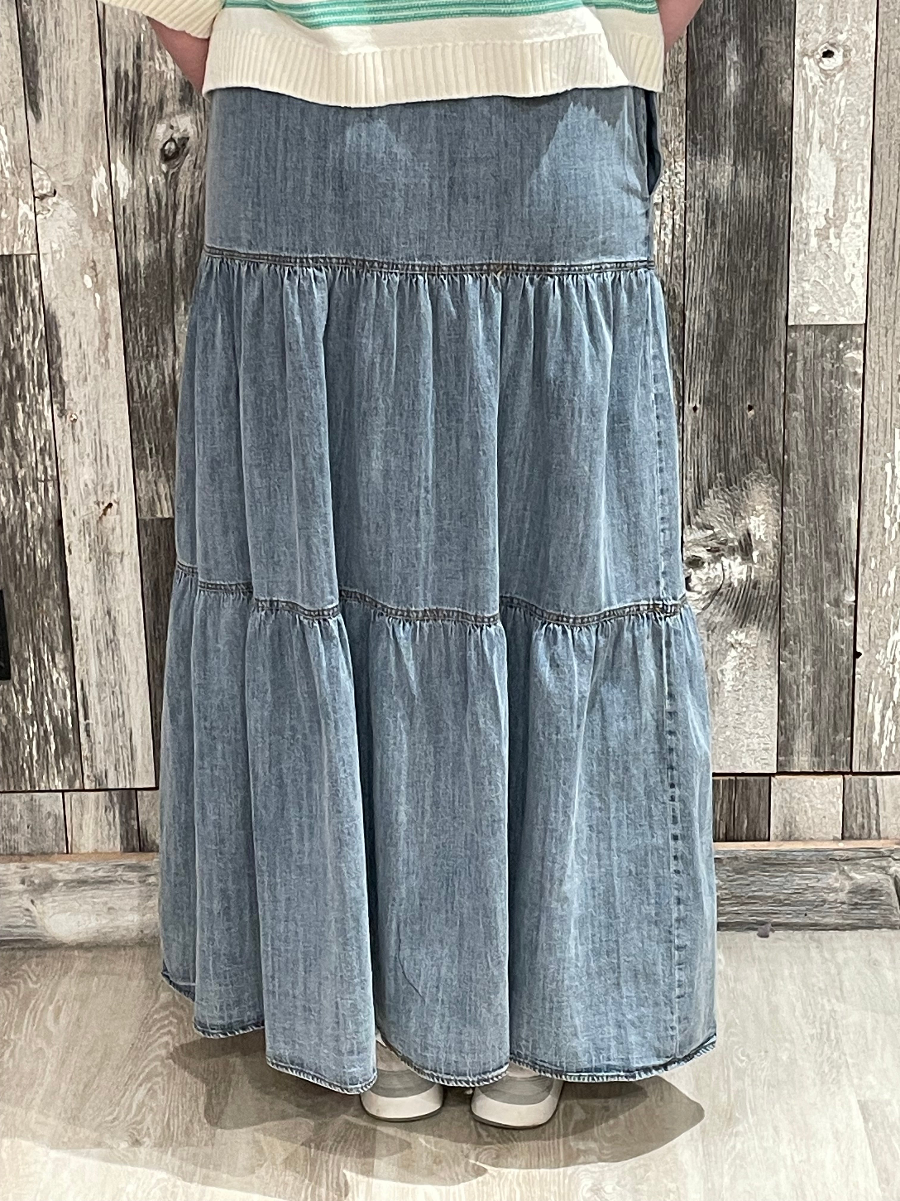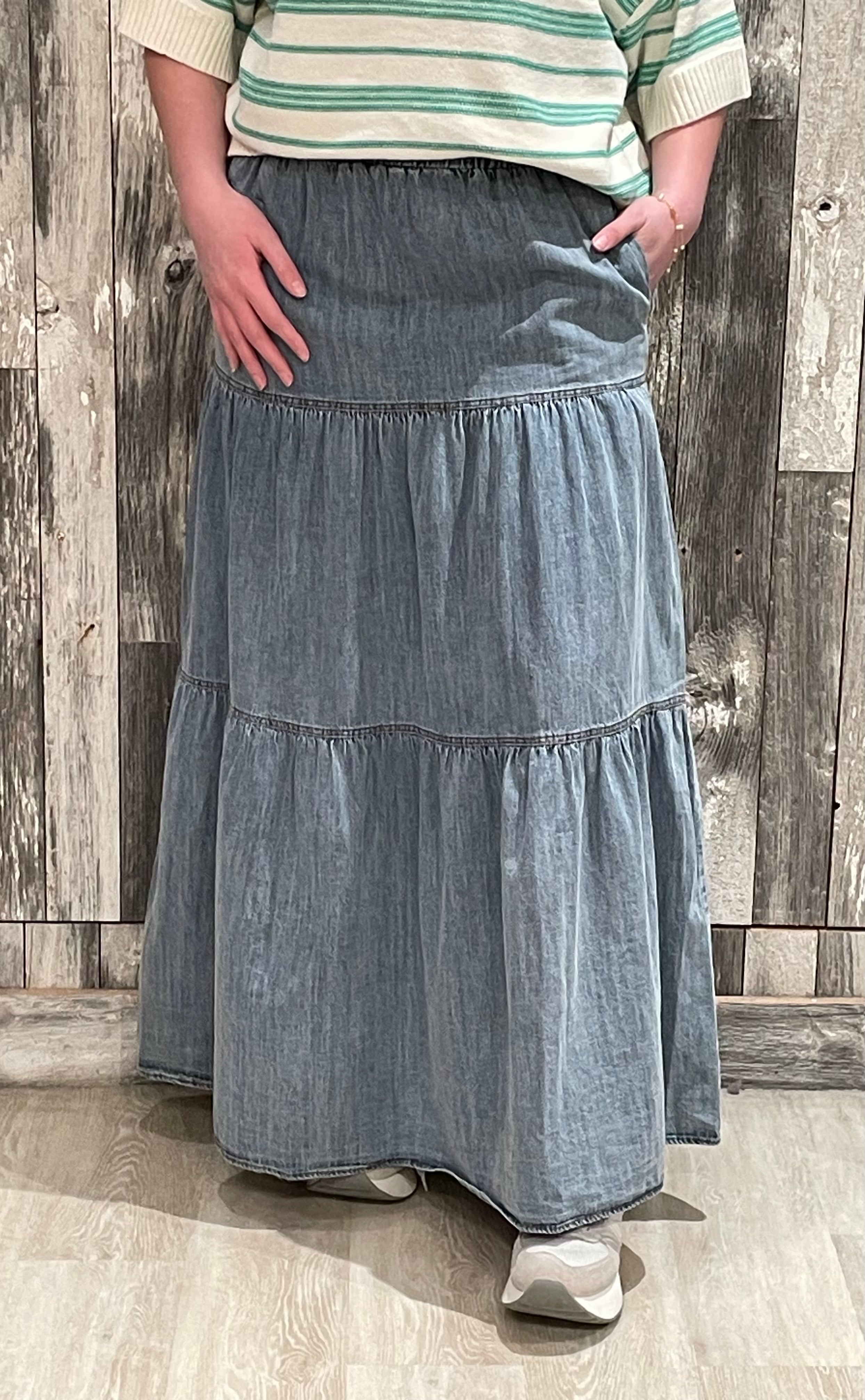 This tiered denim maxi skirt is the perfect blend of casual comfort and timeless style. Designed with a flattering elastic waistband and soft, lightweight denim, it moves beautifully with every step. The tiered silhouette adds subtle dimension while keeping the look relaxed and easy to wear. It’s the kind of piece you’ll style again and again, season after season.