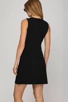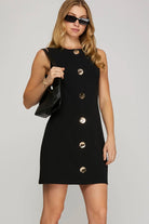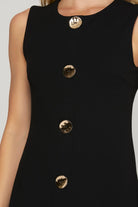 A timeless black mini dress elevated with bold gold statement buttons for a polished, confident look. Sleek and versatile, it transitions effortlessly from day to night.