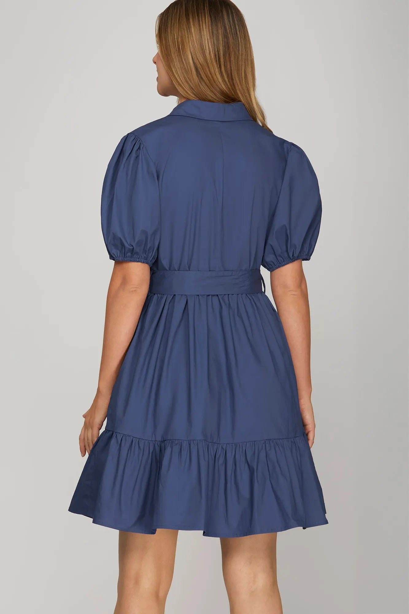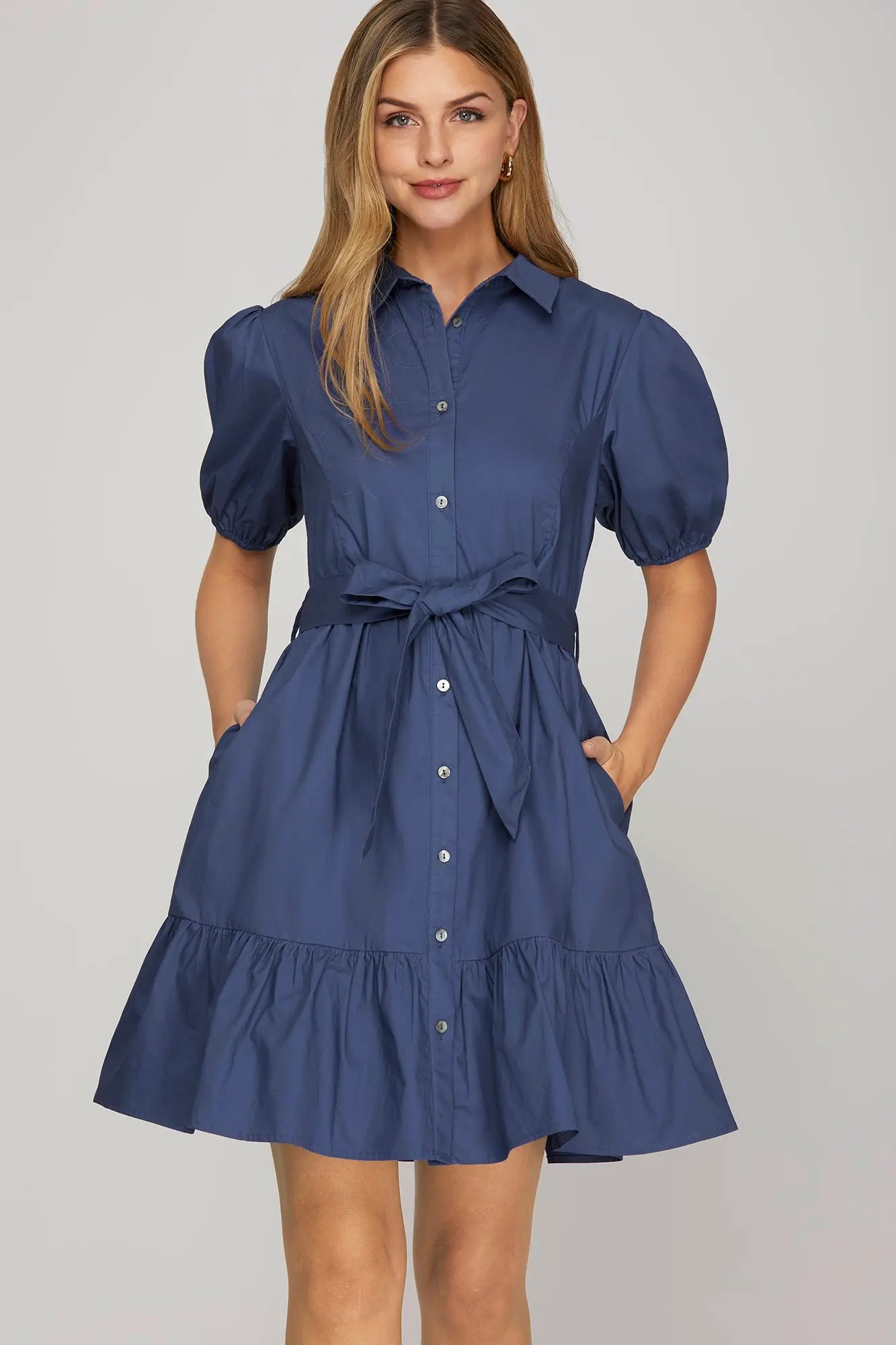 This button-front dress combines timeless structure with soft, feminine details for an effortlessly polished look. Designed with puff sleeves, a self-tie waist, and a flounced hem, it’s the kind of easy, put-together piece that works for both everyday wear and special plans.