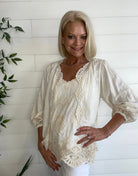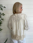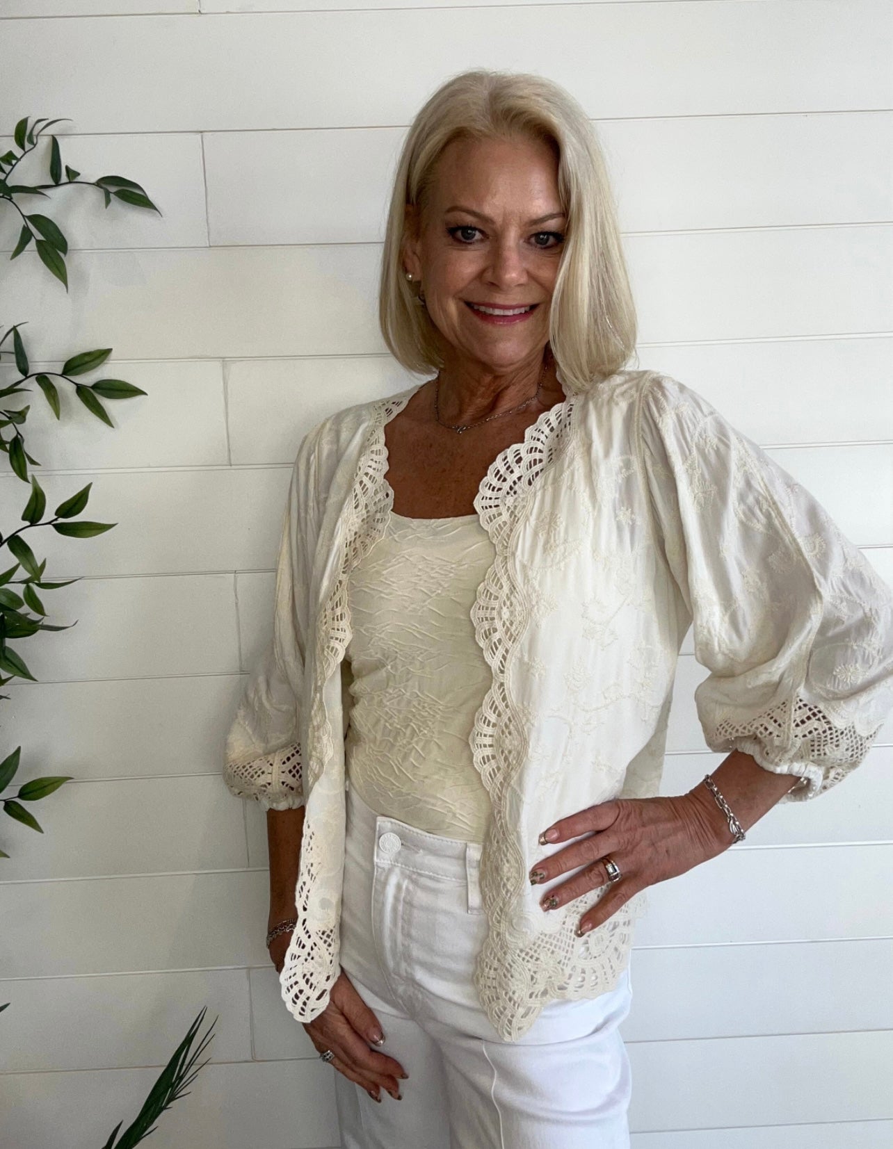The scalloped lace trim along the edges and sleeves adds a vintage-inspired touch, making it a timeless addition to any boutique wardrobe.