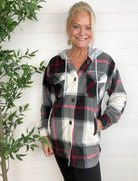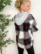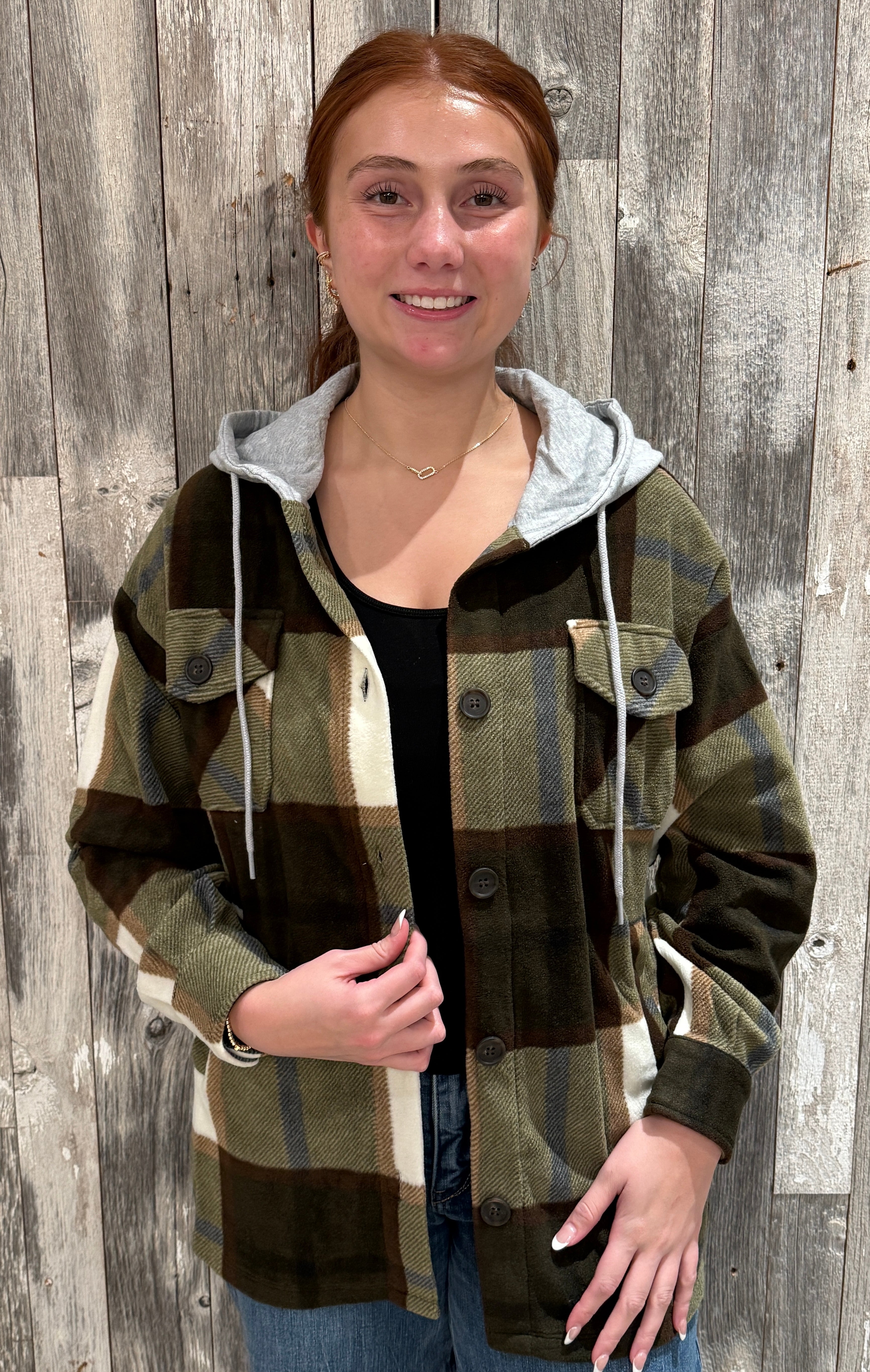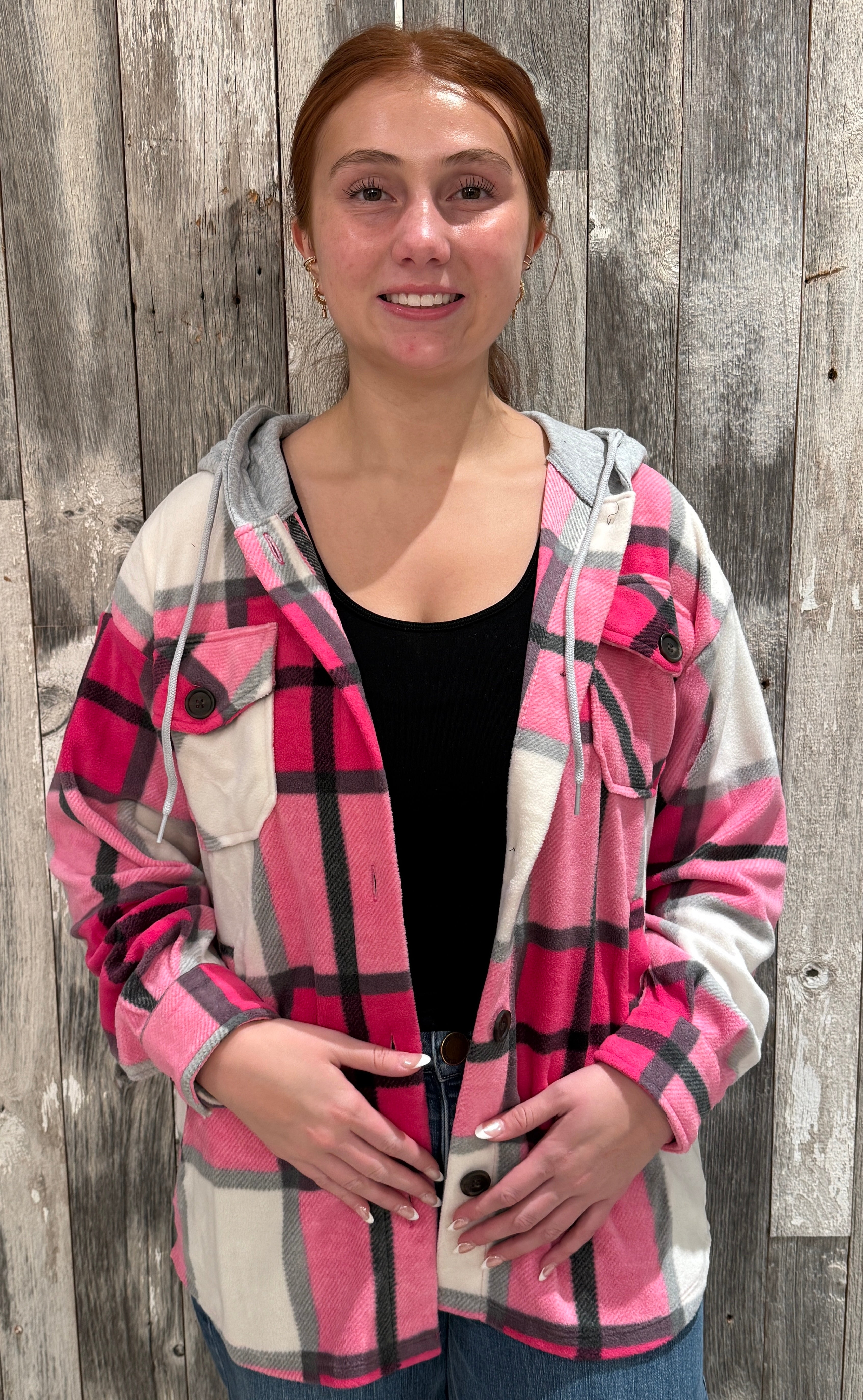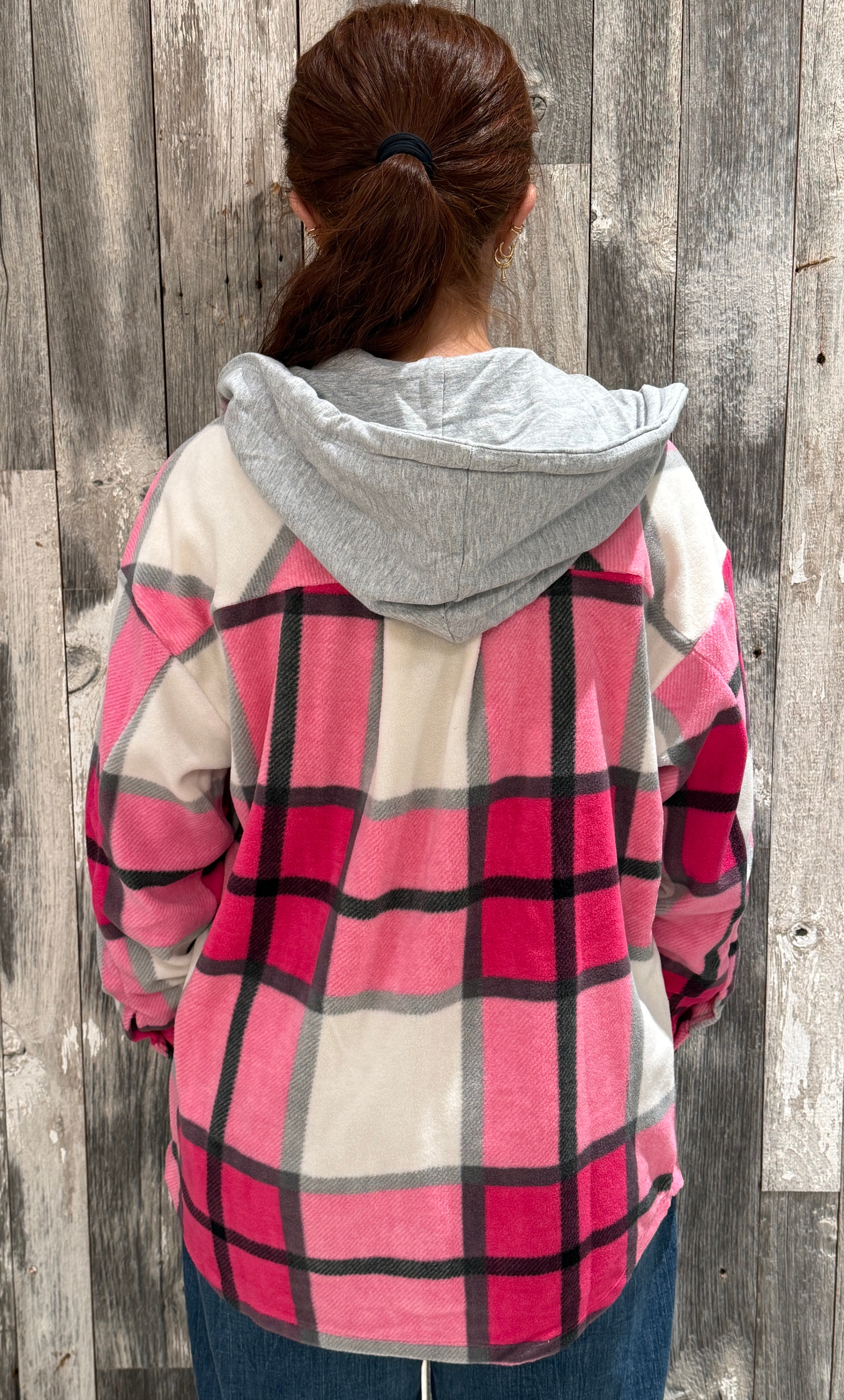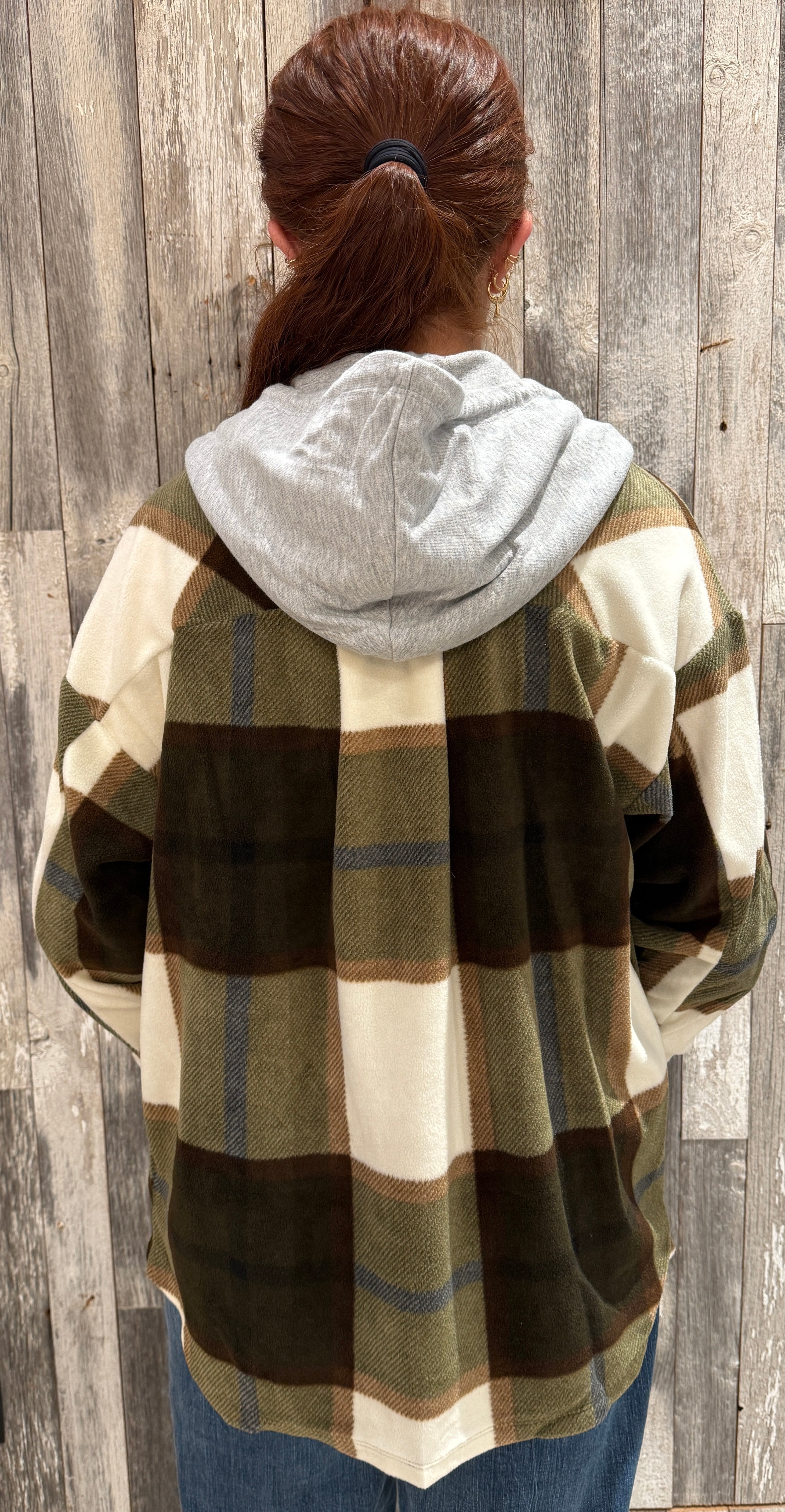 This plaid fleece shacket gets a sporty upgrade with a soft heather grey hood and drawstring detail. Perfectly aligned plaid lines keep the look sharp, while the fleece fabric adds all the cozy you need for chilly days. Itās the ultimate grab-and-go layer for casual cool.