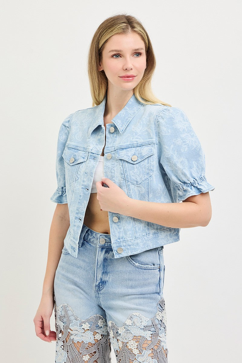 A fresh take on a classic, this denim jacket features soft puff sleeves and a subtle floral wash for a feminine, modern feel. Perfect for layering with a touch of charm.