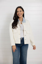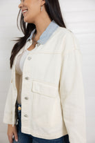 This fresh twist on a classic utility jacket blends an easy neutral tone with a subtle pop of denim at the collar. Designed with a relaxed fit, oversized patch pockets, and a structured button front, it’s the perfect lightweight layer for transitional seasons and everyday wear.