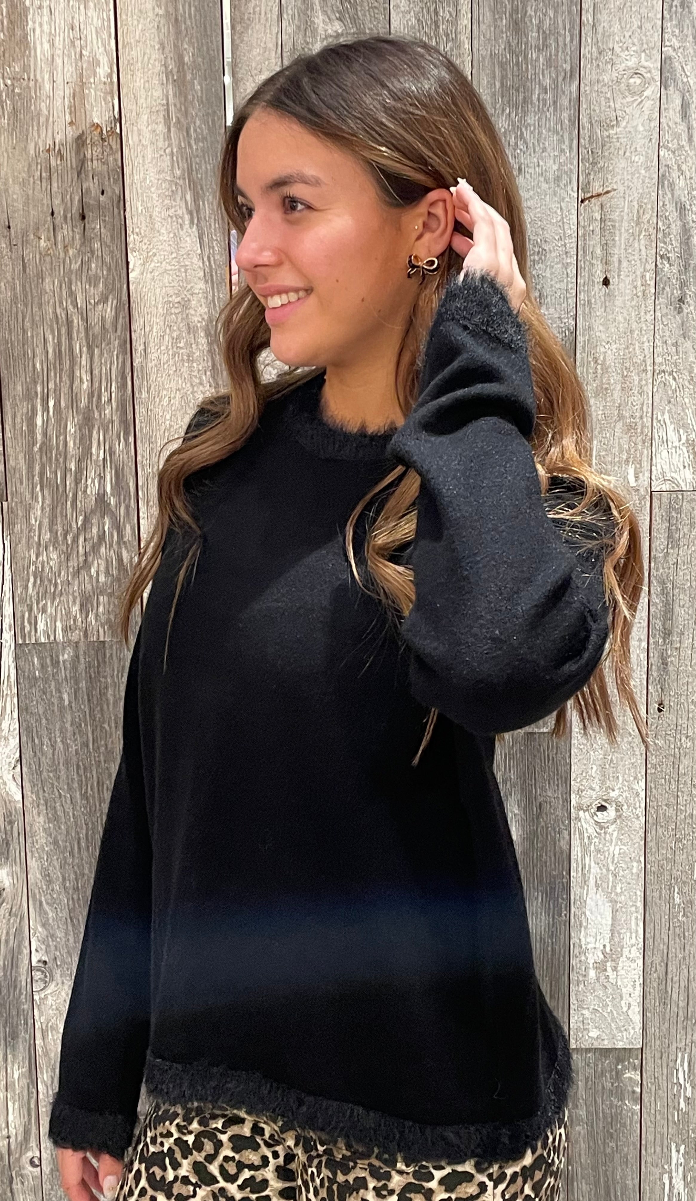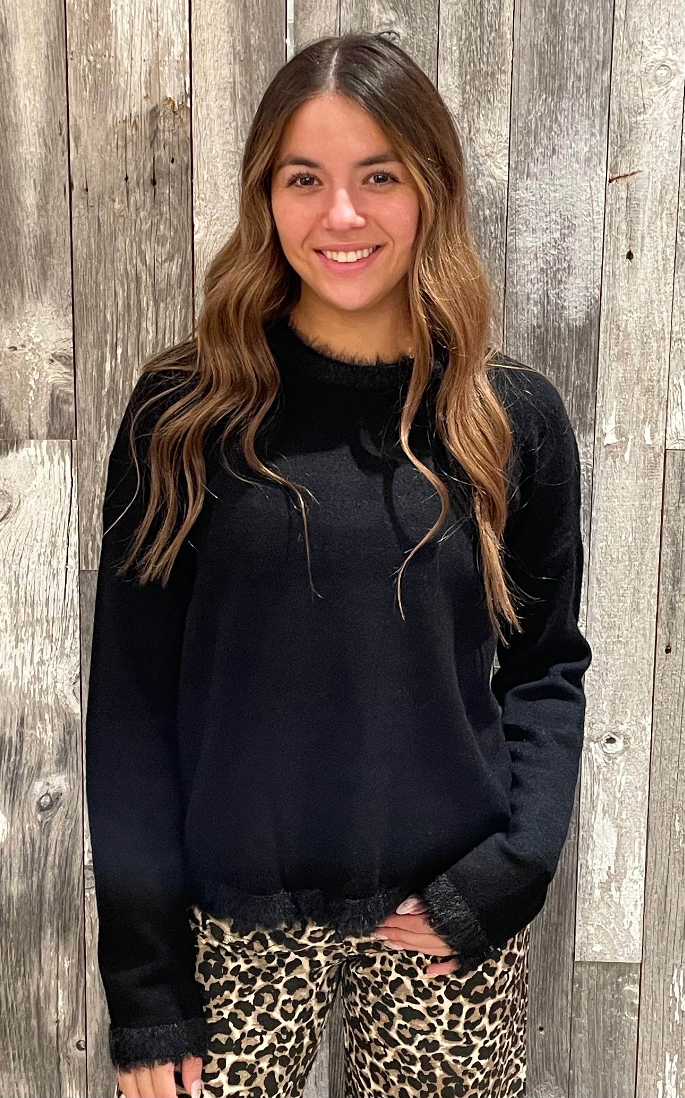 • Subtle eyelash-fringe detailing along the hem and cuffs for added texture