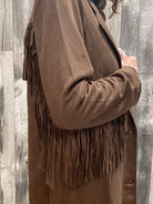 Turn heads this season with the Fringe Trim Faux Suede Coat—a statement layer that blends western flair with polished tailoring. Crafted in soft faux suede with a touch of stretch, this coat features a classic blazer-inspired silhouette with a notch lapel, button-front closure, and sleek top-entry pockets. The real star? Swingy fringe detailing that cascades down the arms and across the back, bringing plenty of movement (and compliments) wherever you go. Fully lined for comfort and warmth, it’s the perfect mix of fun and functional.