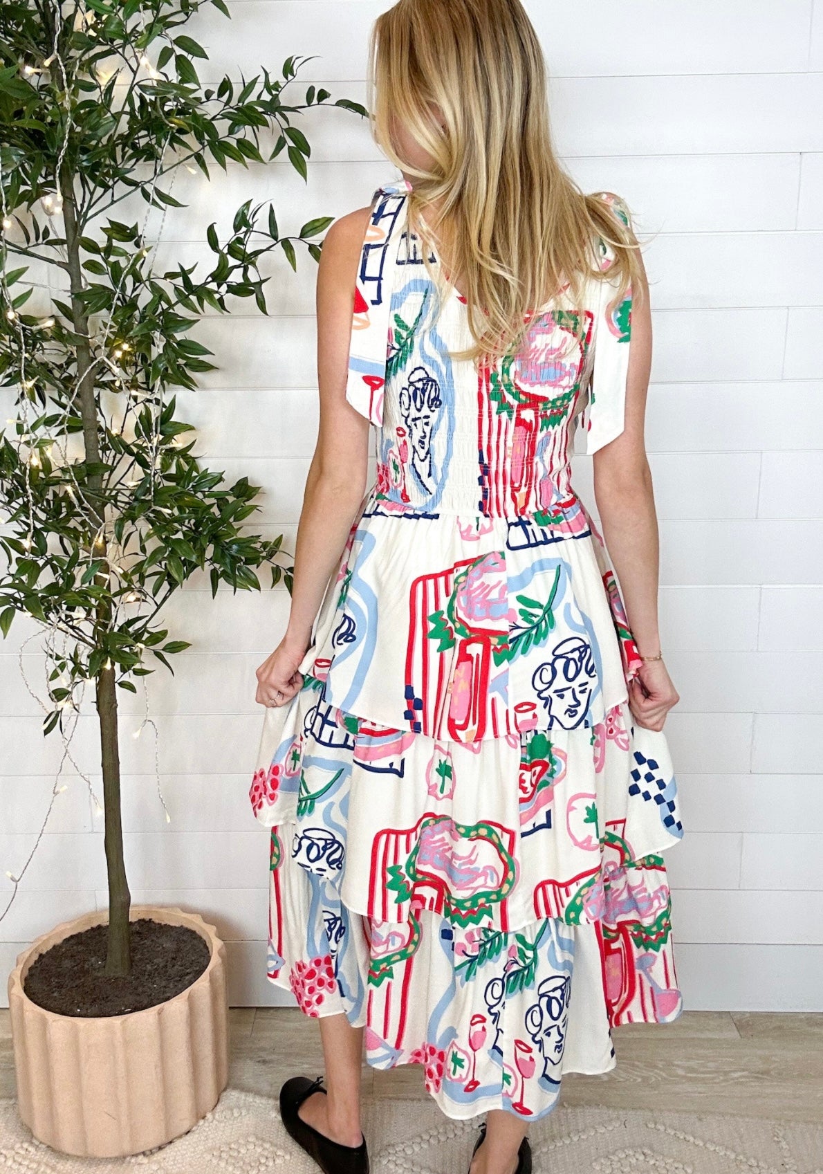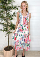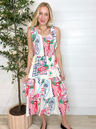Meet the Italiano Sketch Tiered Midi Dress — a breezy, generously fitting statement piece that feels like wearing a sunny Italian day. With real, airy tiers (not sewn-on ruffles!) and a comfy smocked top, this pullover midi brings easy movement and major personality. The doodle-print features fruit, picnic spreads, sea creatures, and Michelangelo’s David for the artsy twist your boutique wardrobe will adore.