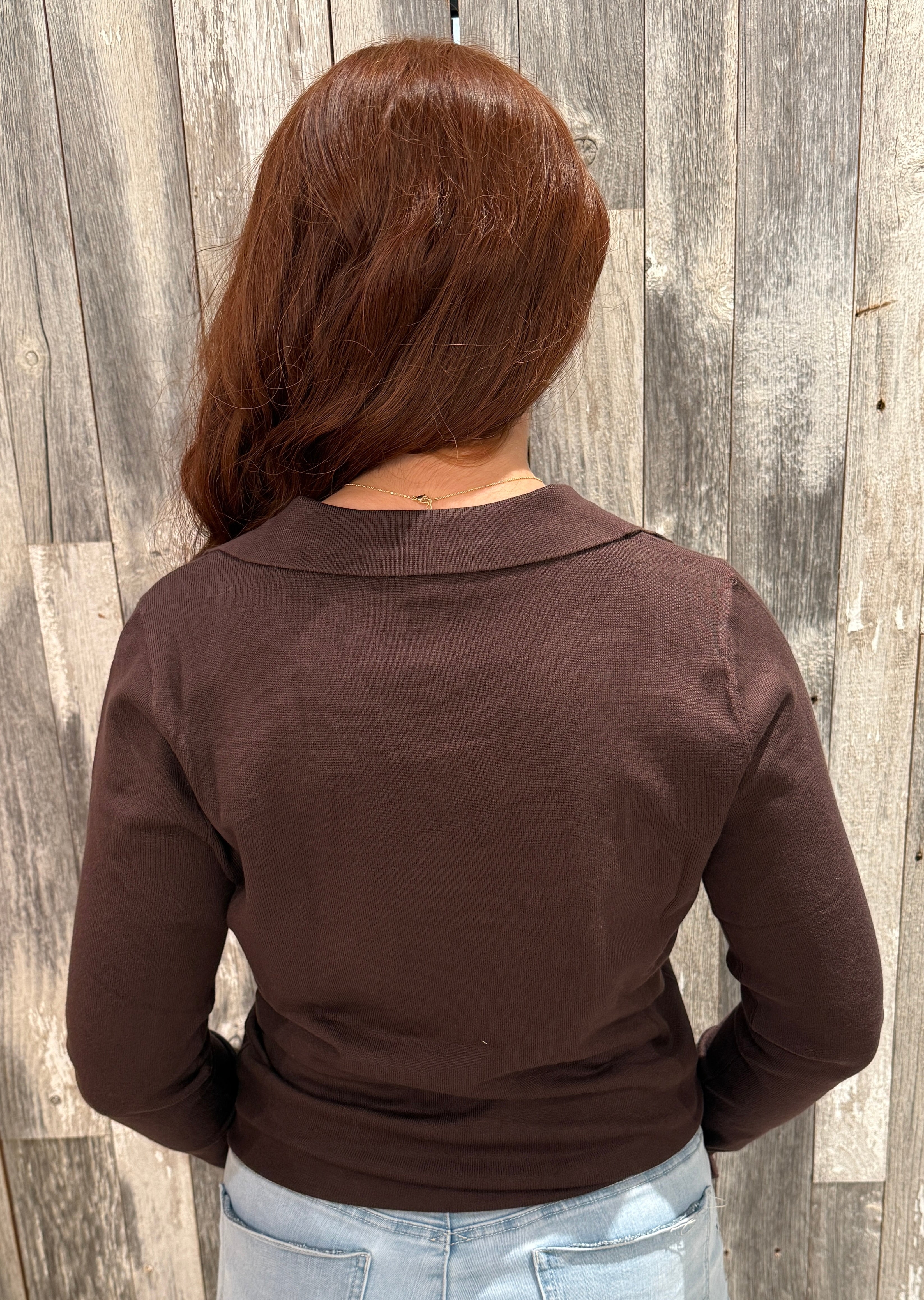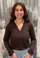 Elevate your everyday layering with this soft-knit, long sleeve top. The split polo-style collar adds a touch of refinement, while the fitted silhouette hugs just right for a flattering, sleek look. Perfect for pairing with skirts, trousers, or your favorite jeans for effortless style.