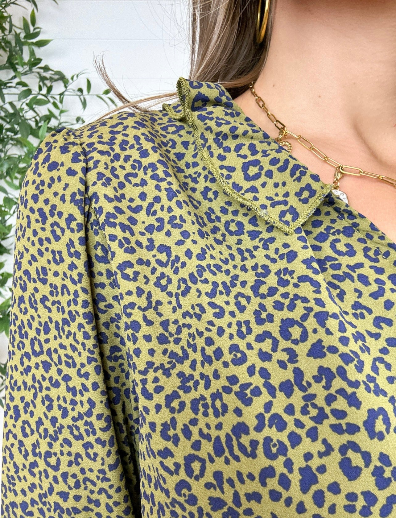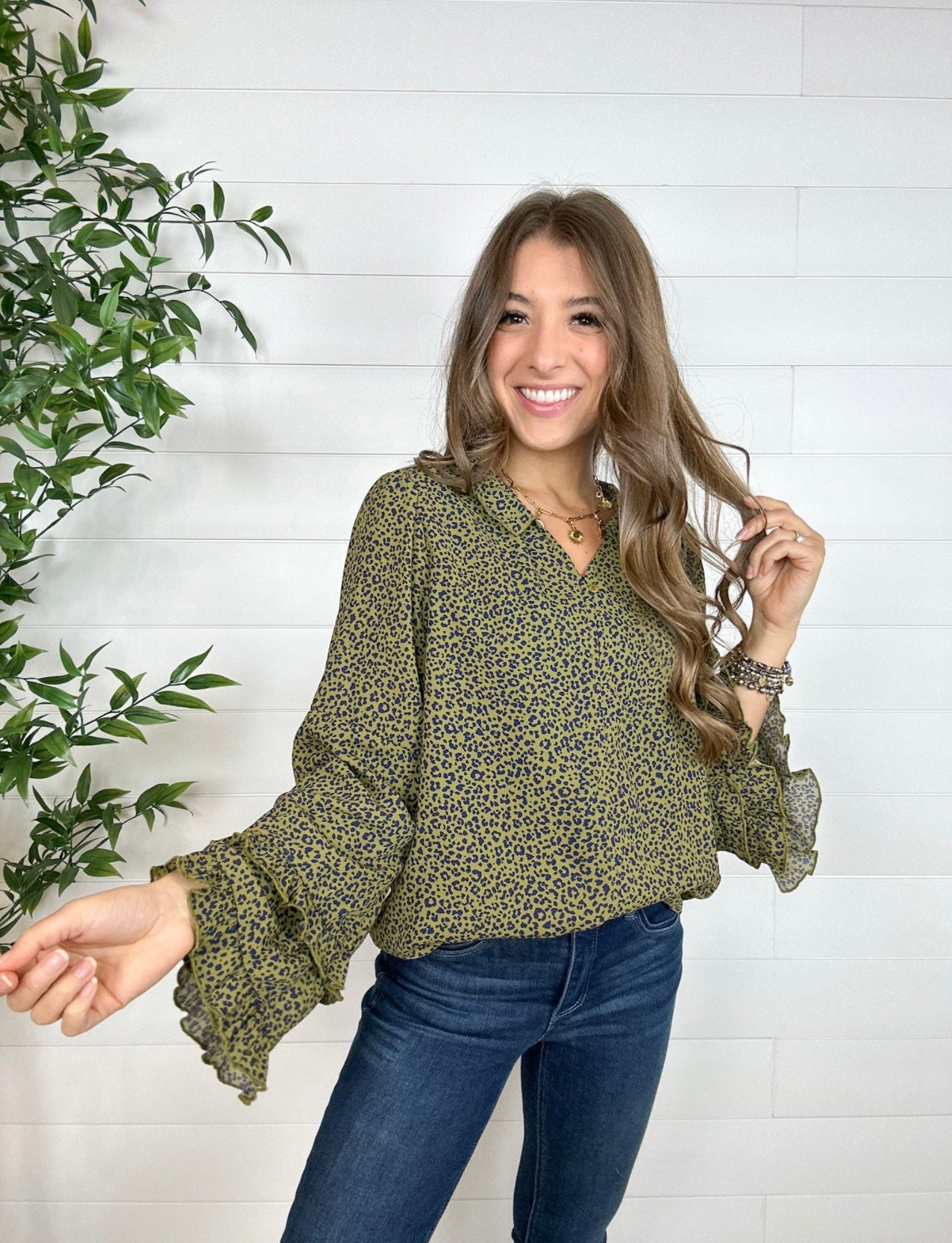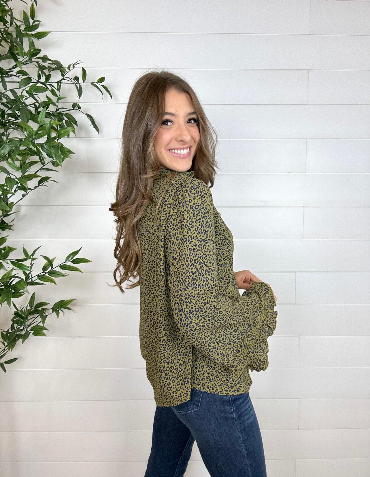 Earthy tones meet flirty details in the Micro Leopard Print Romantic Sleeve Blouse — a soft, feminine top with just the right touch of wild. The ruffle split neckline and fluttery double ruffle sleeves bring the romance, while the subtle micro leopard print adds a hint of playful edge. Perfect for dressing up denim or pairing with sleek skirts for a night out.
