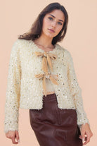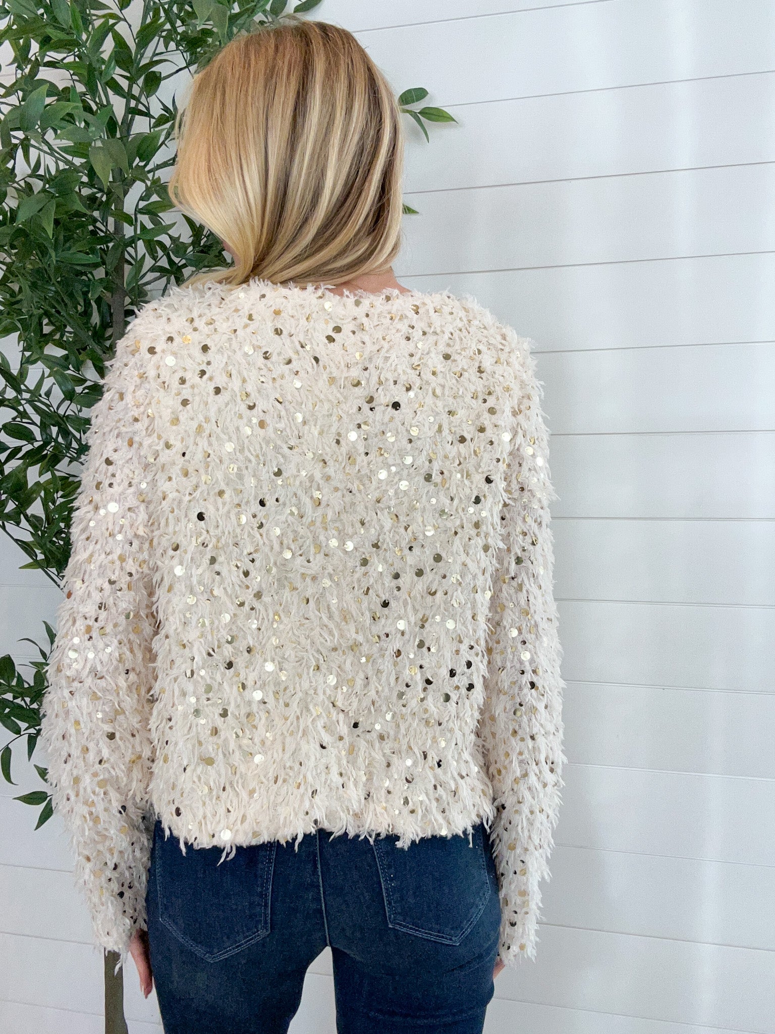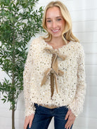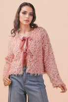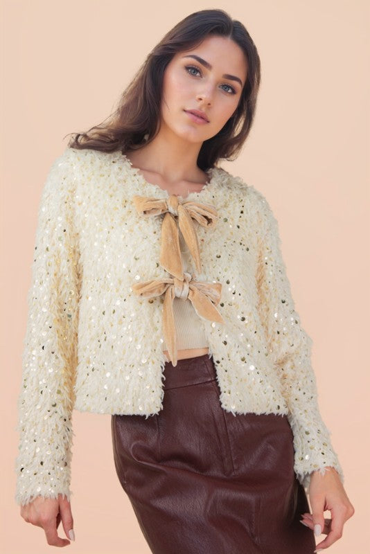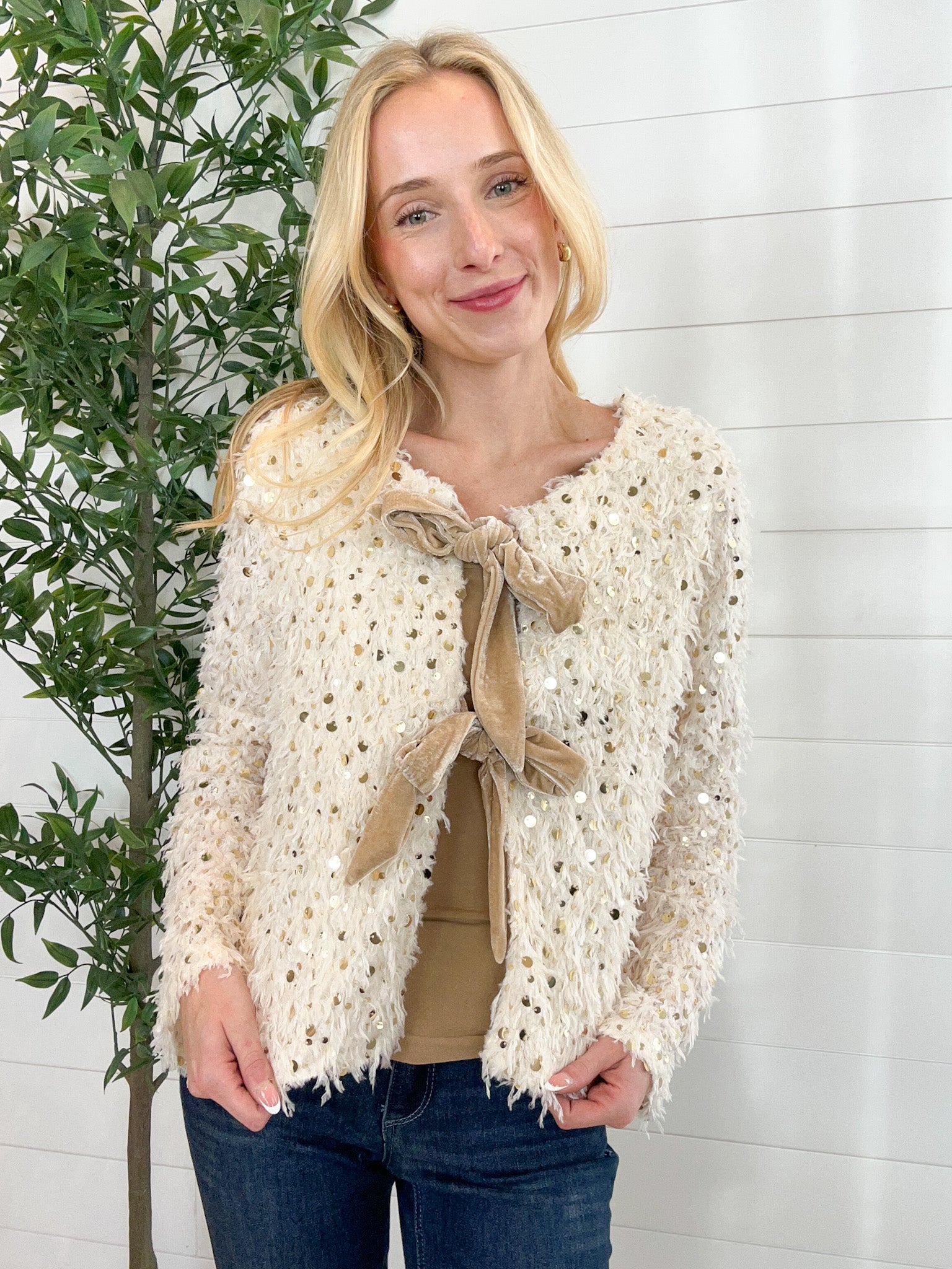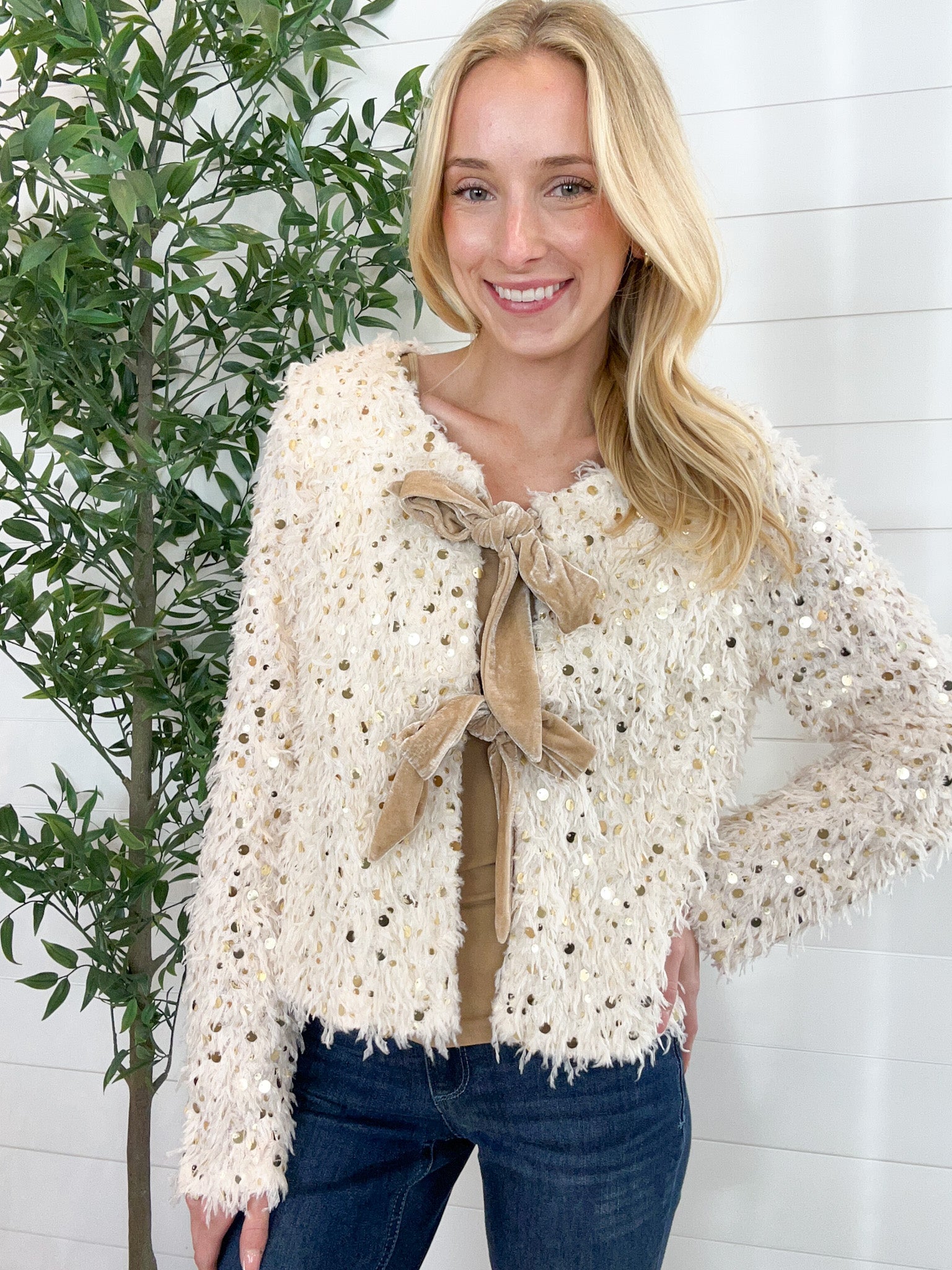 The Velvet Tie Sequin Sweater is pure holiday magic! This dreamy piece combines tonal sequins with a plush, furry knit that feels as luxe as it looks. The front velvet tie closure adds a touch of romance, while the glimmering finish brings festive glamour to any outfit. Whether you’re dressing up for a special occasion or just feeling extra sparkly, this statement sweater is ready to shine.