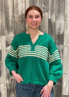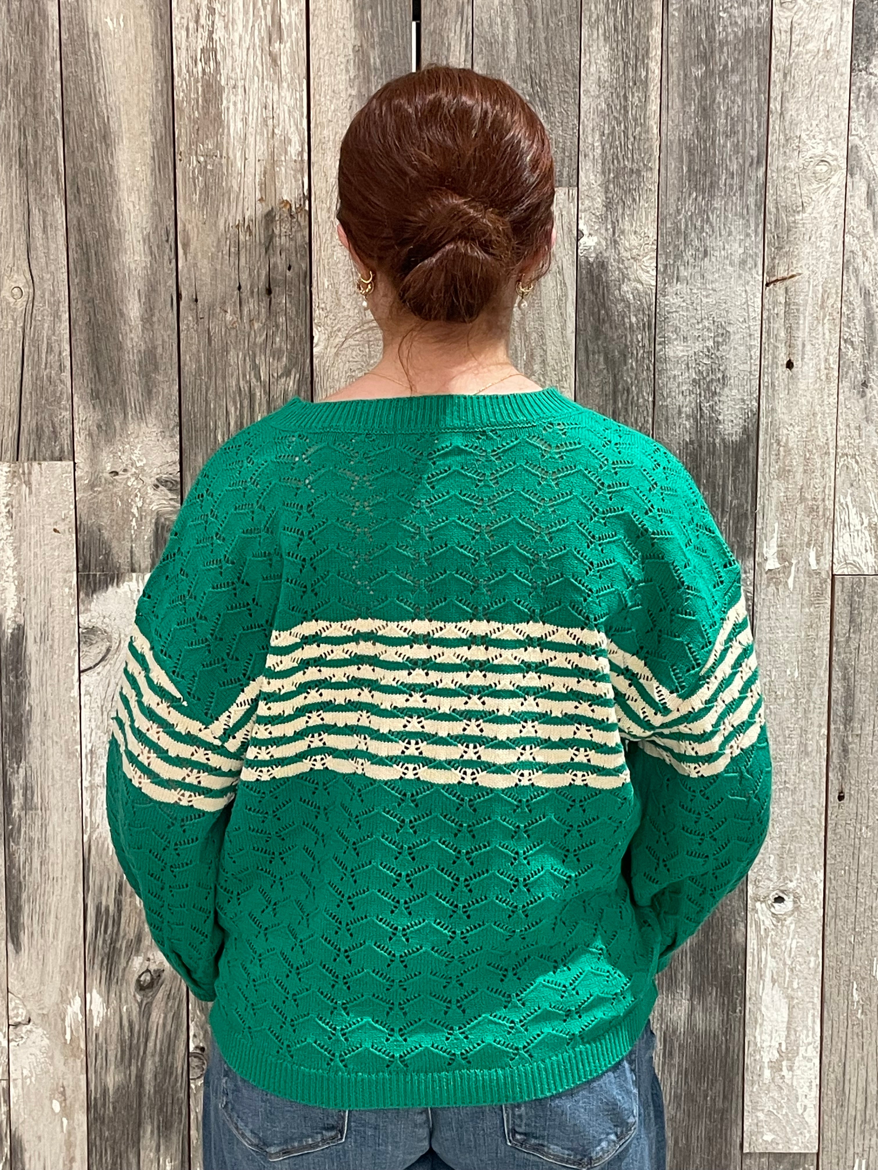 This knit sweater blends classic stripes with delicate texture for the perfect mix of sporty and chic. Designed with a flattering V-neckline and relaxed silhouette, it features subtle open-knit detailing that adds dimension and interest. The contrast stripe accents give it that timeless, collegiate-inspired feel while still keeping the look fresh and modern.