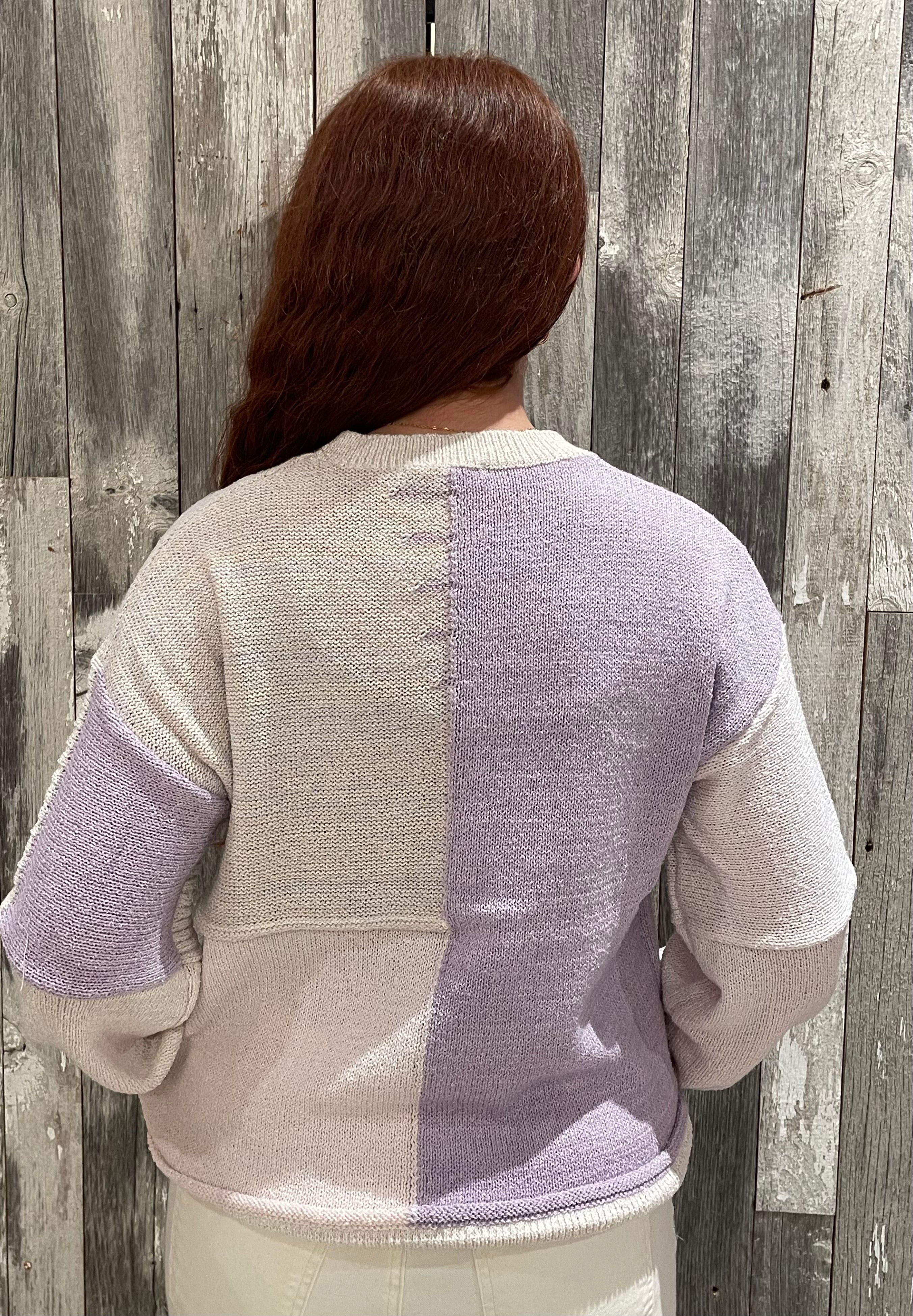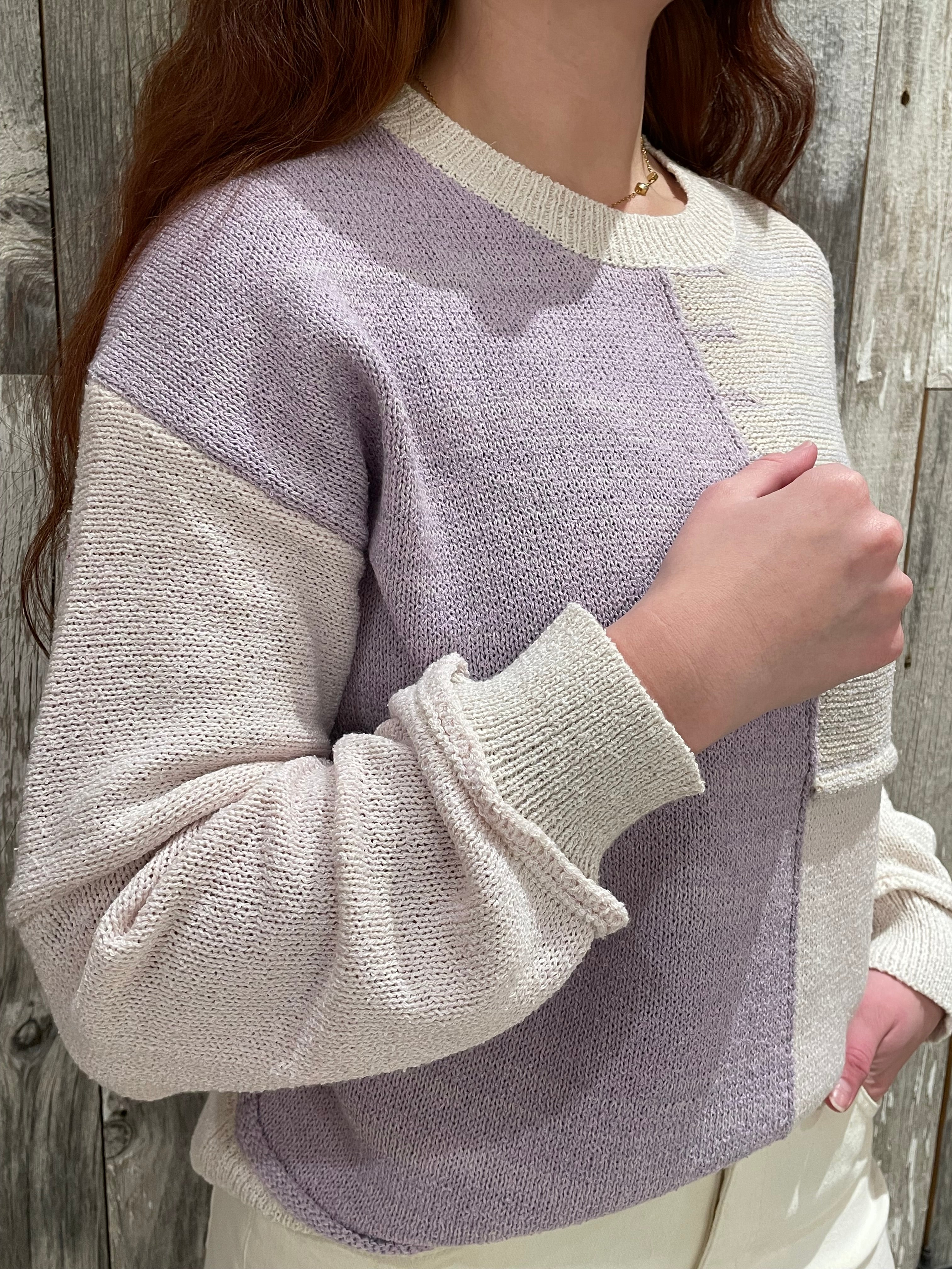 This mixed-weave color block sweater is the perfect blend of cozy and feminine. The airy knit feels light and effortless, while the soft lilac, cream, and blush palette brings a fresh, pretty touch to any day. With gentle textured weaves throughout and subtle bubble sleeves for a hint of volume, it’s an easygoing pullover that still feels special. Relaxed, breathable, and endlessly wearable—your new go-to for everyday charm.