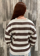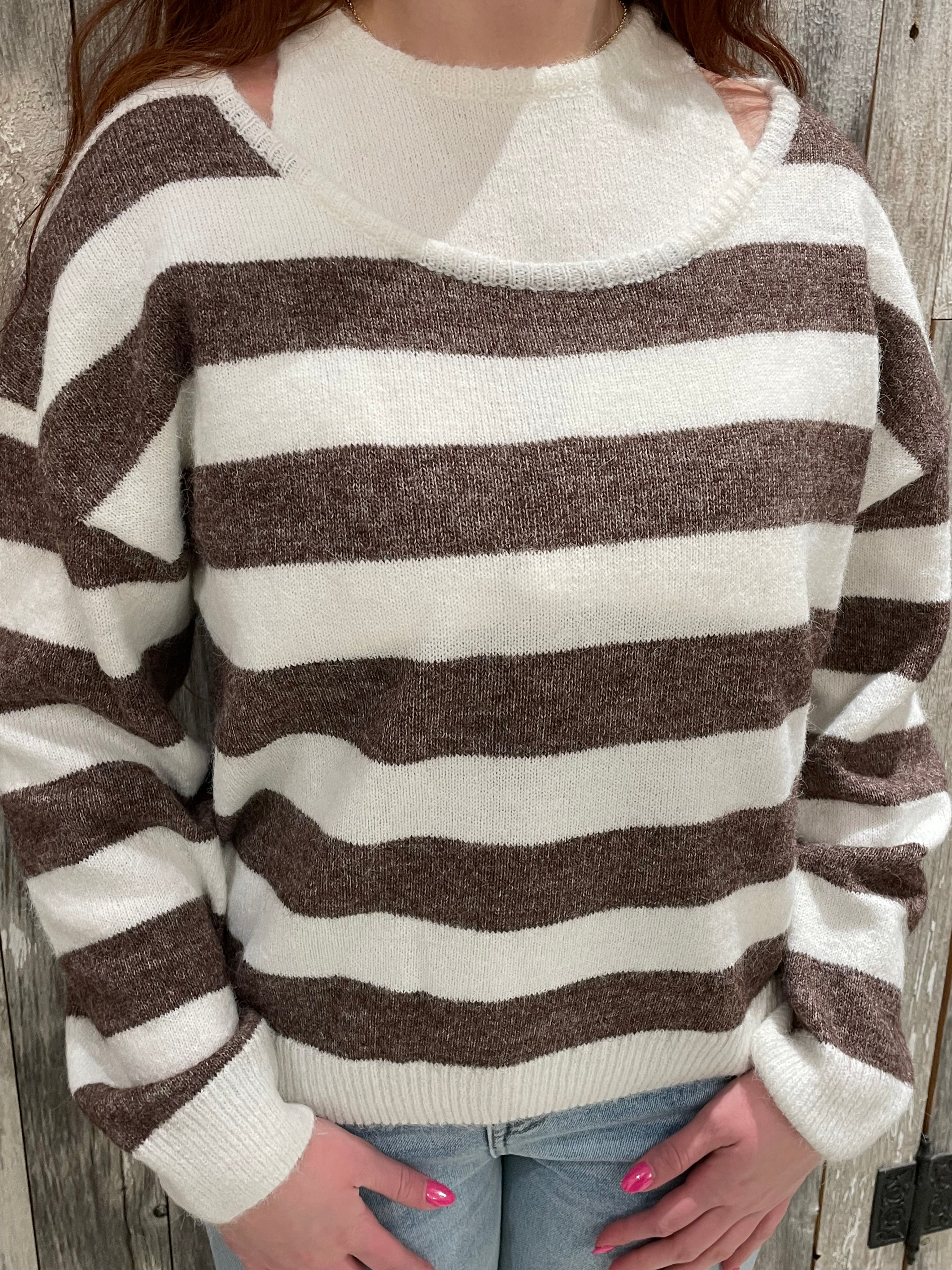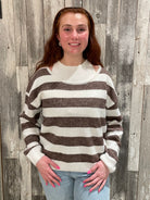 This soft striped sweater puts a fresh twist on a classic silhouette with subtle cutout accents at the neckline. Comfortable, relaxed, and effortlessly stylish, it’s the kind of knit you’ll reach for again and again.