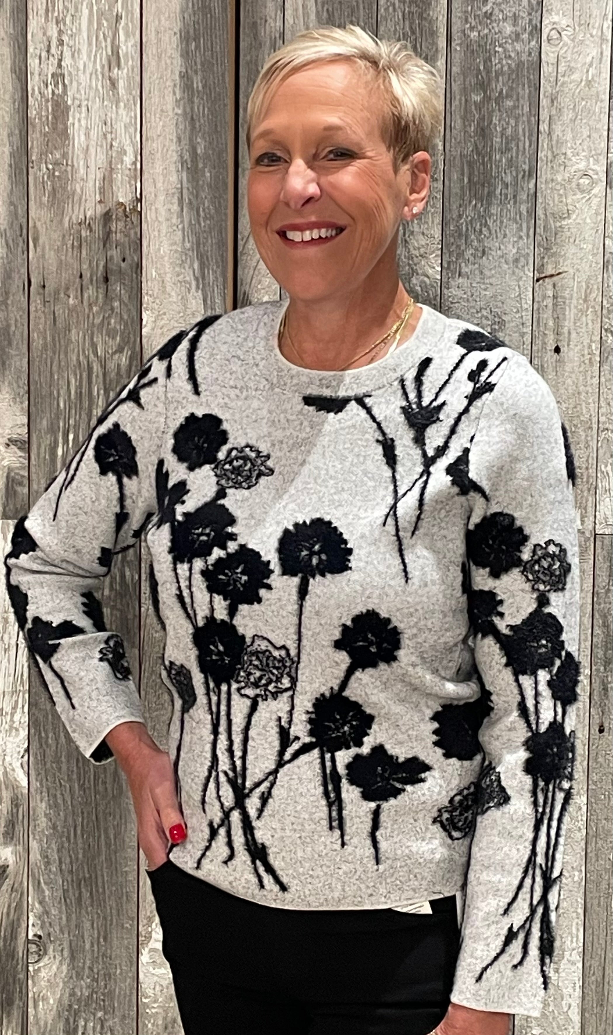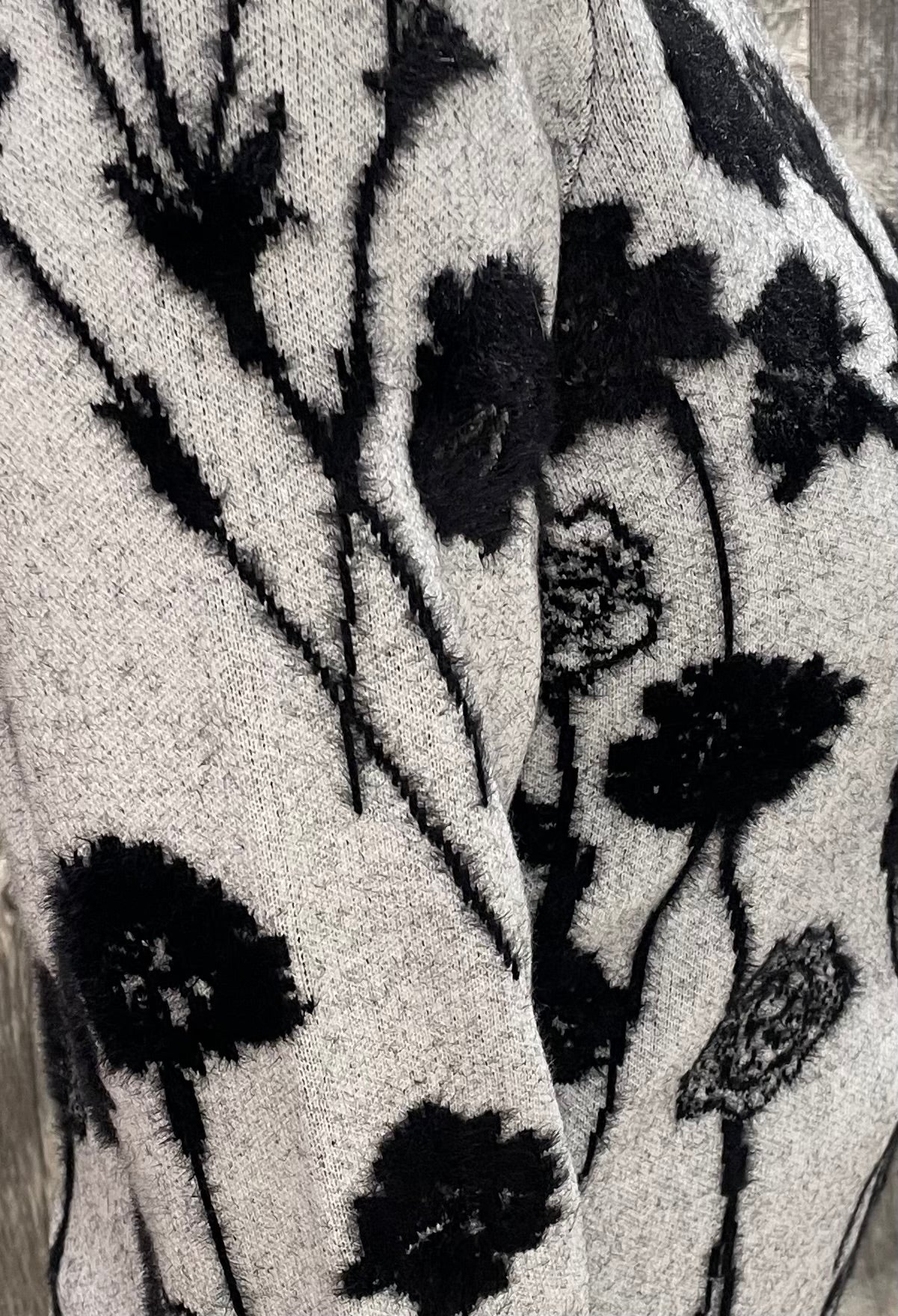 • Bold floral motif with textured/raised detailing across front and sleeves
