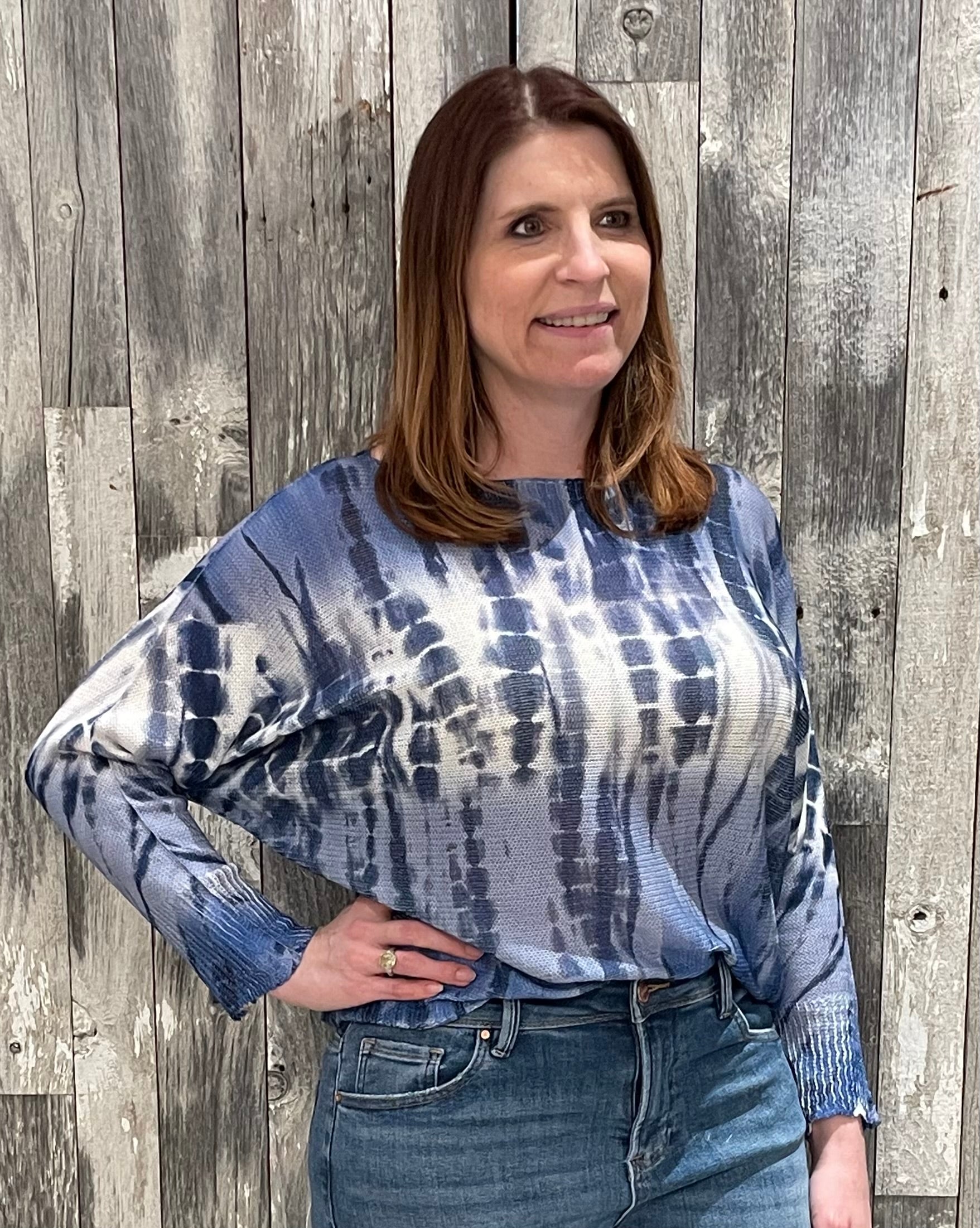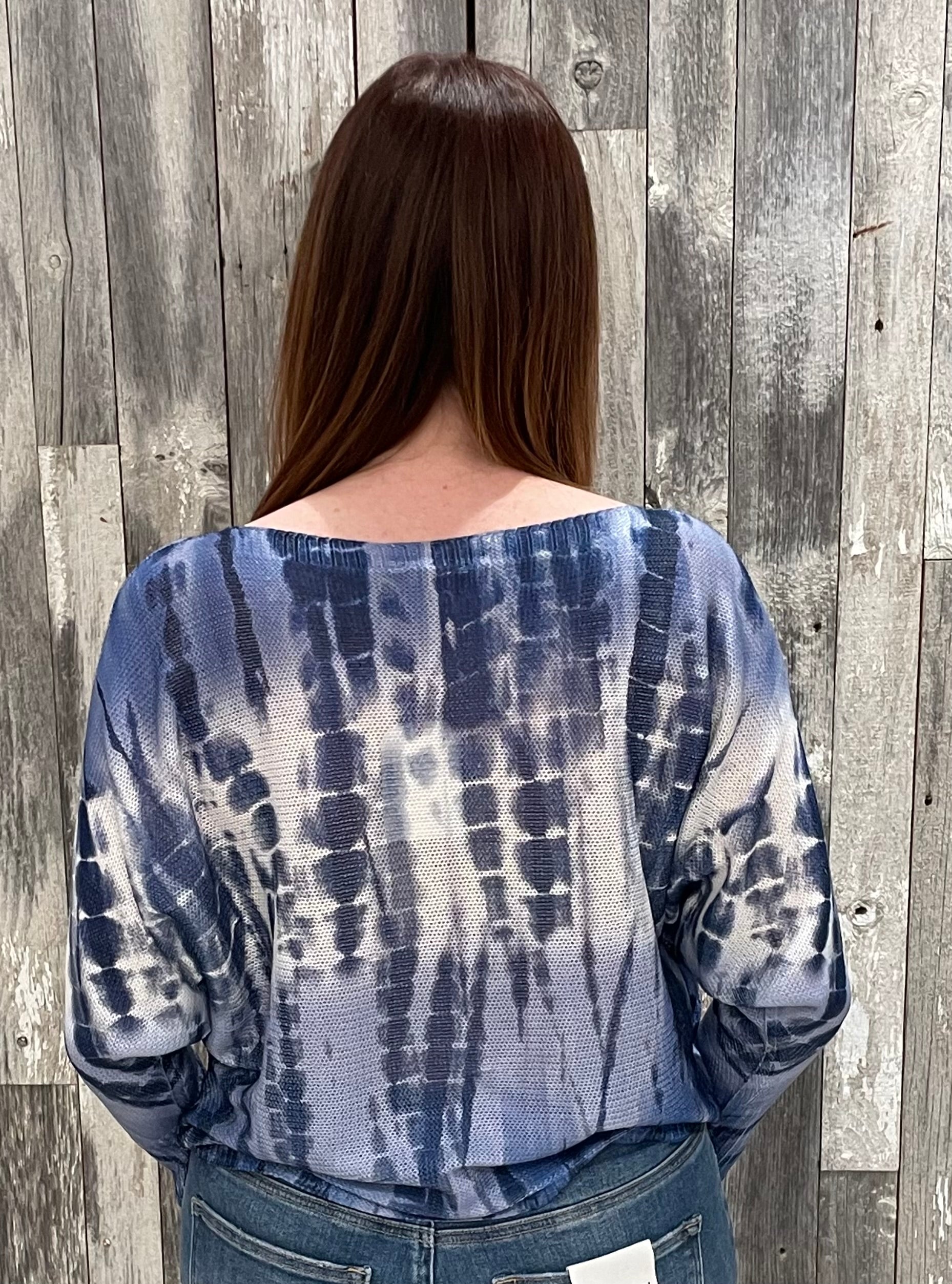 Effortlessly relaxed and stylish, this printed knit top features a modern batwing silhouette that creates beautiful drape and movement. The soft blue tie-dye inspired print adds visual texture while the lightweight knit fabrication keeps it comfortable and breathable