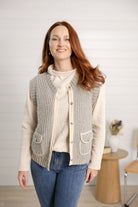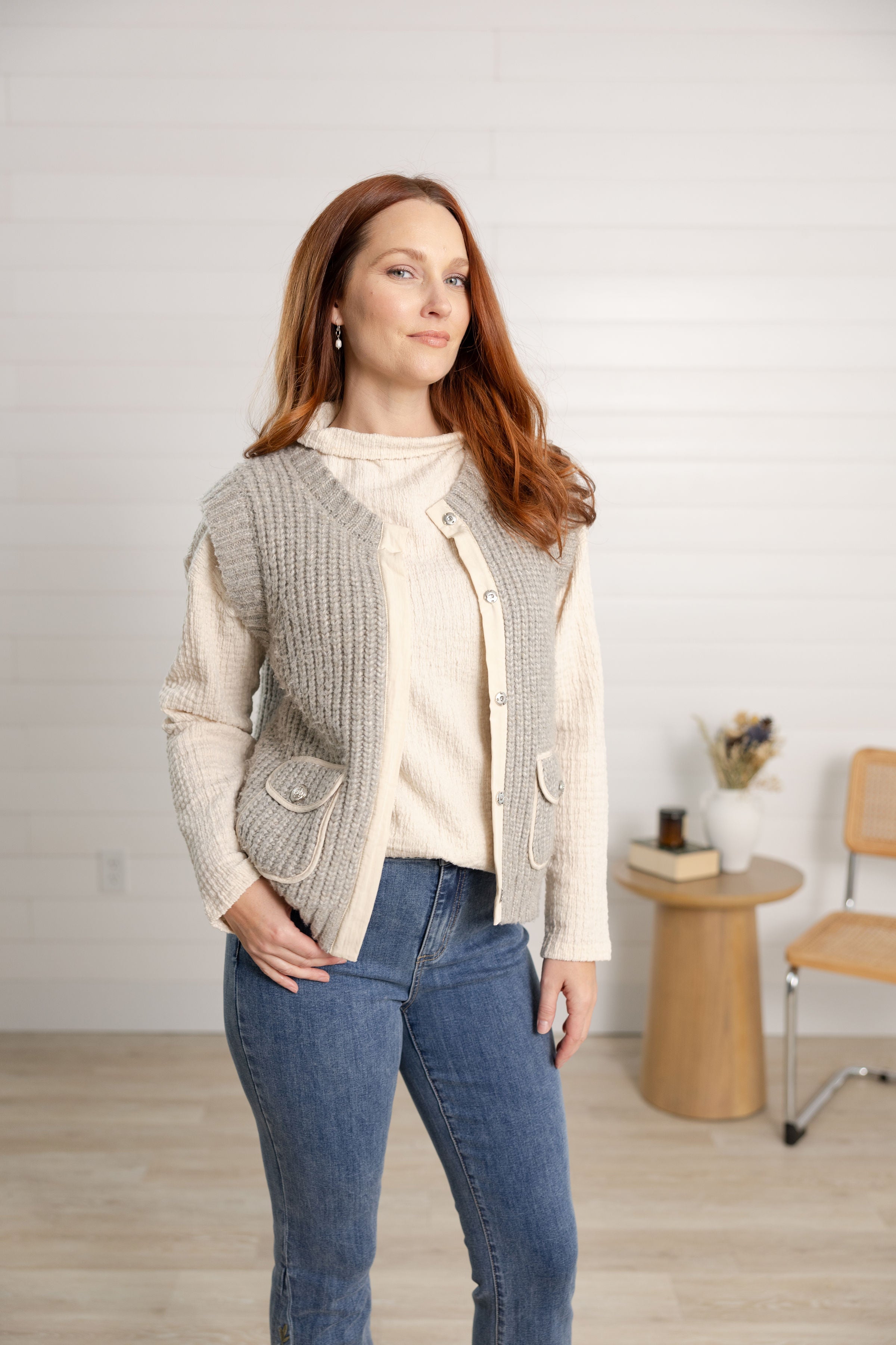 Add dimension and style to any outfit with the MB Sleeveless Knit Vest. Designed collarless for easy layering, it features contrast piping along the pockets and down the placket, giving subtle polish to a cozy, versatile silhouette. Perfect for pairing over tees, blouses, or dresses for an elevated look.