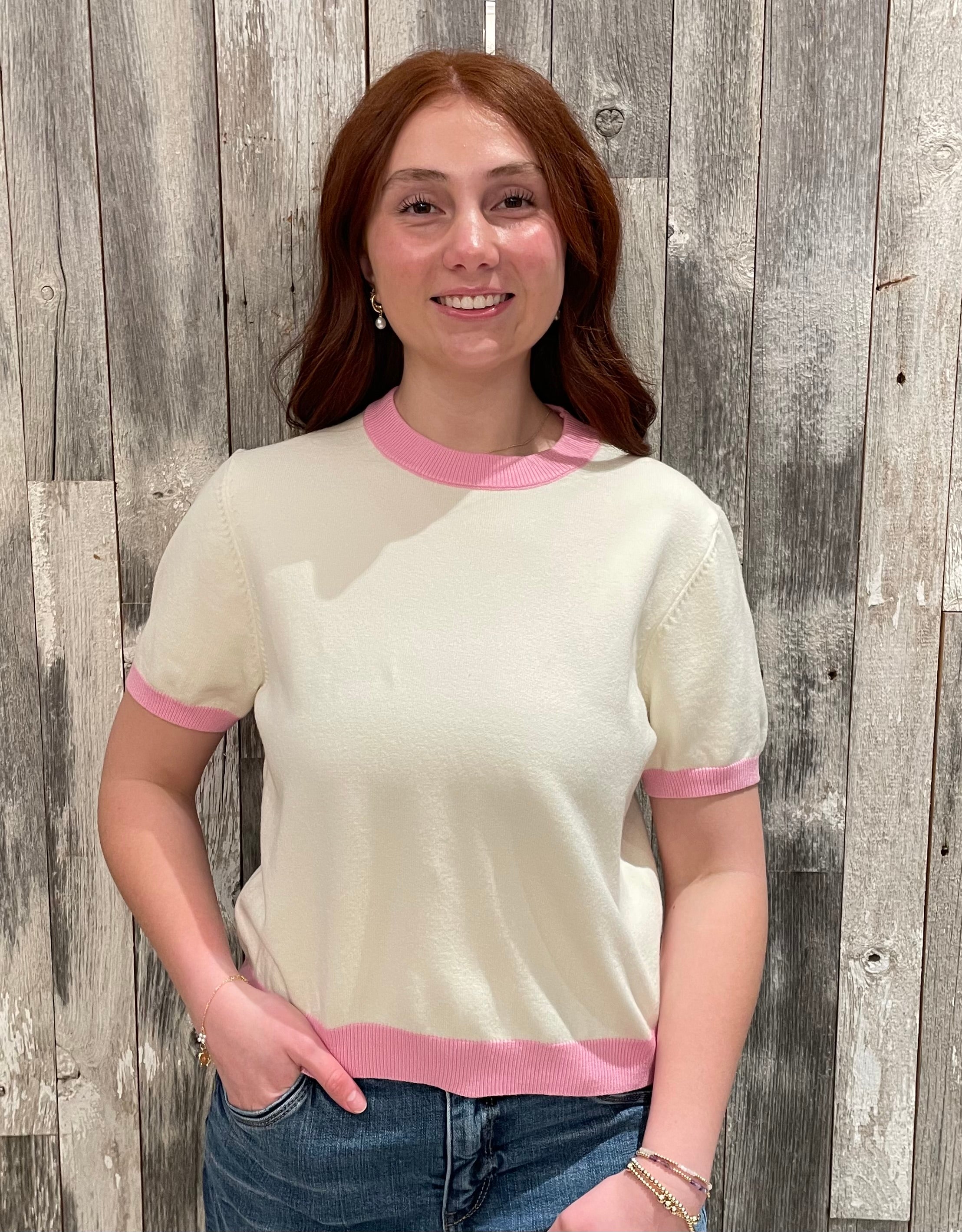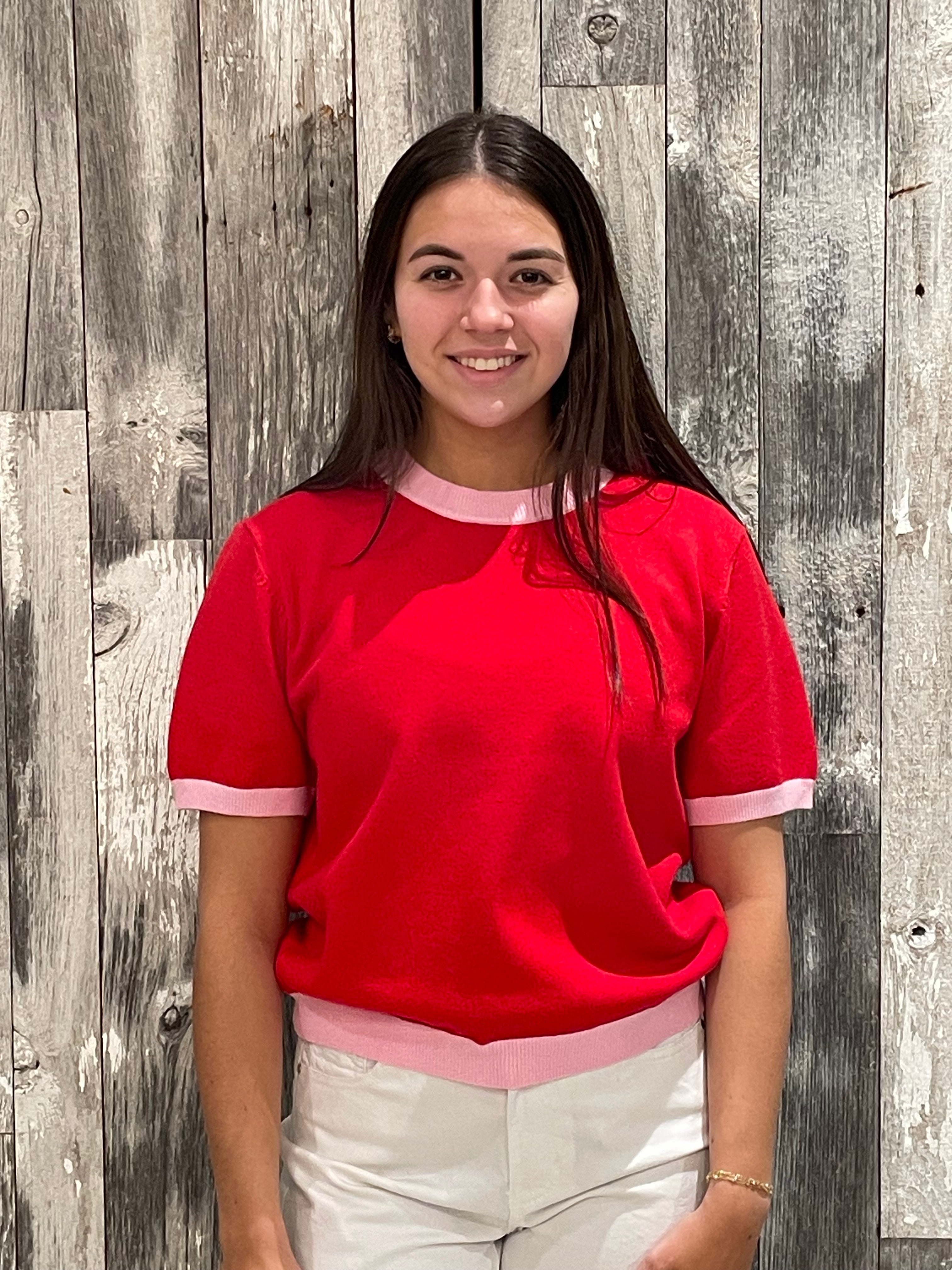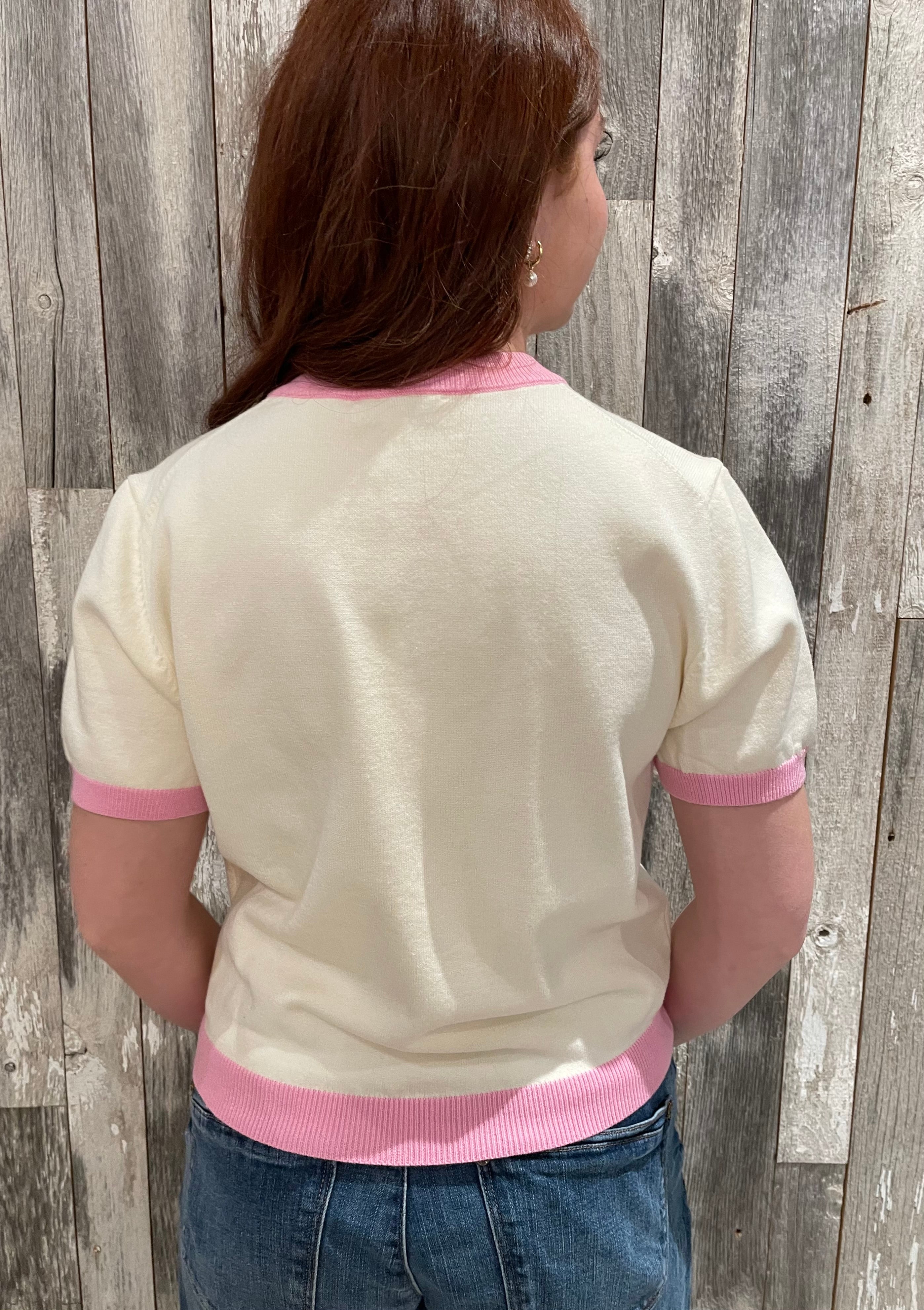 This short-sleeve sweater top brings a playful nod to vintage style with clean, modern polish. Designed with a soft knit body, contrast ribbed trim, and a relaxed silhouette, it’s an easy piece that feels both fun and effortlessly put-together.