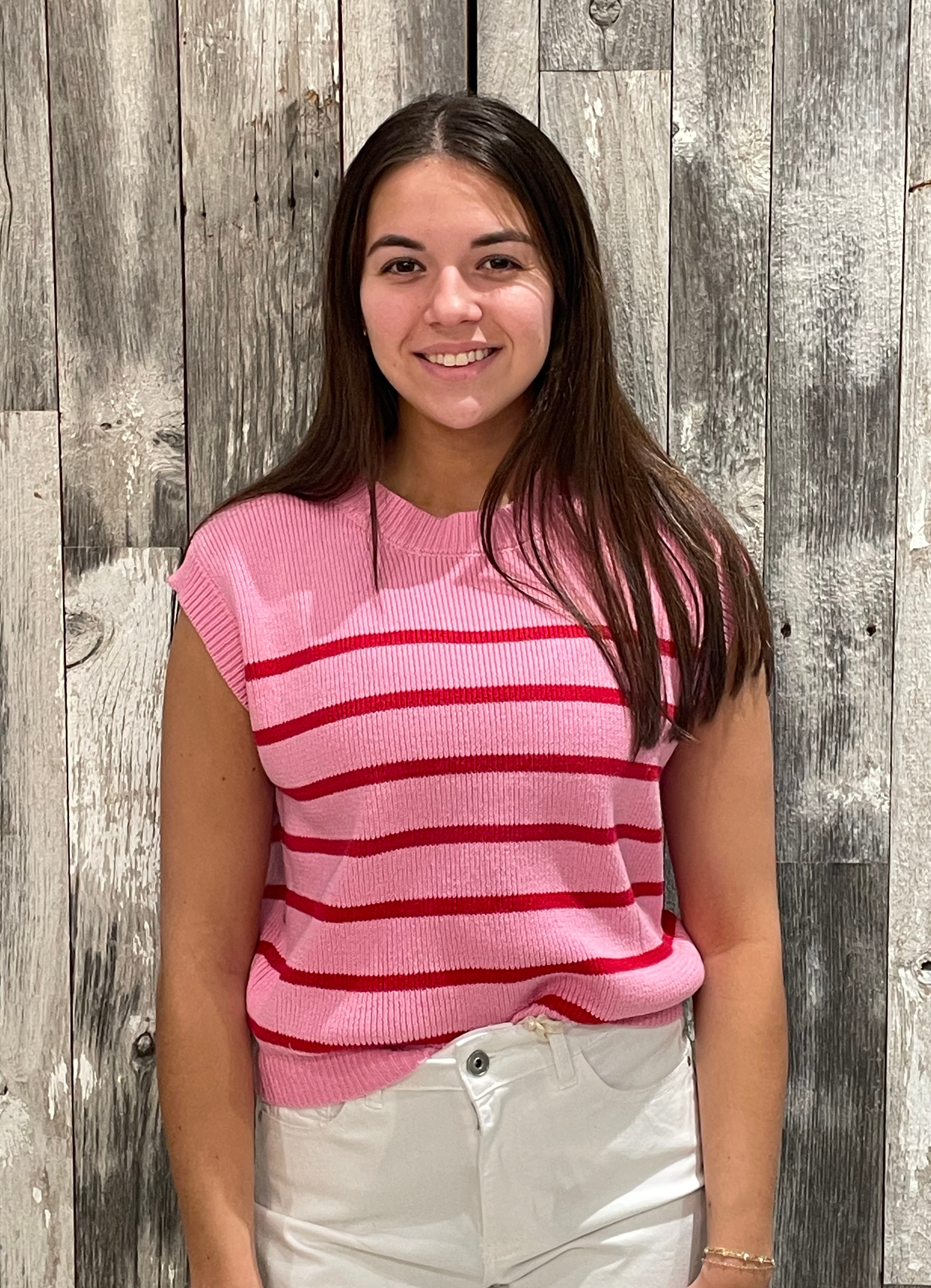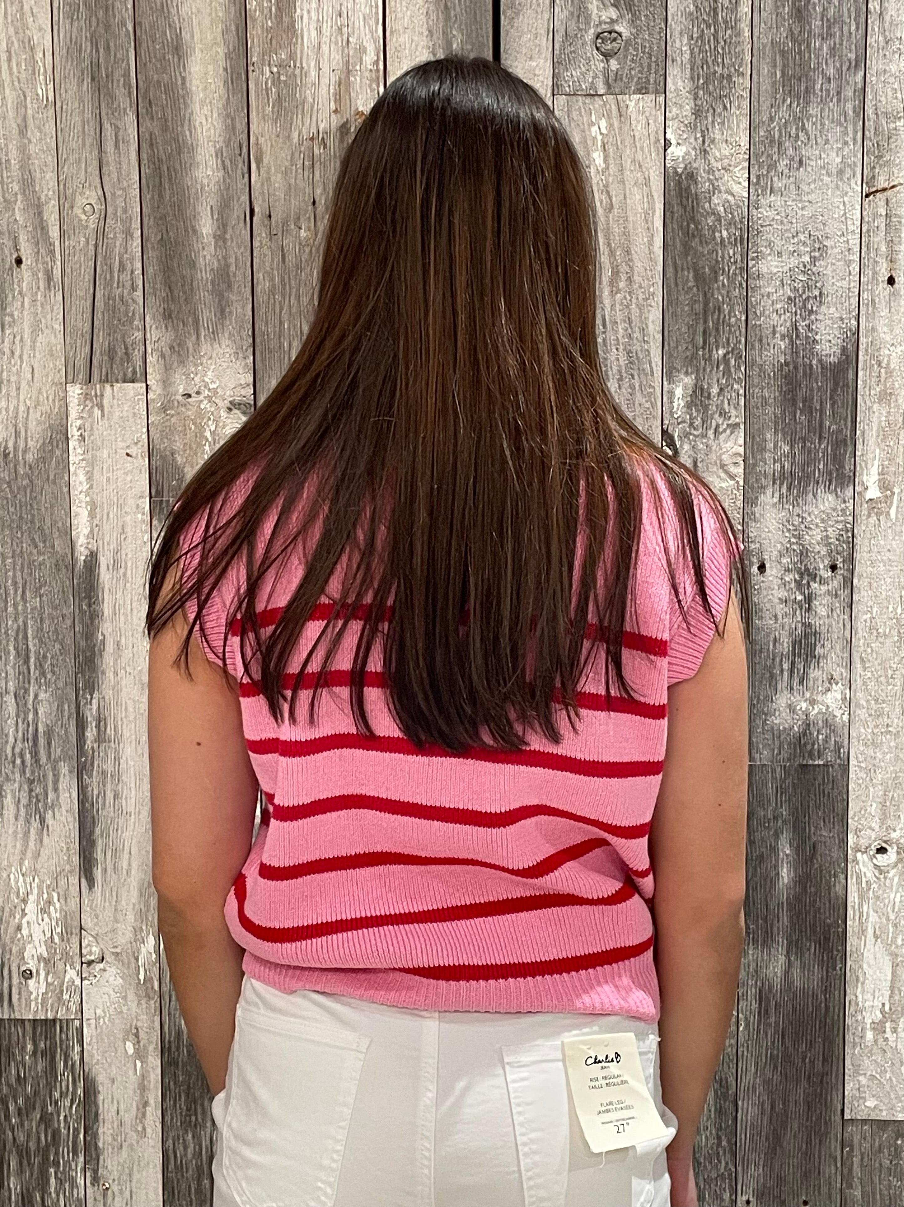 This sleeveless knit sweater brings a playful pop to your everyday wardrobe with its bold stripe design and comfy, flattering fit. Soft, stretchy, and easy to wear, it’s the perfect piece for warm days or layering into cooler seasons.