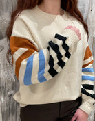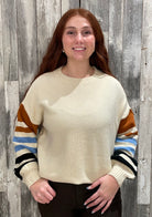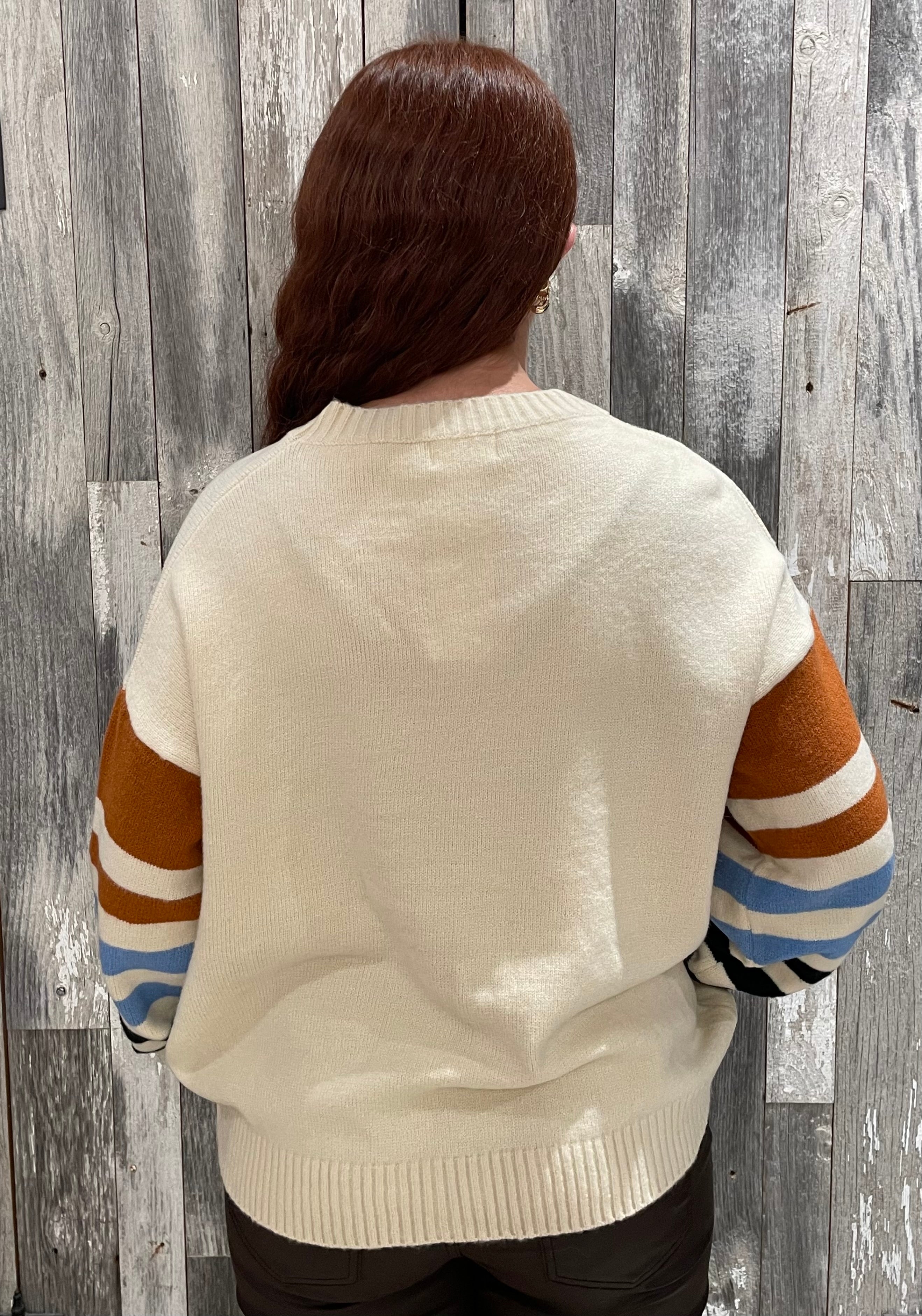 Color/Pattern: Solid oatmeal body; sleeves with bold stripes in rust, cream, black, tan, and sky blue