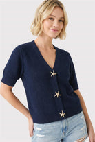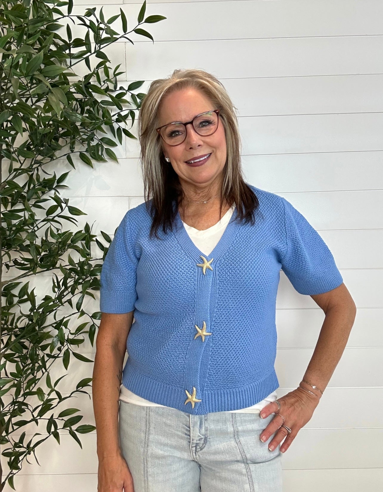 The Textured V-Neck Short Sleeve Starfish Cardigan is bringing all the breezy, beachy vibes — and we’re obsessed. Featuring a soft textured knit and the sweetest starfish detail, this lightweight cardigan is equal parts fun and polished. The flattering V-neckline and short sleeves make it perfect for layering now and wearing solo later. It’s that standout statement knit that still feels totally wearable.