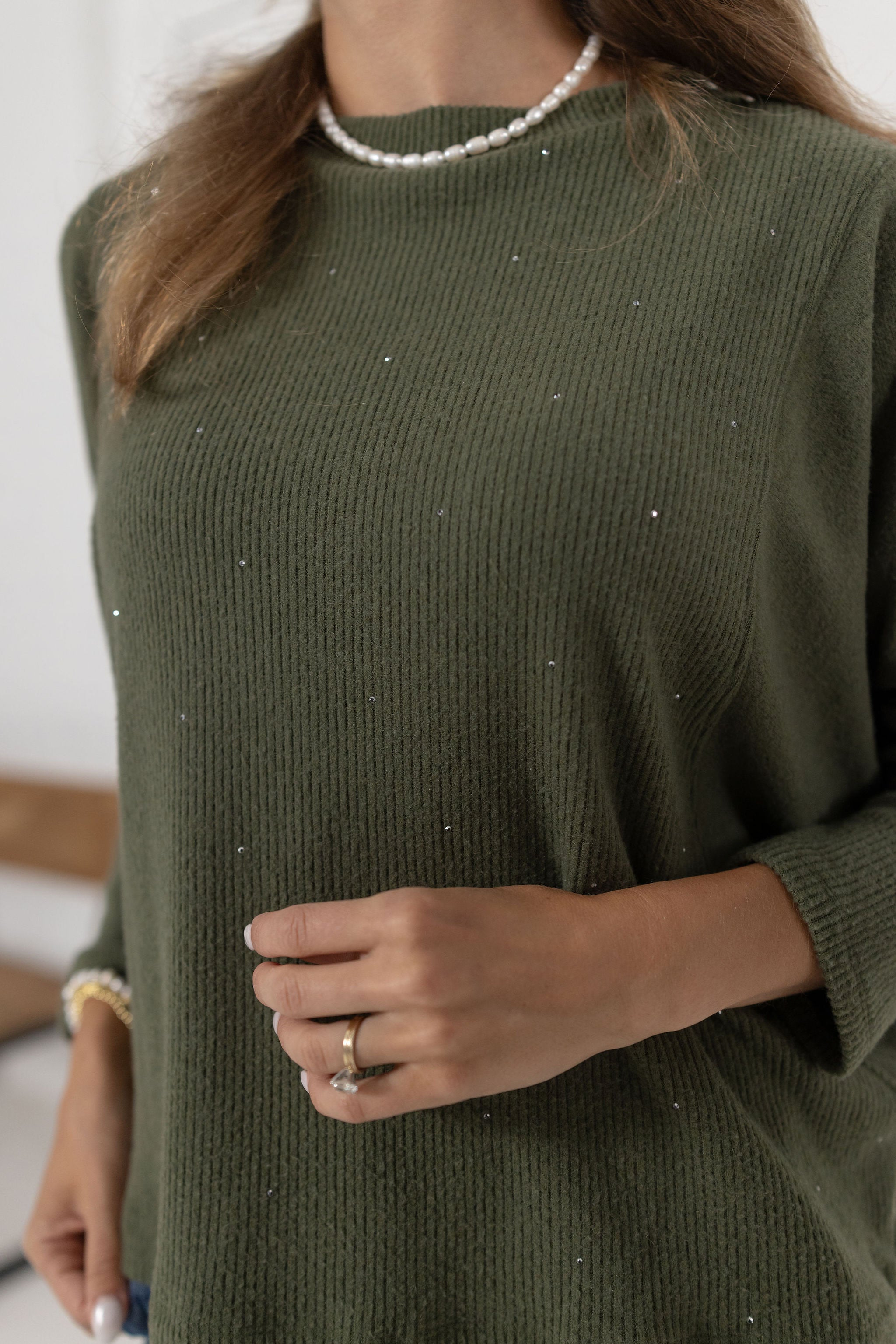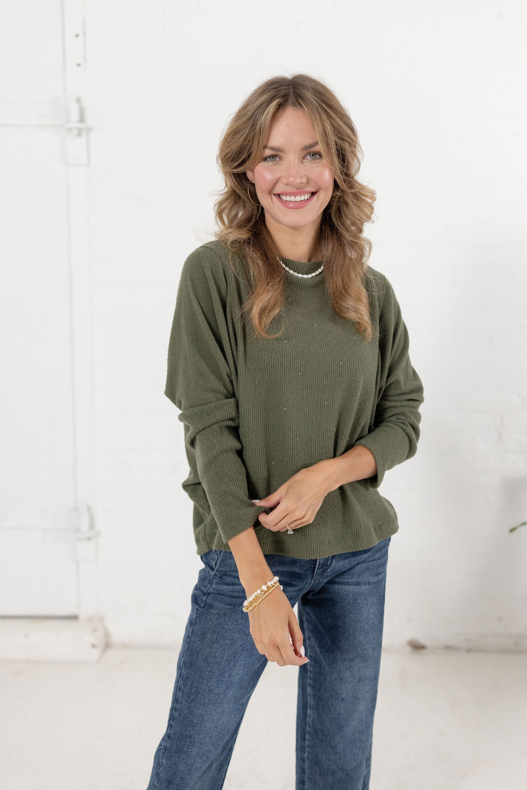Batwing Mock Neck Mixed Media Rhinestone Top